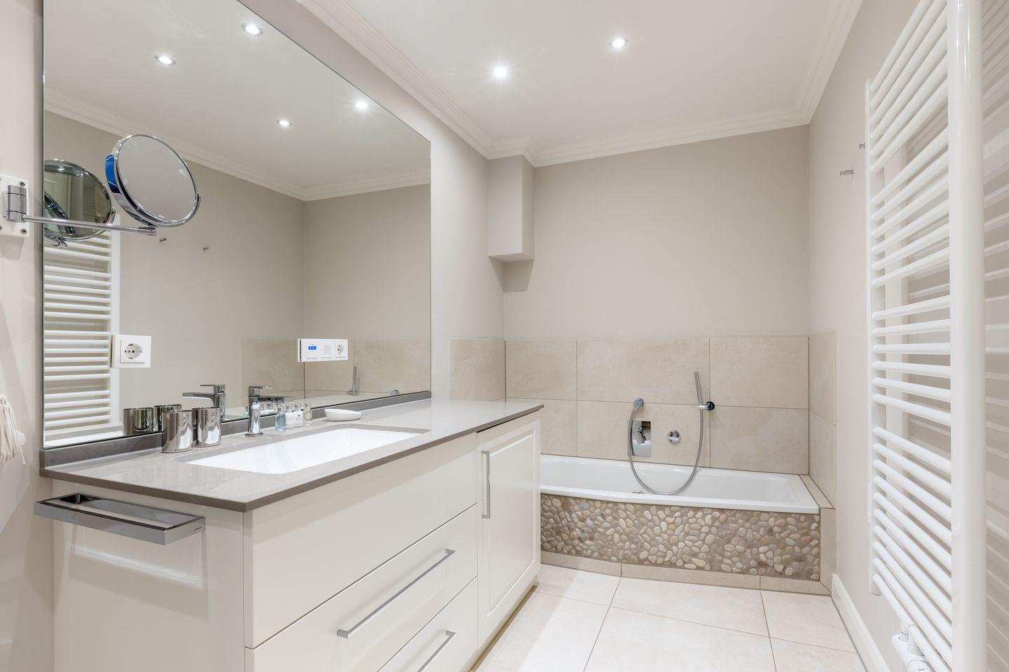 Der Master-Bedroom bietet ein Doppelbett mit den Maßen 1,80 x 2 m, das zweite Zimmer hat zwei getrennte Betten von je 90 cm x 2 m. In beiden Zimmern finden Sie eine kleinere Ausgabe des Stereo-Musiksystems aus dem Wohnbereich mit identischen Funktionen vor. Der größere Raum verfügt zudem über ein eigenes TV-Gerät. Der Stauraum sowie die Schrankfläche sind großzügig bemessen.? Nur kurz Abbrausen oder Wellness-Baden? Sie haben die Wahl! Ausgestattet mit ebenerdiger Dusche, Badewanne, Luxus-Waschtisch sowie WC finden Sie im an die Räume angrenzenden Badezimmer für jeden Geschmack das Passende vor.
