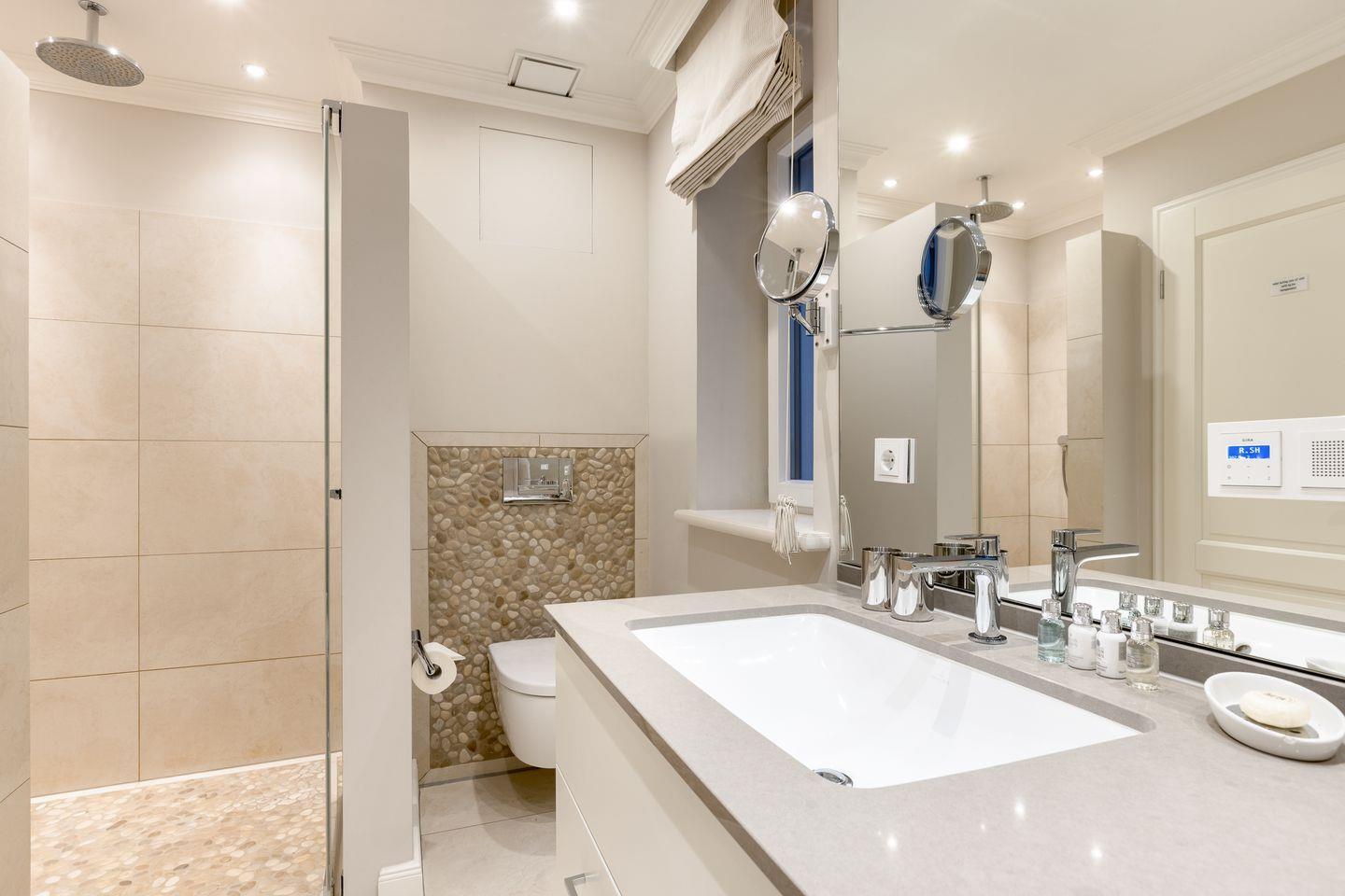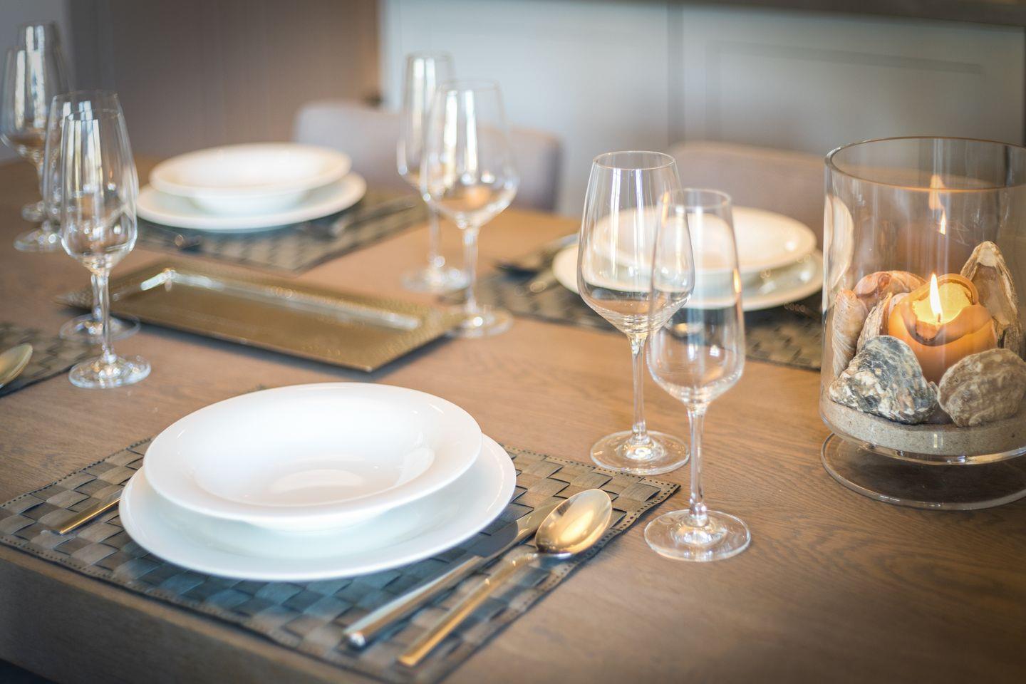 Der großräumige helle Wohnbereich mit Blick auf die eigene Terrasse geht in eine exklusive Essgruppe und die offene Küche über. Wenn Sie fernab vom Alltagsstress Ihren Talenten als Chef de Cuisine frönen wollen – das passende Equipment steht in Form modernster Miele-Geräte bereit: Induktionsherd, Mikrowelle, Backofen und Geschirrspüler. Zum Dessert ein Espresso aus der Nespresso-Maschine gefällig? Et voilà!