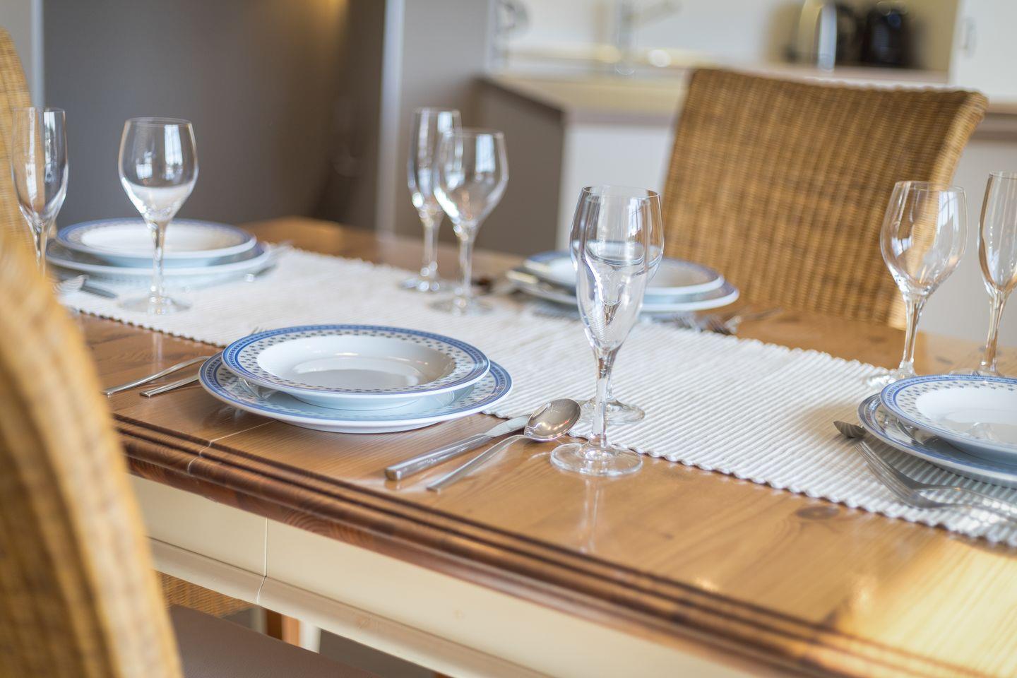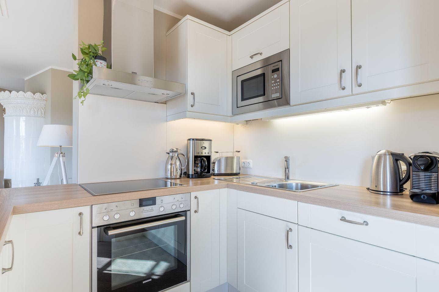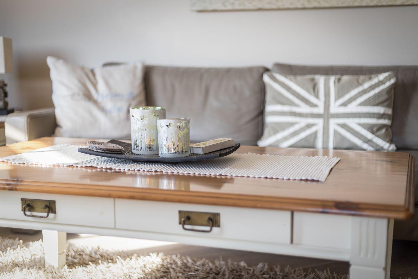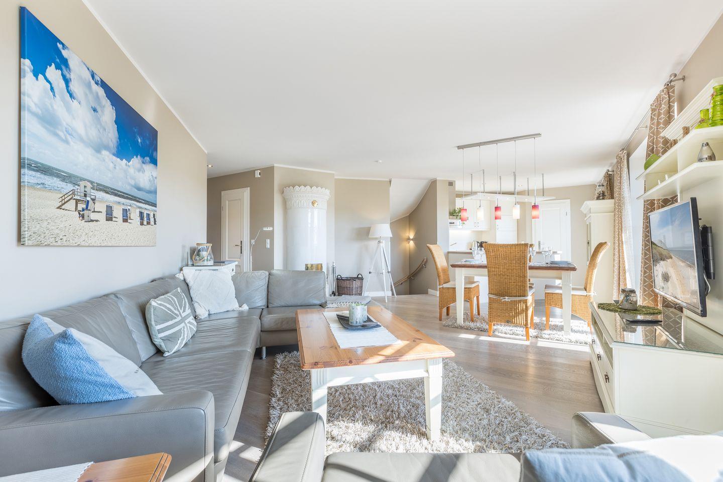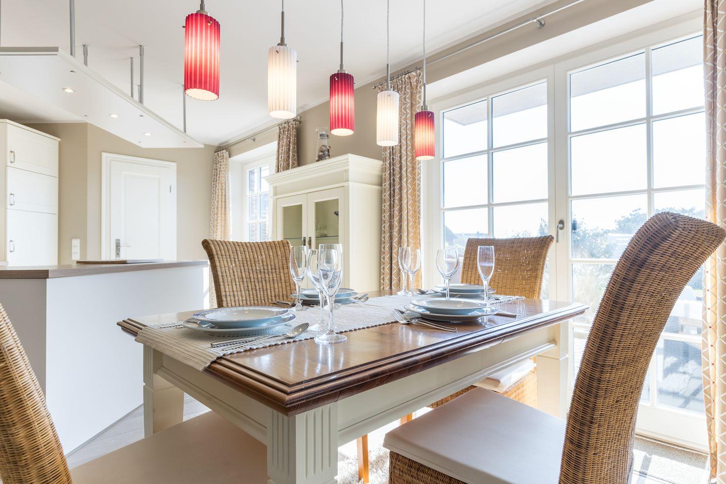 Im Erdgeschoss der Wohnung Föhr befindet sich ein großzügiger Wohnraum mit gemütlicher Wohnlandschaft,3D Flatscreen-TV, Kachelofen und Essbereich. Von hier aus gelangen Sie auf die Terrasse und in den Garten, der von April bis Oktober mit Strandkorb und Gartenmöbeln möbliert ist. Die offene Küche ist geschickt als Raumtrenner eingebaut und bietet Ihnen so die Möglichkeit, gleichzeitig bei Ihren Liebsten zu sein und das Urlaubsfrühstück oder Dinner vorzubereiten. Die Küche ist mit Backofen, Mikrowelle, Spülmaschine und zwei Kaffeemaschinen top ausgestattet, sodass es Ihnen an nichts fehlen wird.