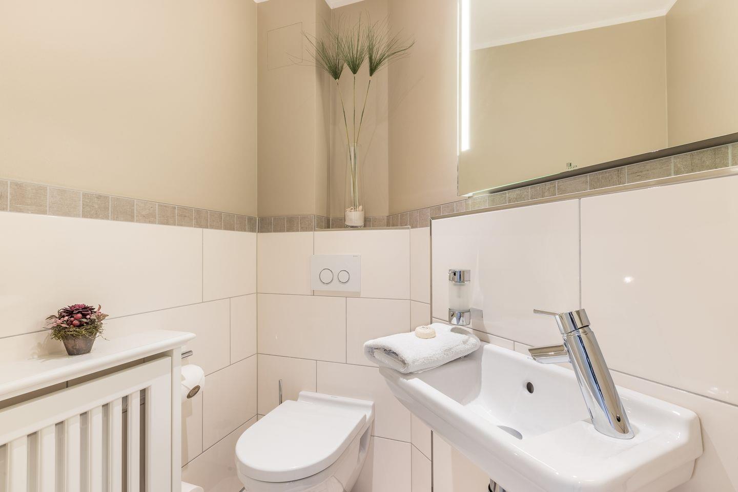 Im Untergeschoss der Wohnung finden Sie zwei Schlafzimmer mit je einem Doppel-Boxspringbett (180x200cm) und je einem Flatscreen-TV. Außerdem befindet sich hier das Badezimmer mit Fußbodenheizung, Badewanne, Dusche und WC und ein weiteres Gäste-WC.