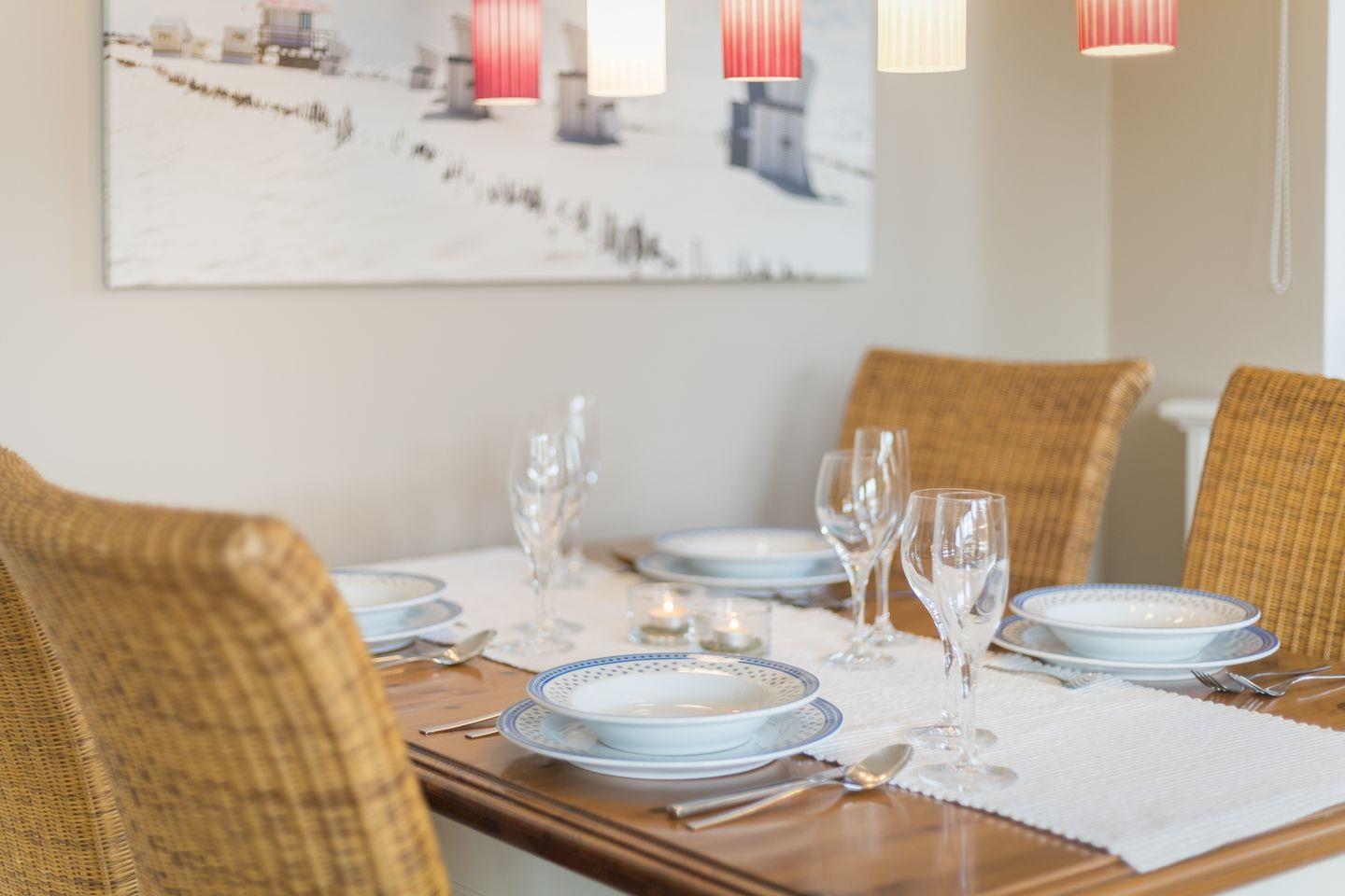 Im Erdgeschoss der Wohnung Amrum befindet sich der Wohnraum mit Couchbereich, 3D Flatscreen-TV, Kachelofen und Essbereich. Von hier aus gelangen Sie auf die Terrasse und in den Garten, der von April bis Oktober mit Strandkorb und Gartenmöbeln möbliert ist. Die moderne und helle Küche ist mit Backofen, Mikrowelle, Spülmaschine und Nespresso-Kaffeemaschine top ausgestattet, sodass es Ihnen an nichts fehlen wird.