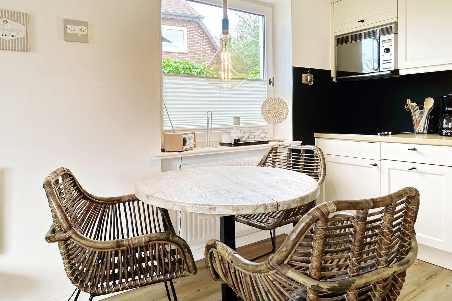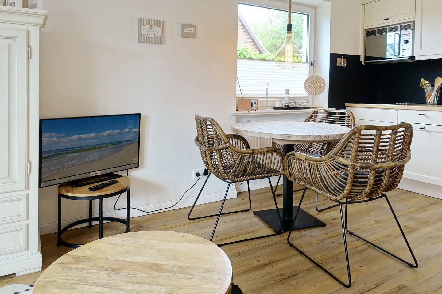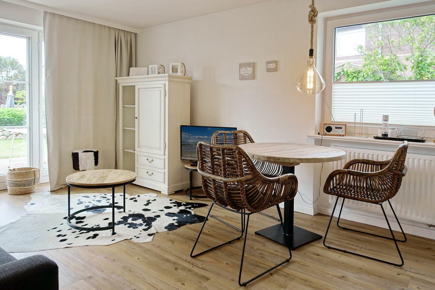 Der Wohnraum ist hell und modern ausgestattet mit einer Couch, einem Essbereich für bis zu drei Personen und einer offenen Küchenzeile, die sehr gut ausgestattet ist. Vom Wohnraum aus erreichen Sie Ihre eigene Terrasse, die von April bis Oktober möbliert ist und den Blick auf den kleinen Garten freigibt.