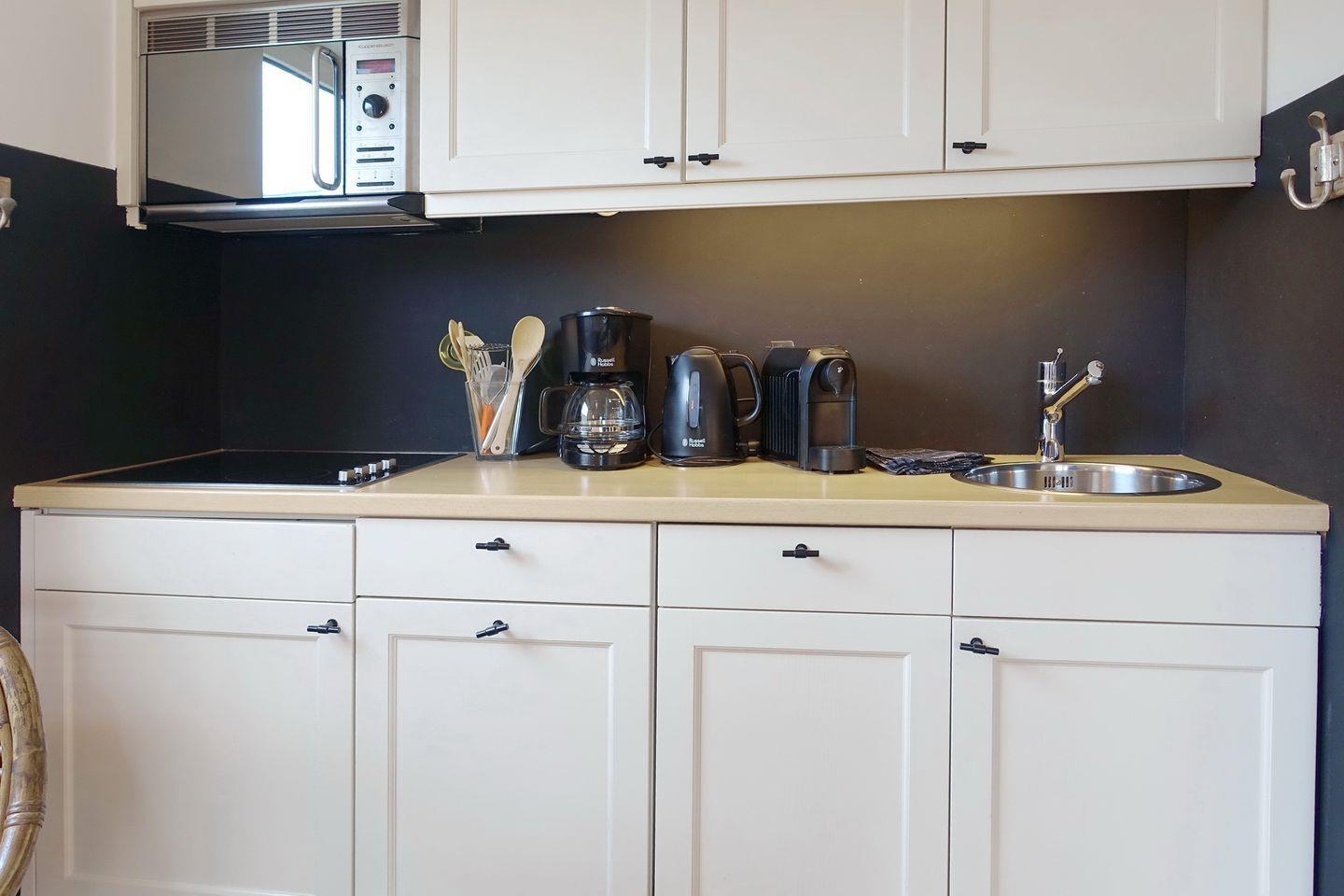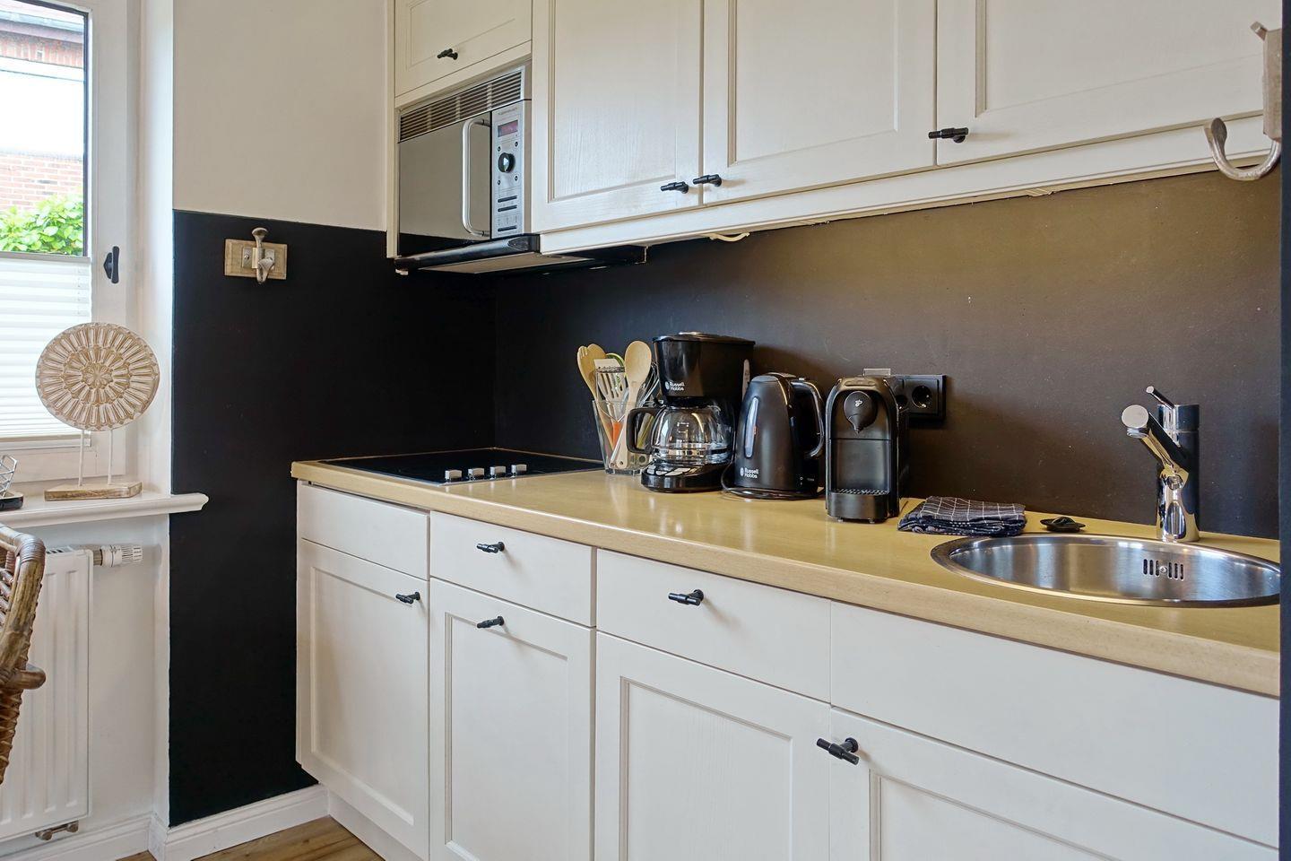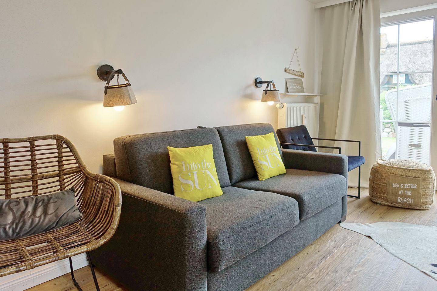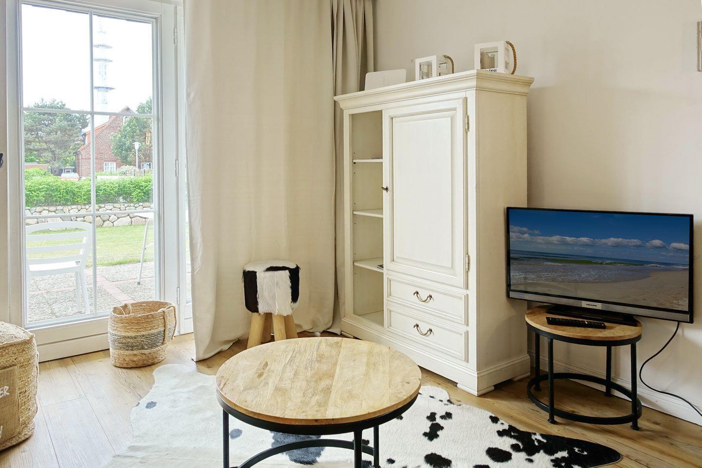 Der Wohnraum ist hell und modern ausgestattet mit einer Couch, einem Essbereich für bis zu drei Personen und einer offenen Küchenzeile, die sehr gut ausgestattet ist. Vom Wohnraum aus erreichen Sie Ihre eigene Terrasse, die von April bis Oktober möbliert ist und den Blick auf den kleinen Garten freigibt.