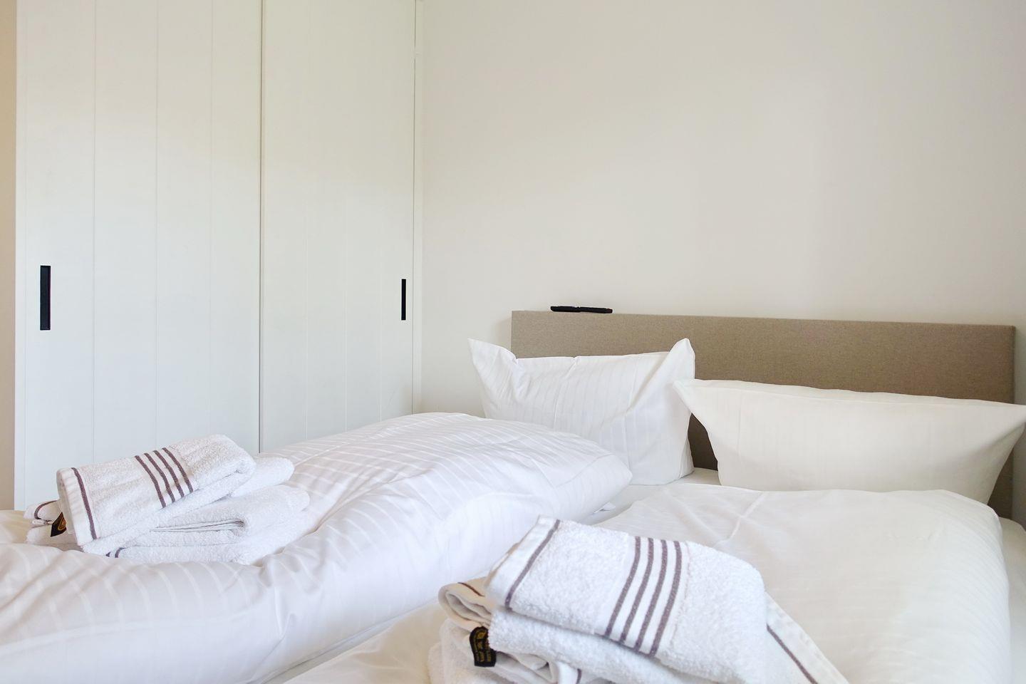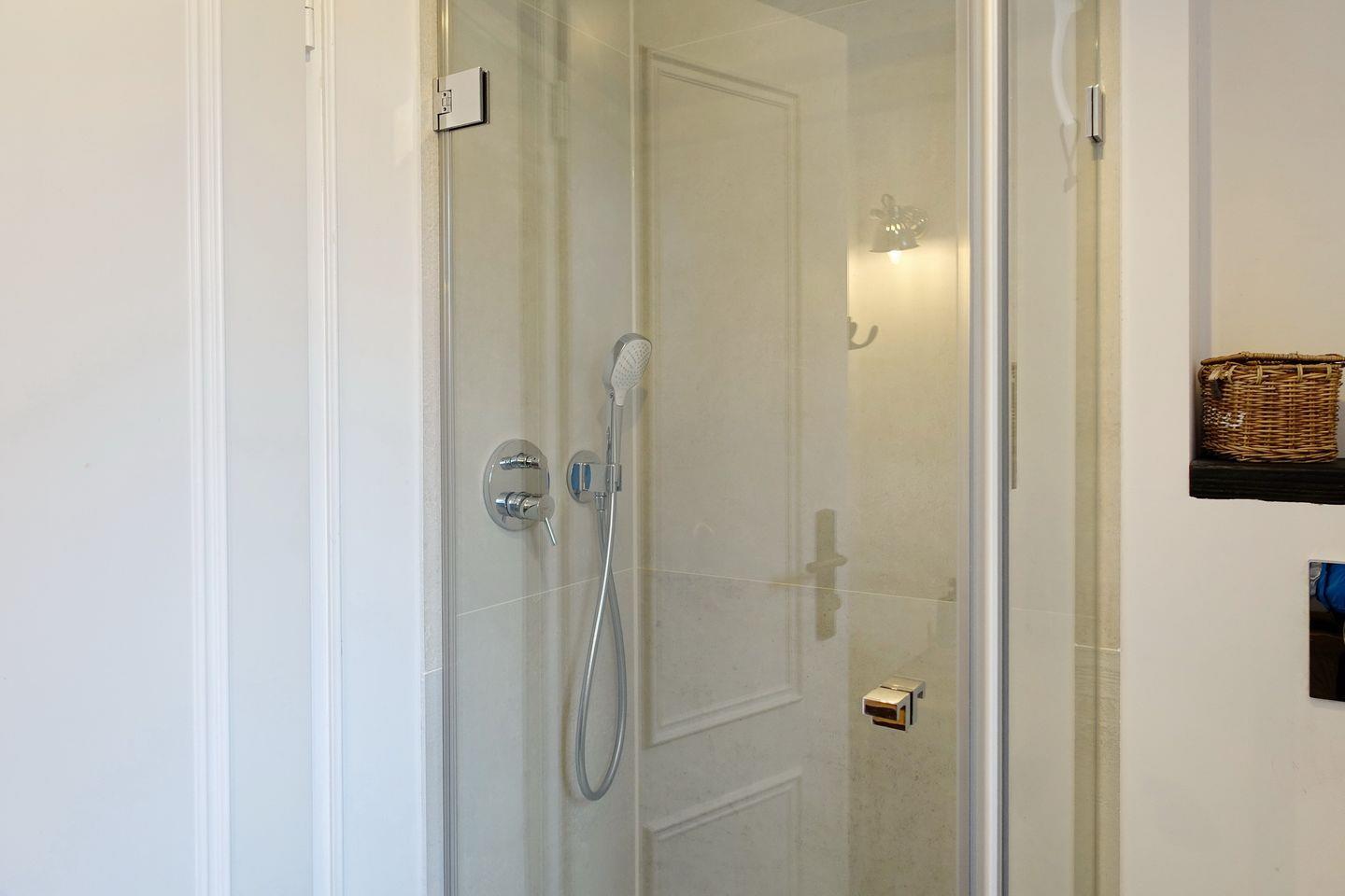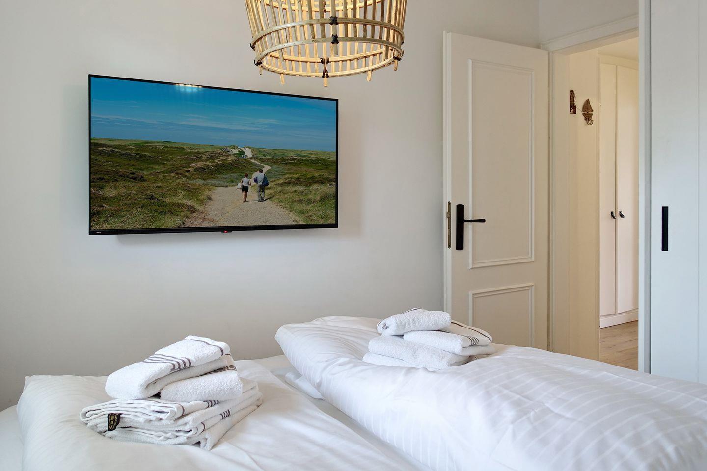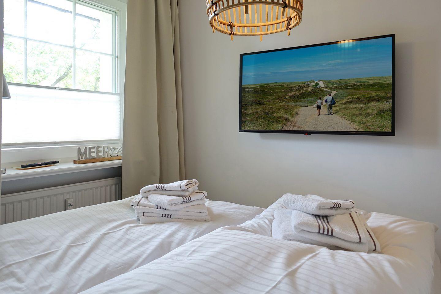 Auf gleicher Ebene erwartet Sie ein kleines Schlafzimmer mit Boxspringdoppelbett (160x200cm) und Smart-TV sowie einem Einbauschrank. Das moderne Tageslichtbadezimmer verfügt über eine Dusche und ein WC.