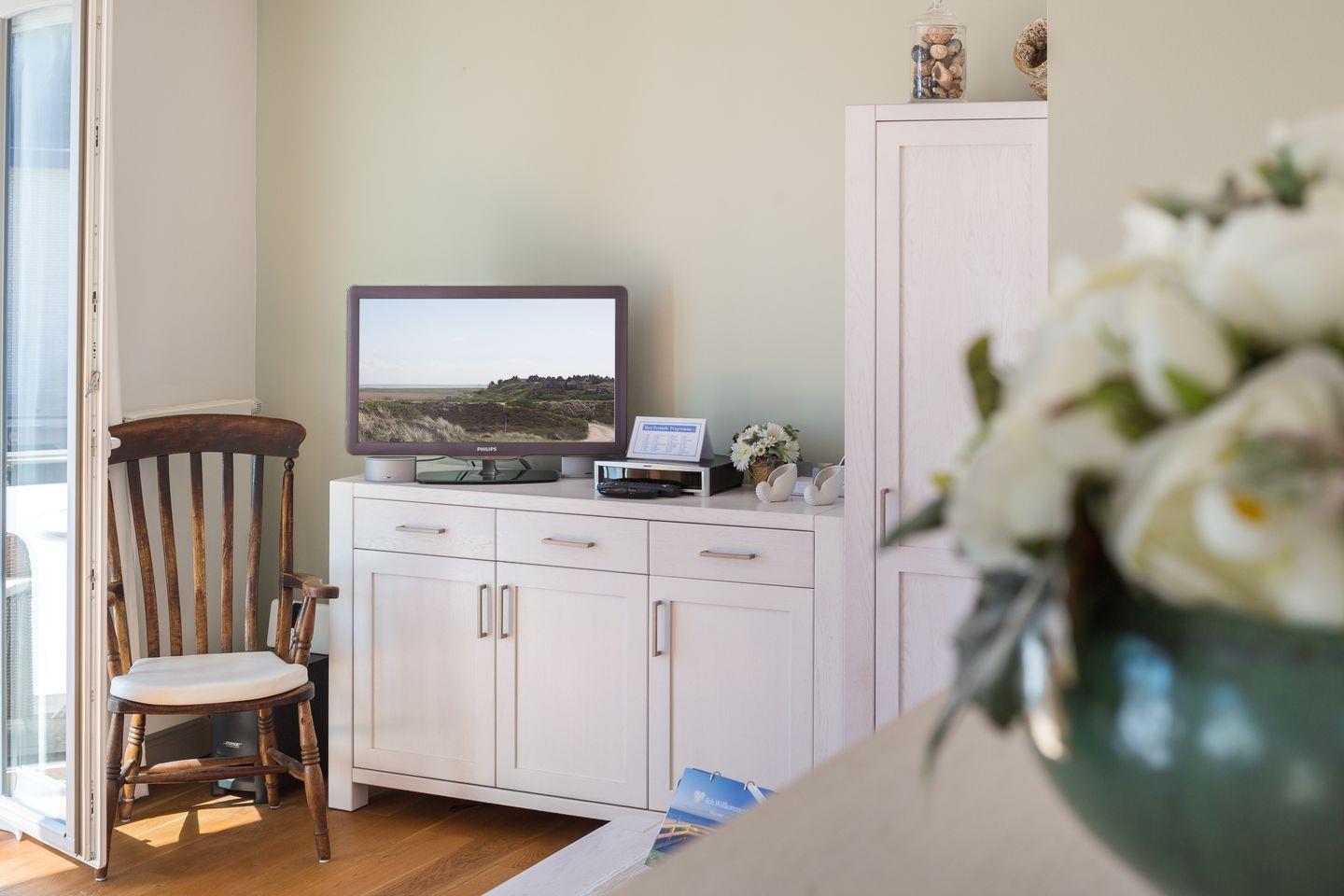 Obergeschoss: Mit sehr viel Liebe zum Detail ausgestattetes Wohnzimmer mit Flat-TV, BOSE-Hifi/DVD. Kuschelige Sitzecke (kein Schlafsofa). Offene Design-Küchenzeile mit Geschirrspüler und kombinierter Microwelle/Backofen. Sehr schönes Wohlfühlbad mit großzügiger Dusche, Waschtisch und beleuchtetem Kosmetikspiegel. Schönes Schlafzimmer mit Doppelbett (ca. 1,8x2m), Flat-TV, iPod-Radio-Dockingstation und viel Schrankplatz. Kleiner Südbalkon mit seitlichem Blick zu den Dünen.