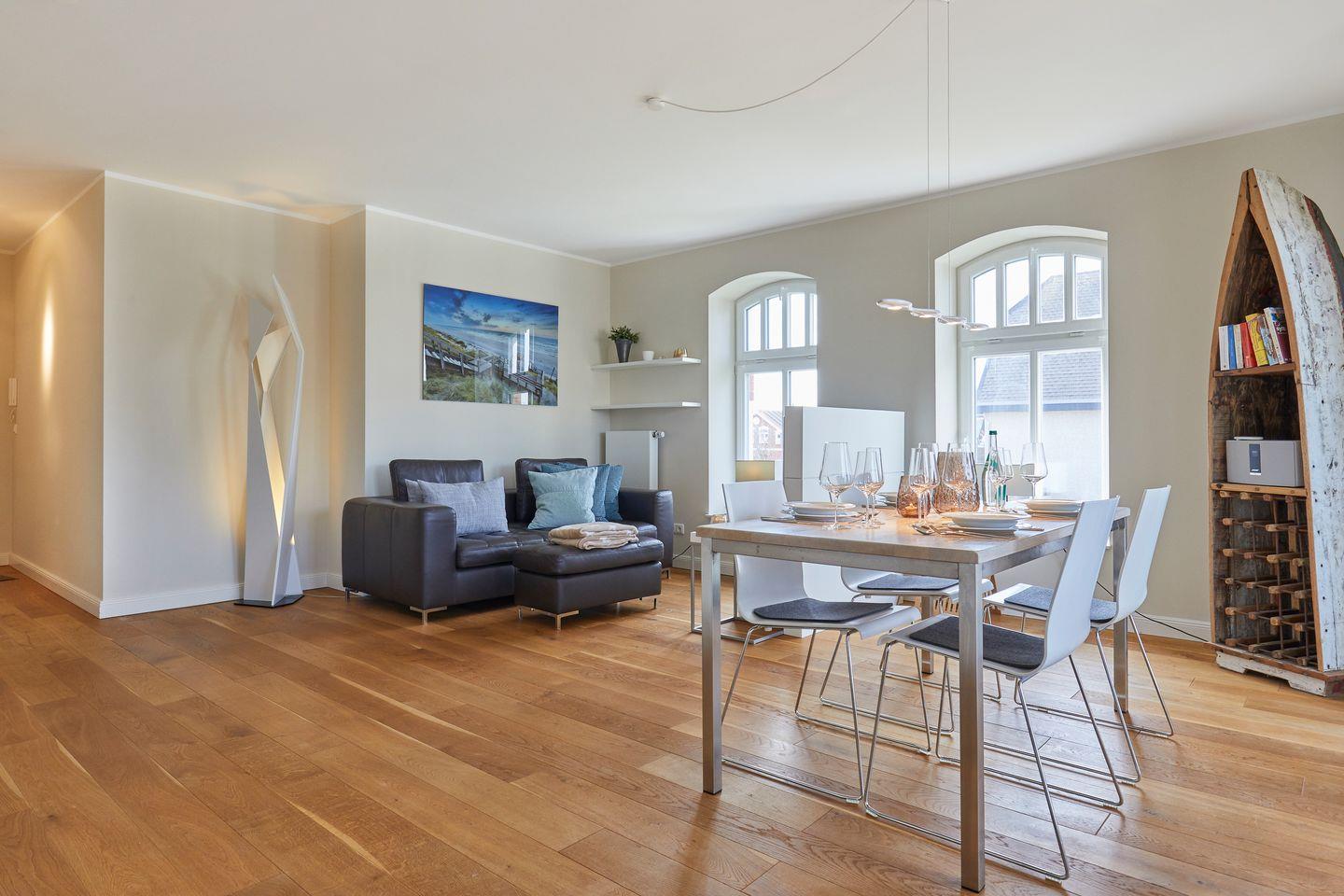 Sehr schön und hochwertig designter, sehr großzügiger Wohn-Essbereich, optisch durch ein TV-Board geschickt voneinander getrennt. Annehmlichkeiten wie eine Bose-Soundbox, VDSL50 und T-Home Entertain bleiben Ihnen hier ebenfalls nicht verwehrt. Viele Fensterflächen schaffen eine lichtdurchflutete Wohlfühlatmosphäre. Design-Mobiliar und -Accessoires in der gesamten Ferienwohnung. Sonniger Süd-Westbalkon in (für Sylter Verhältnisse :-)) windgeschützter Loggia-Ausprägung. Wertiges Gartenmobiliar und selbst auf einen Strandkorb müssen Sie auf Ihrem Balkon nicht verzichten. Sehr schöne Blickrichtung bis zu den imposanten Westerländer Dünen.