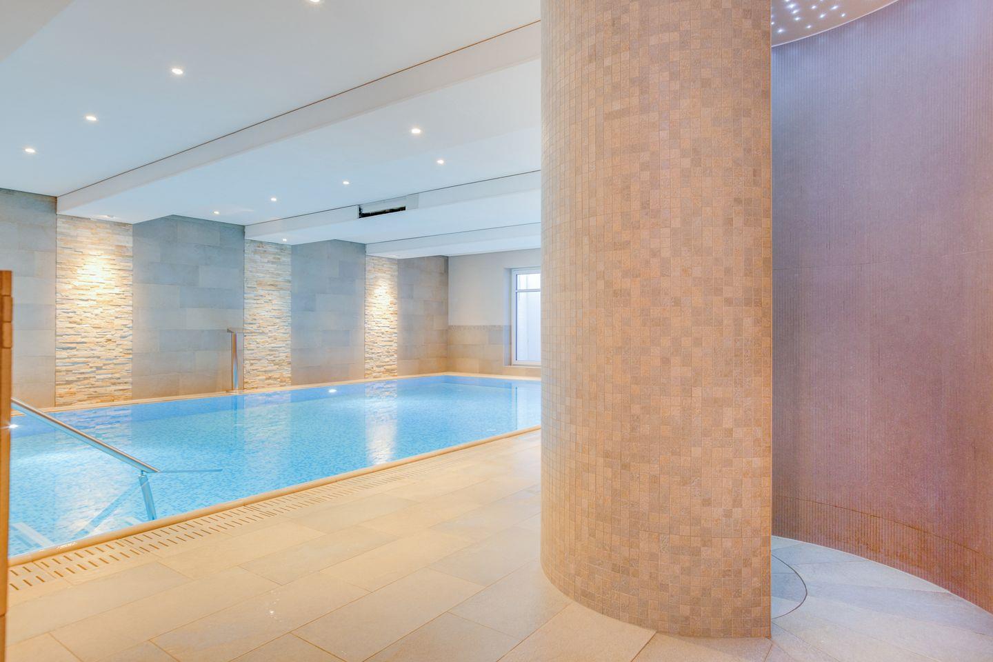 Doch damit nicht genug, erwartet Sie im Souterrain ein State-Of-The-Art Gemeinschafts-Wellnessbereich. Ihr Indoorpool ist sogar für richtiges Bahnenschwimmen geeignet und sorgt mit Schwallanlage für Wellness pur. Die Duschen wurden in Schneckenform von Hand modelliert und mit stylishen LED-Lämpchen versehen. Großzügige Sauna und Dampfsauna dürfen hier auch nicht fehlen.