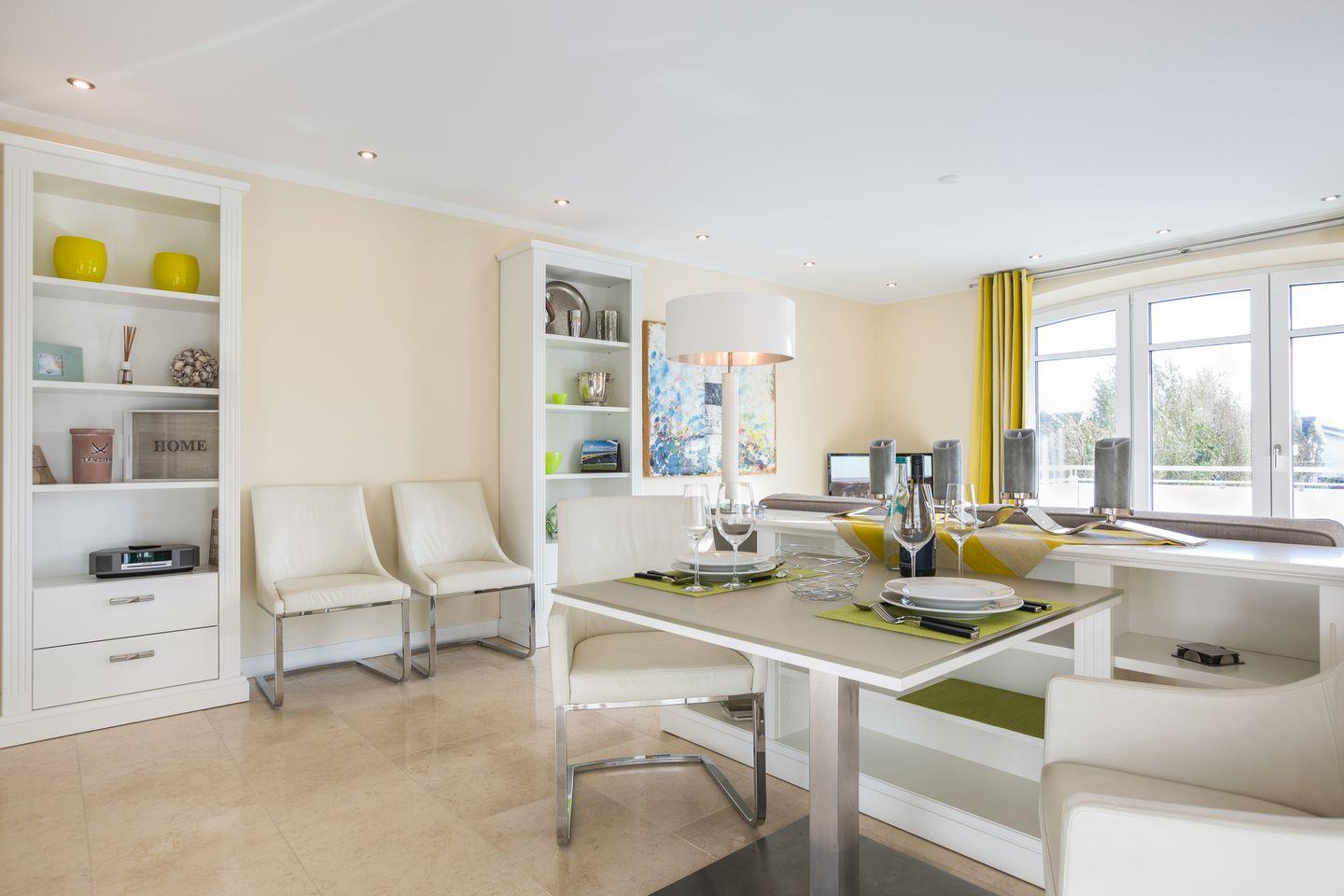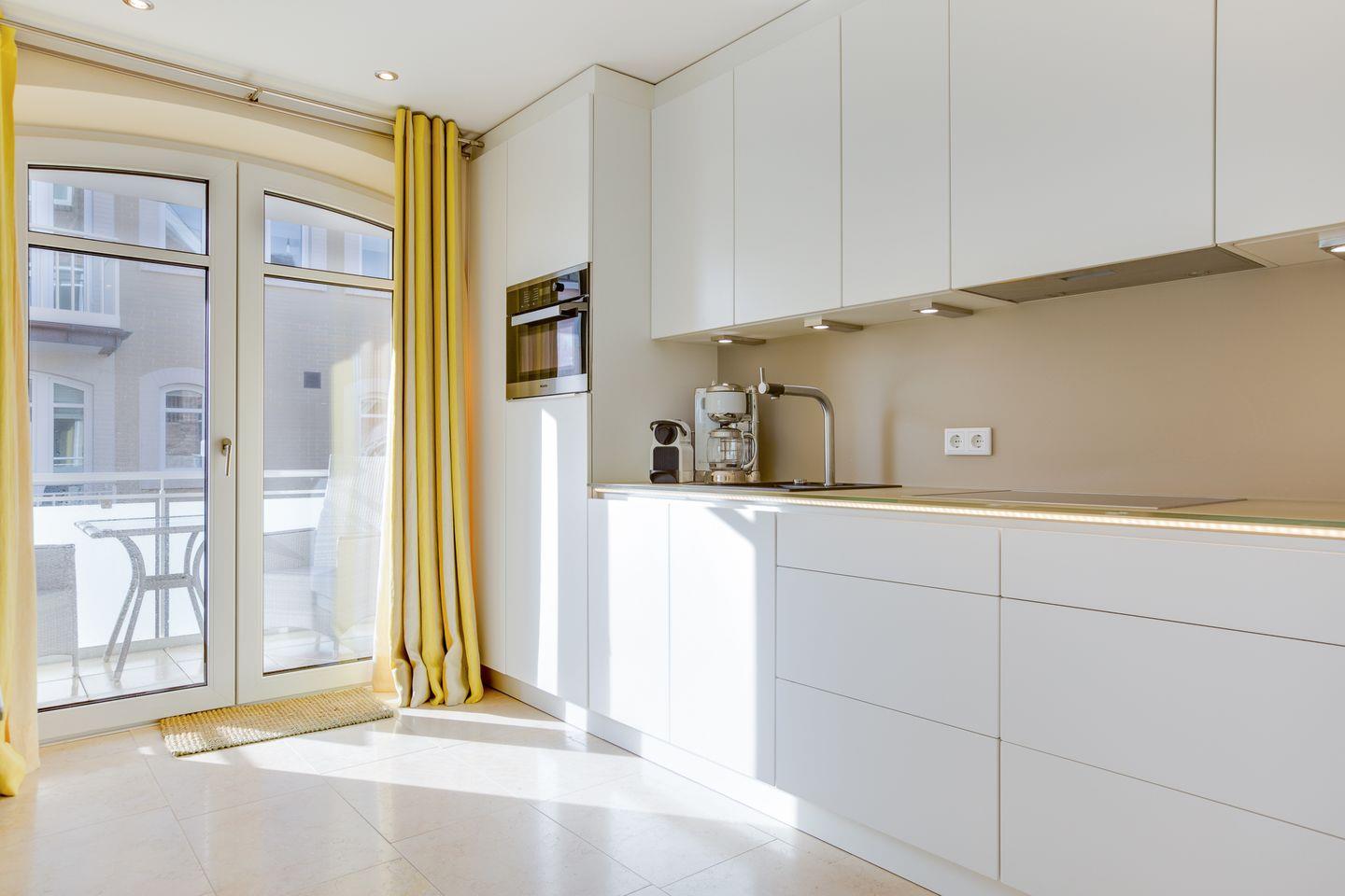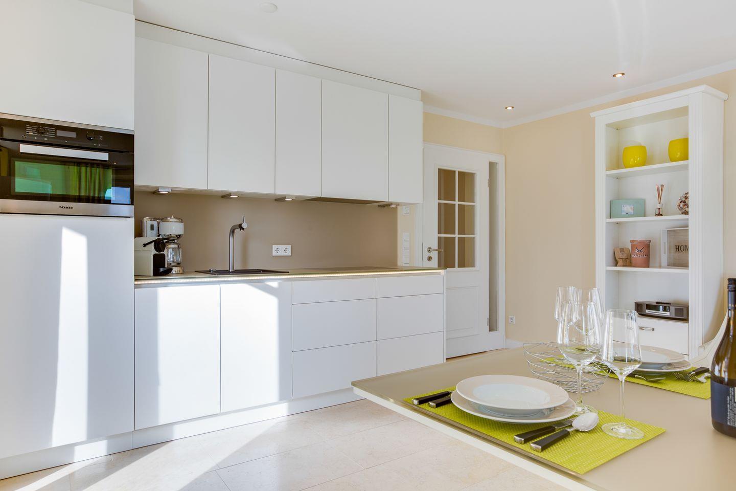 Ihre Luxus-Küche mit überkompletter Ausstattung wurde durch ein Sideboard optisch geschickt vom Wohnbereich getrennt. Hier findet sich auch Ihr gemütlicher Essbereich.