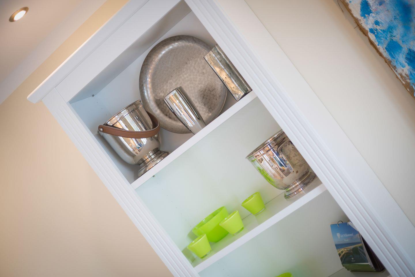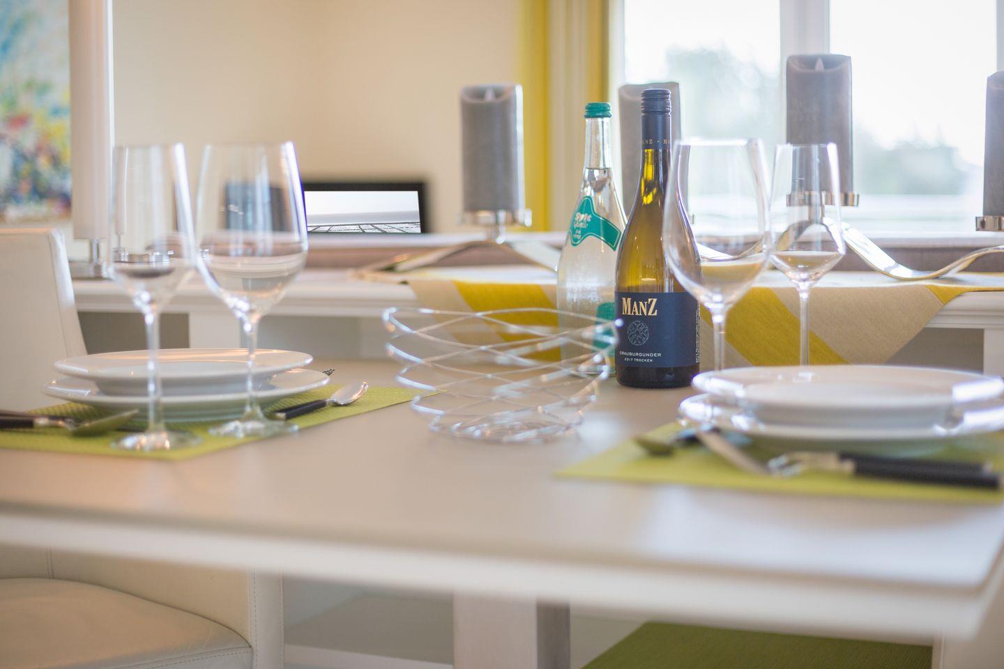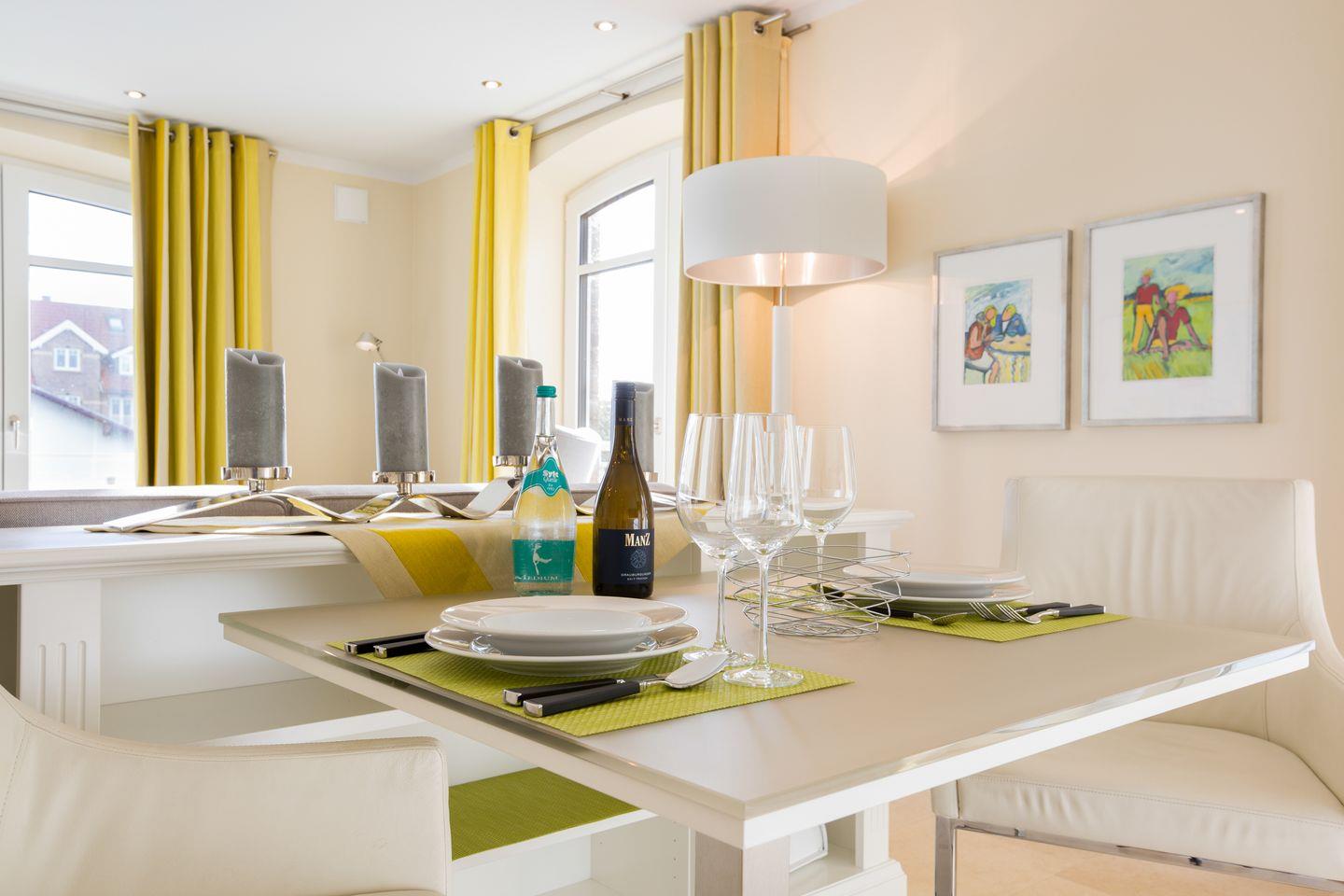 Ihre Luxus-Küche mit überkompletter Ausstattung wurde durch ein Sideboard optisch geschickt vom Wohnbereich getrennt. Hier findet sich auch Ihr gemütlicher Essbereich.