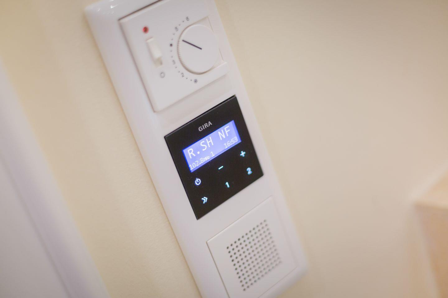 Ihr Bad verwöhnt Augen und Sinne mit erlesenen Installationen, XXL-Raindance Armatur und feinen Fliesen. Ihr Unterputzradio lässt Sie beschwingt in den Tag starten und die von Hand bemalte Wand setzt optische Akzente.