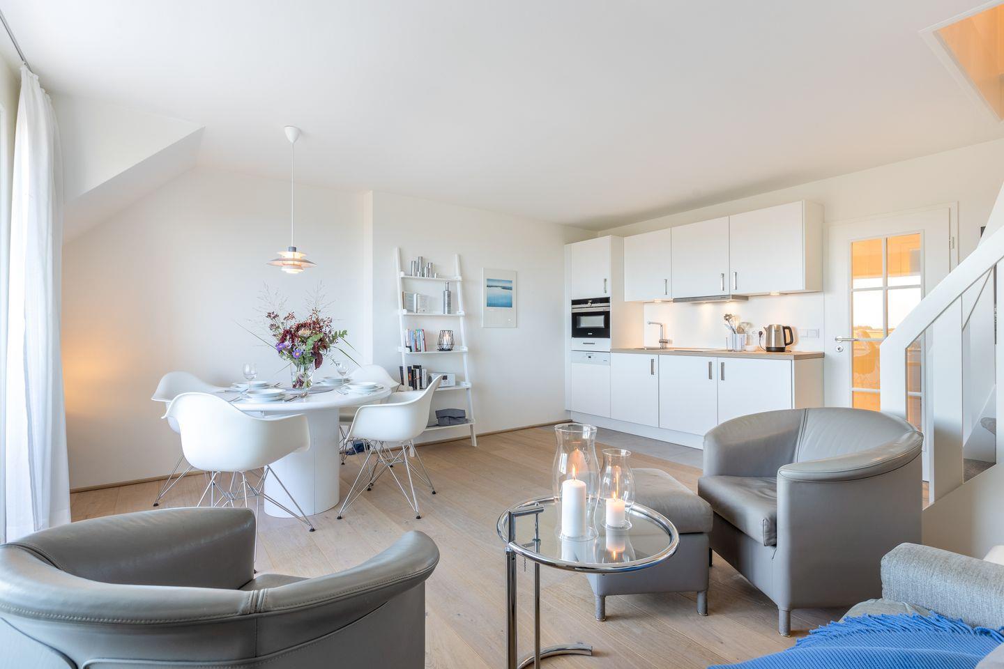 OG: Wohnraum mit Flatscreen-TV, W-Lan, Radio und Bluetooth-Dock, Essbereich, offene Küchenzeile mit Backofen-Microwellen-Kombi, Geschirrspülmaschine, Filterkaffeemaschine und Cerankochfeld, Balkon mit Balkonmöbeln (ca. April – Oktober) und traumhaftem Meerblick, Duschbad mit WC, Schlafzimmer mit Doppelbett (180x200cm)