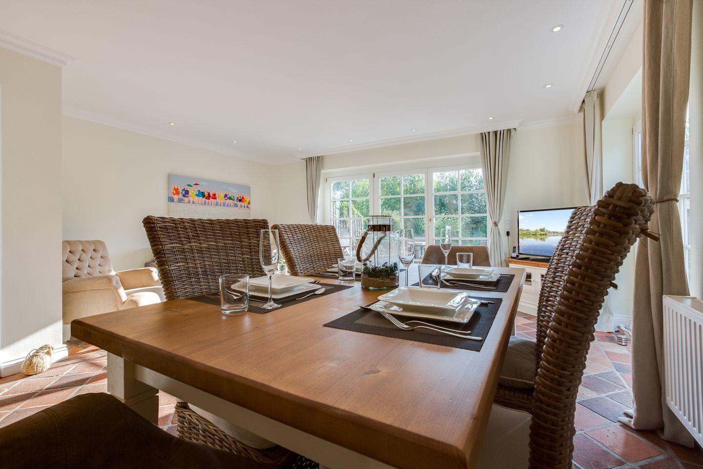 Vom großzügigen Wohnzimmer aus gelangen Sie auf Ihre möblierte Terrasse mit typischem Sylter Strandkorb, Esstisch und Sonnenliegen. Im Erdgeschoss befindet sich außerdem ein Badezimmer mit Dusche und ein großzügiger Eingangsbereich.