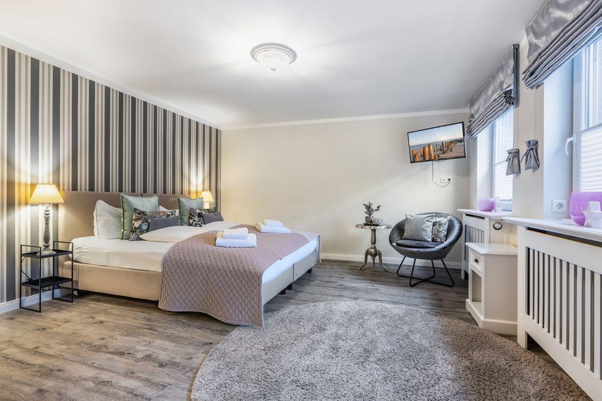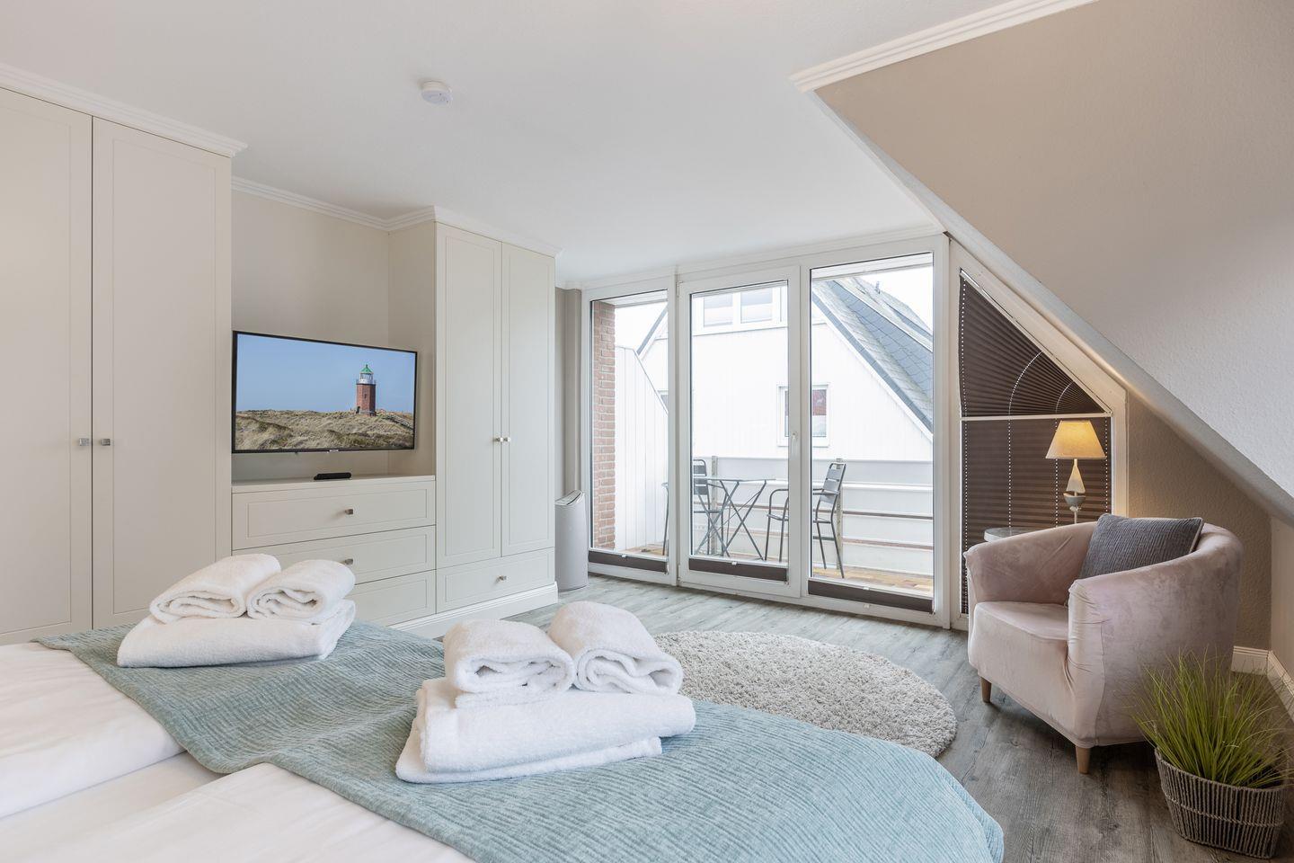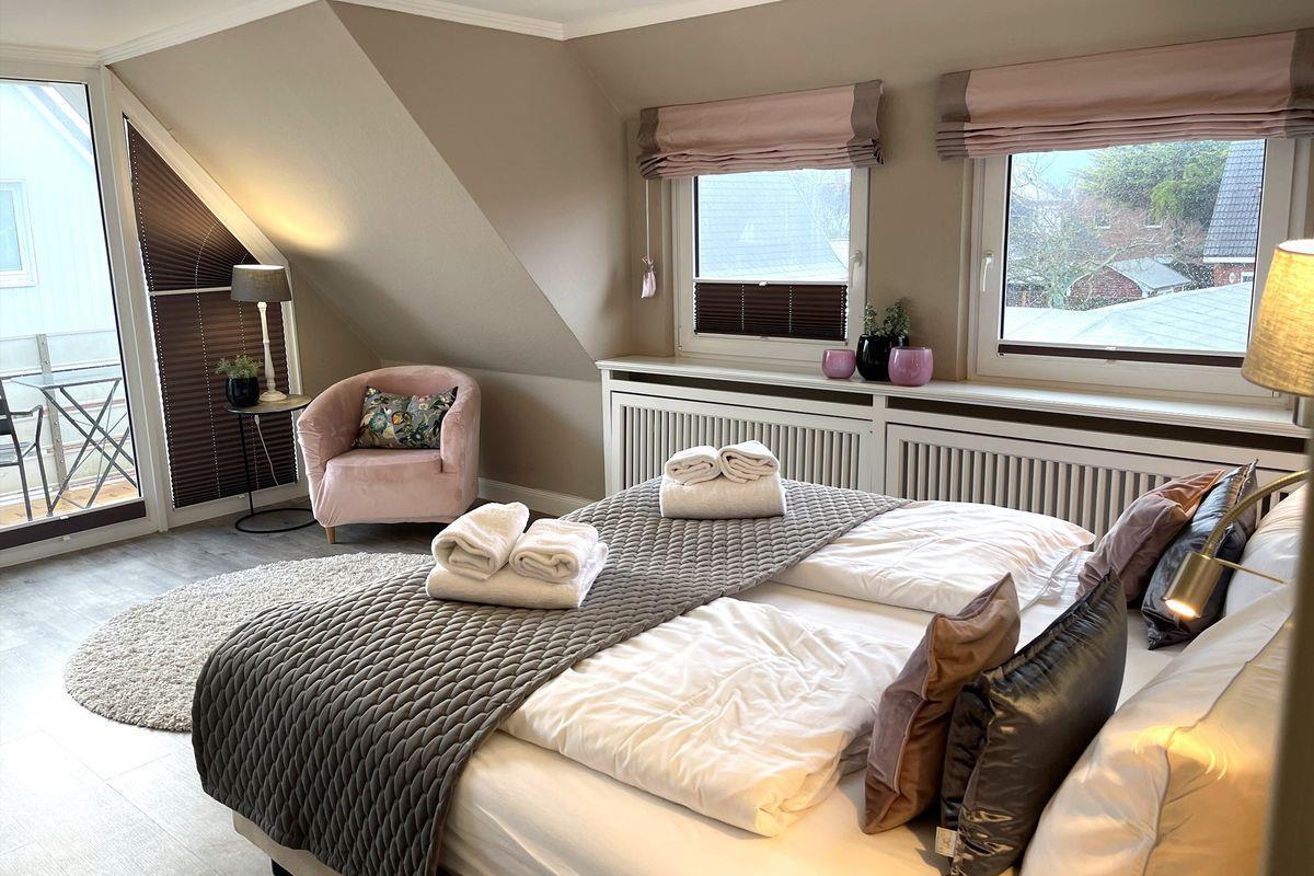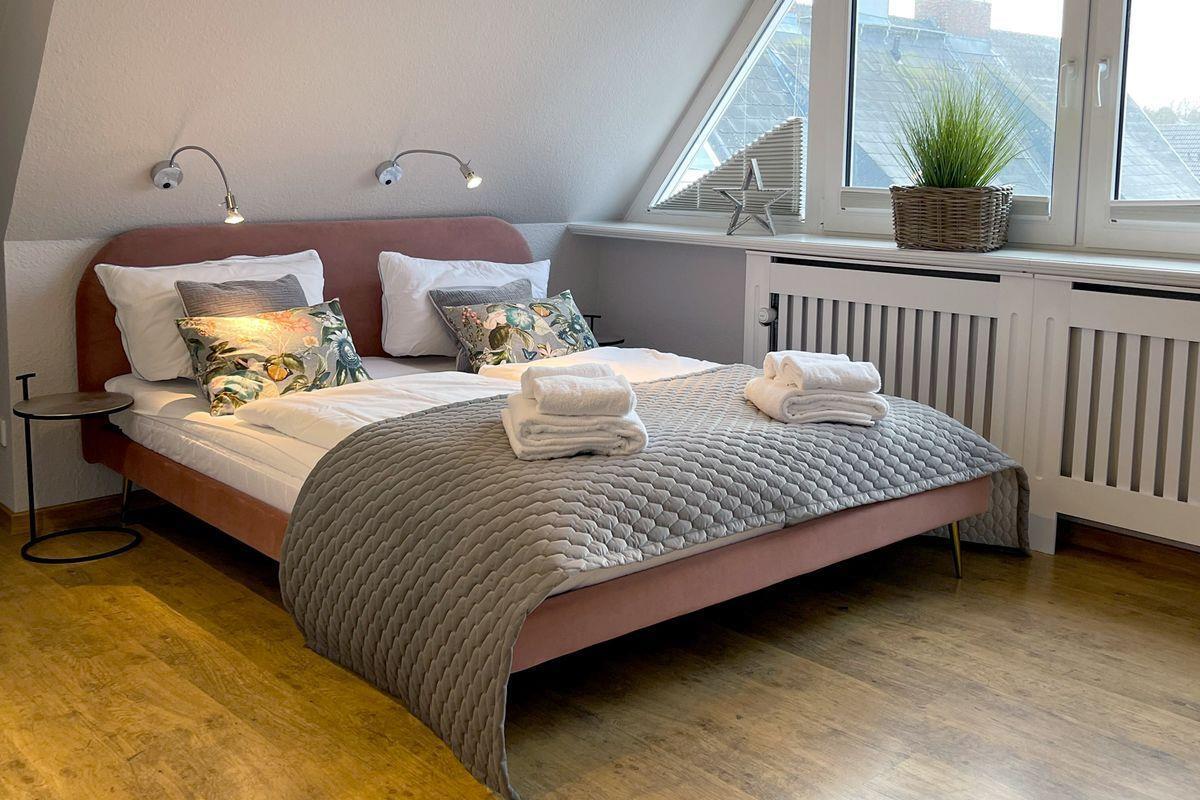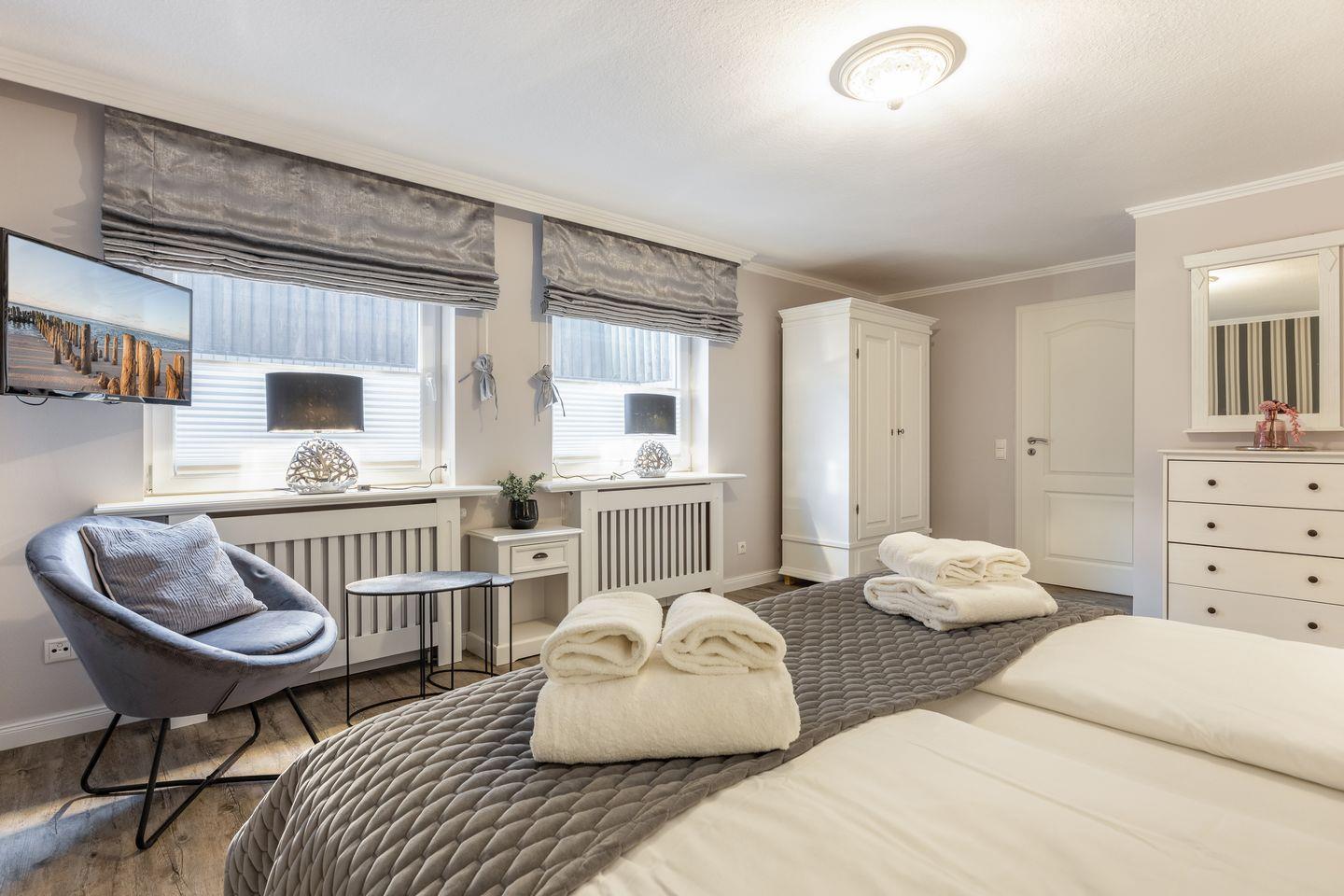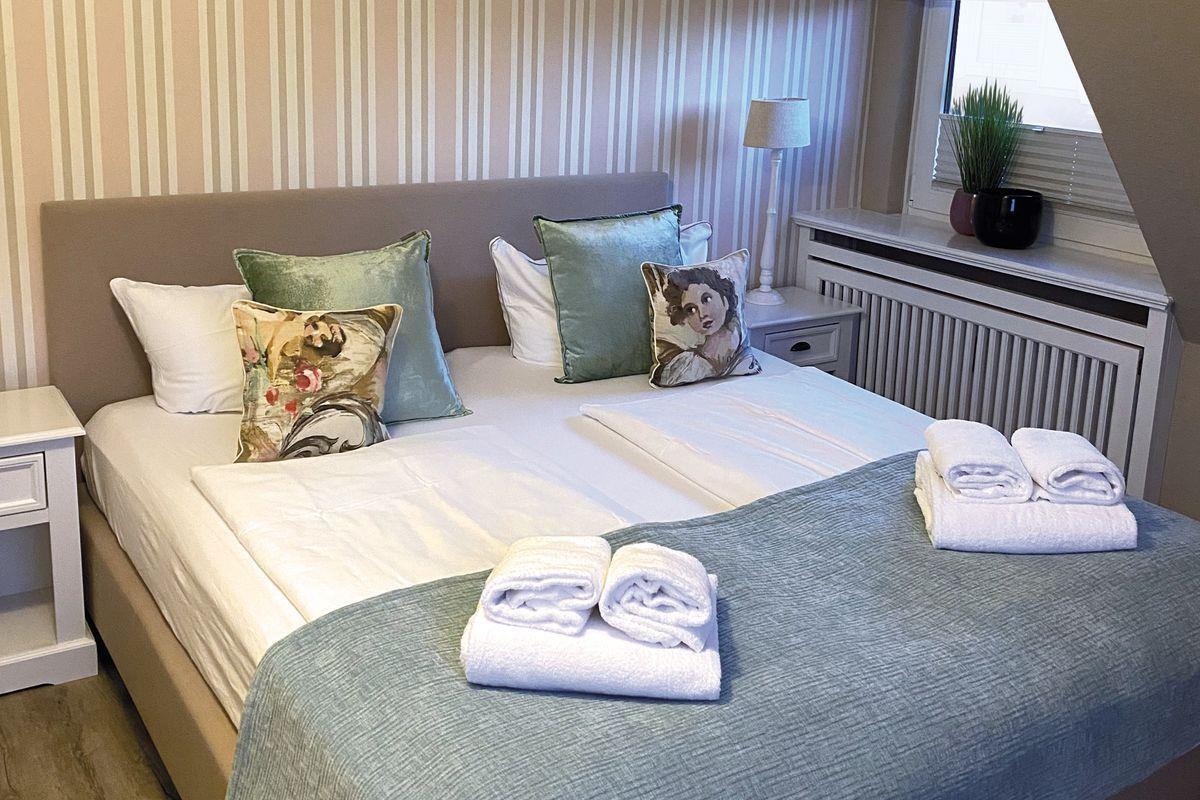 OG: 2 Schlafzimmer mit Boxspringbett (eins mit Südbalkon); 1 Bad mit Badewanne