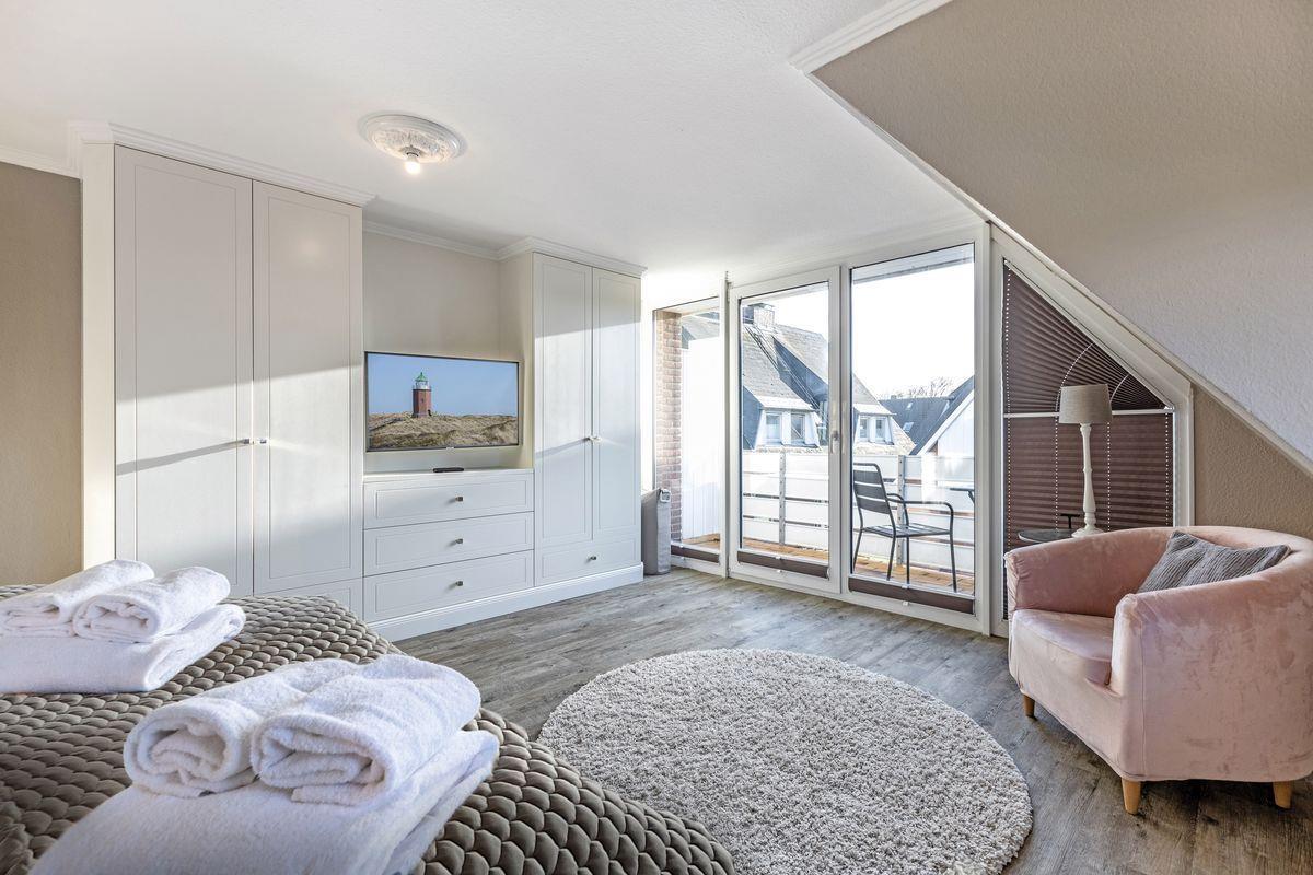Sie auf einem modernen Polsterbett. Eine hochwertige Schlafcouch steht hier zusätzlich zur Verfügung. Ein Flatscreen-TV ist auch hier wie in allen Schlafzimmern vorhanden und im Ober- und Dachgeschoss stehen neue Einbauschränke für Sie bereit.