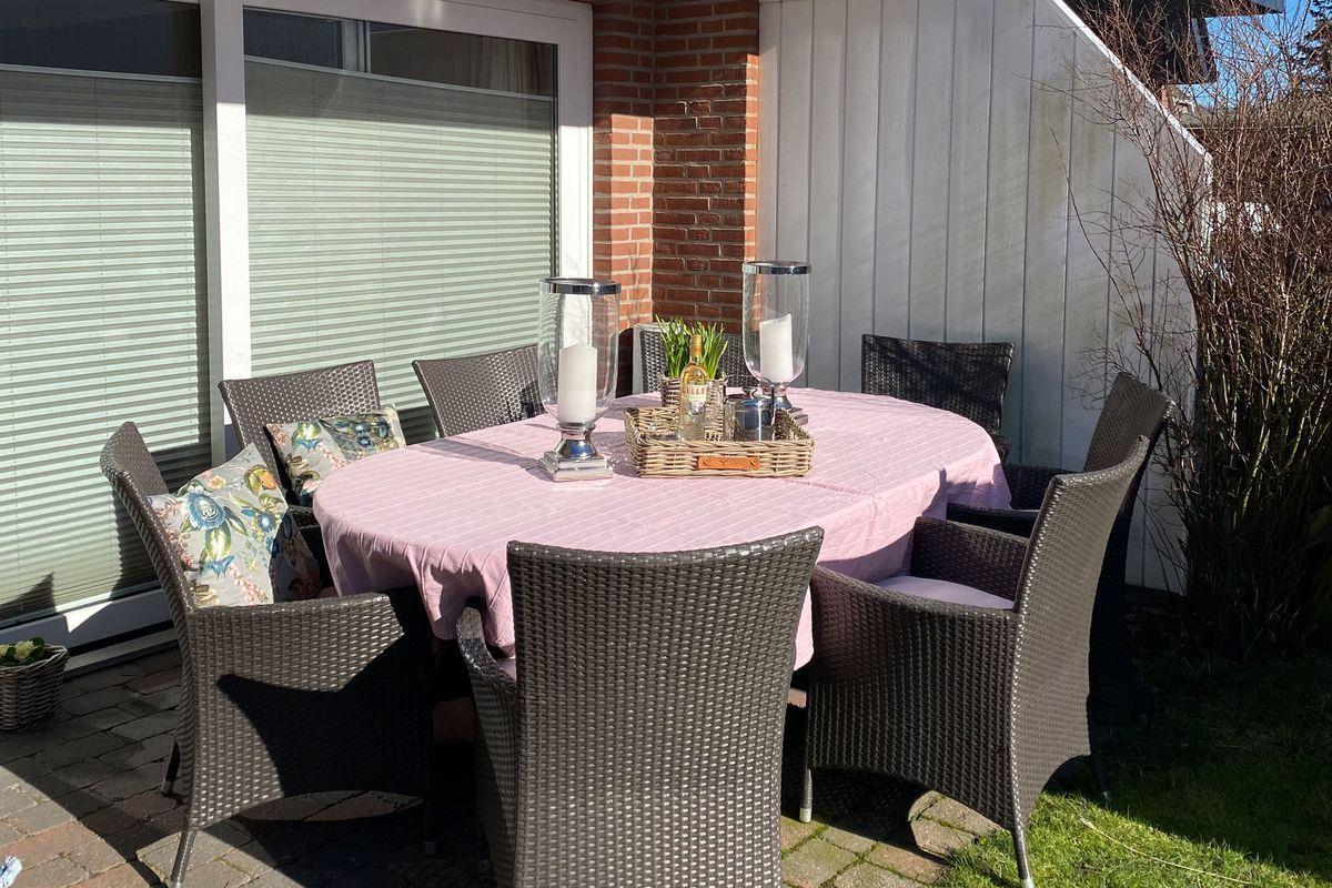 Gartenterrasse (Süden) mit Gartenmöbeln und Strandkorb