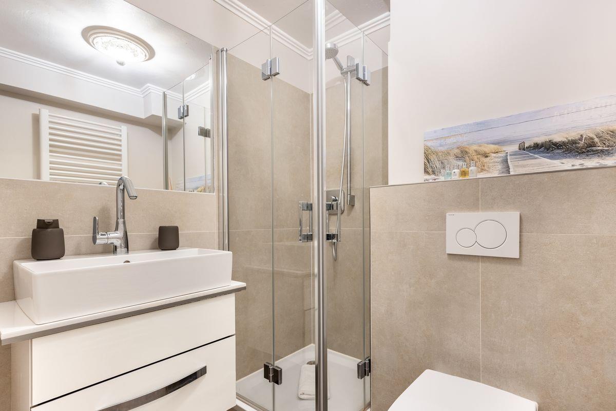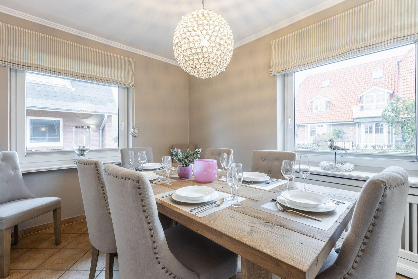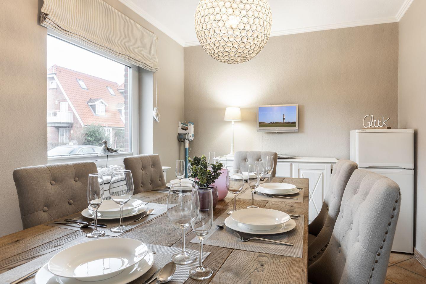 Im Erdgeschoss erwartet Sie das Wohnzimmer mit seiner großen Sitzecke und daran an grenzt die durch einen kleinen Tresen abgetrennte Küche, in welcher auch eine Nespresso-Maschine auf Sie wartet. Das separate Esszimmer bietet Platz genug für eine Großfamilie und ist wie auch das Wohnzimmer mit einem TV ausgestattet. Bei schönem Wetter lädt auch die Süd-Terrasse mit Gartenmöbeln und Strandkorb zum draußen sitzen ein. Genießen Sie schon zum Frühstück die Sonne auf der Terrasse.
