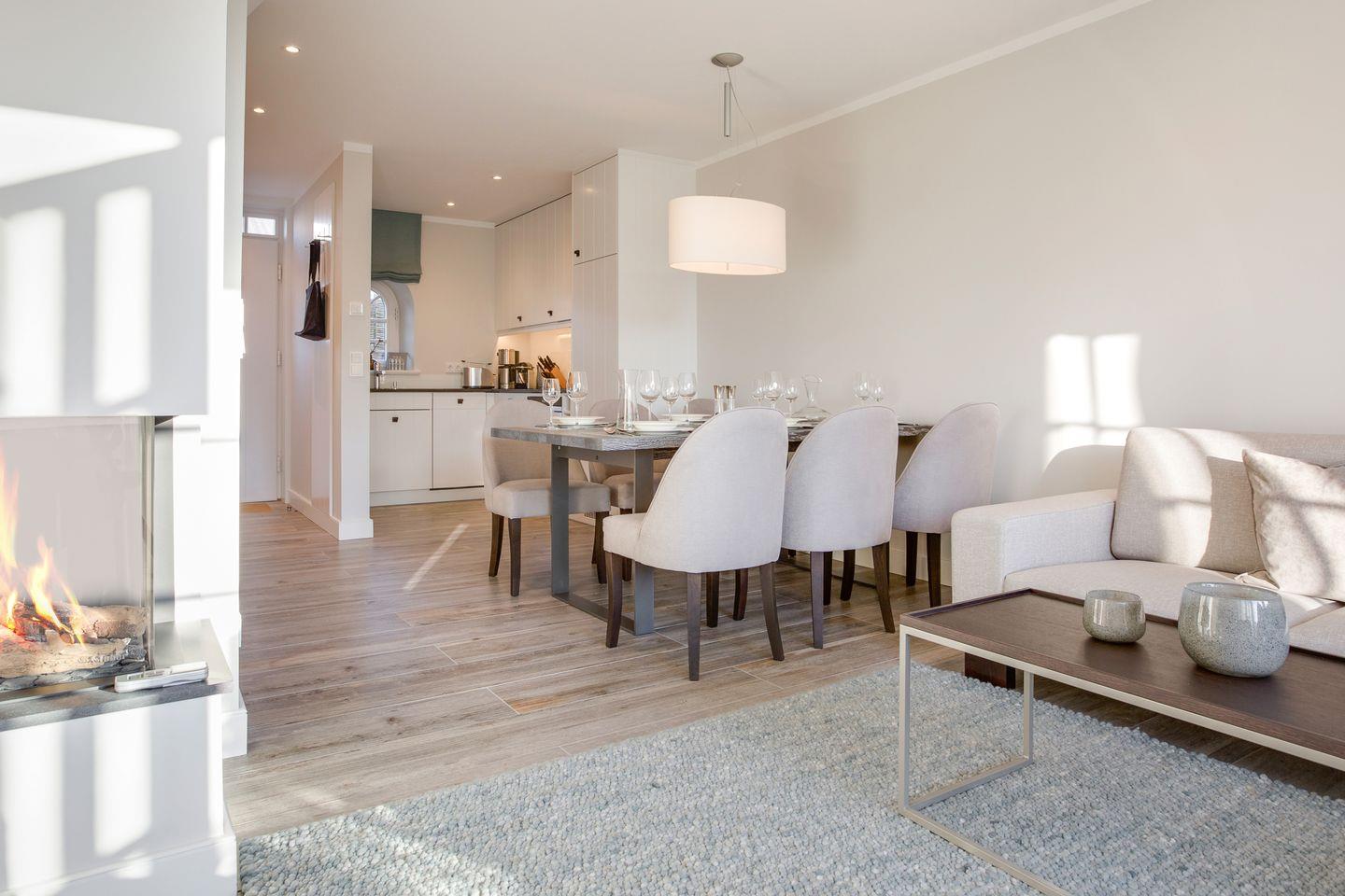 EG: Wohn- und Esszimmer mit Gaskamin, Flatscreen-TV, Blu-Ray-Player, WLAN, Sonoro Hifi-Anlage, integrierte Küchenzeile mit Induktionsherd, Geschirrspüler, komb. Mikrowelle/Backofen, Gäste-WC, Westterrasse mit Gartenmöbeln und Strandkorb.