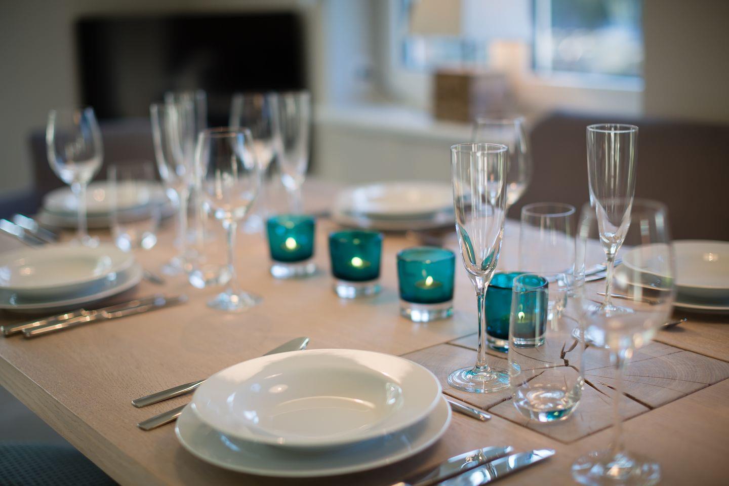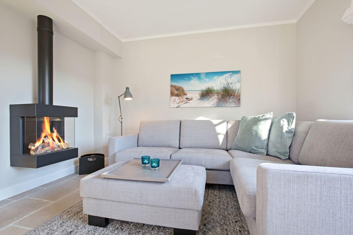 EG: Stilvoll designter Wohn- und Essbereich mit Gaskamin (per Fernbedienung regulierbar). Komplette technische Ausstattung mit WLAN, Sounddock, Smart-TV. Komplett ausgestattete, in den Wohnbereich optisch integrierte Luxusküche mit Geschirrspüler, Microwelle und Backofen. Sonnige Westterrasse mit kleinem Gärtchen, wertiges Gartenmobiliar sowie Strandkorb (ganzjährig). Gäste-WC im kleinen Dielenbereich.