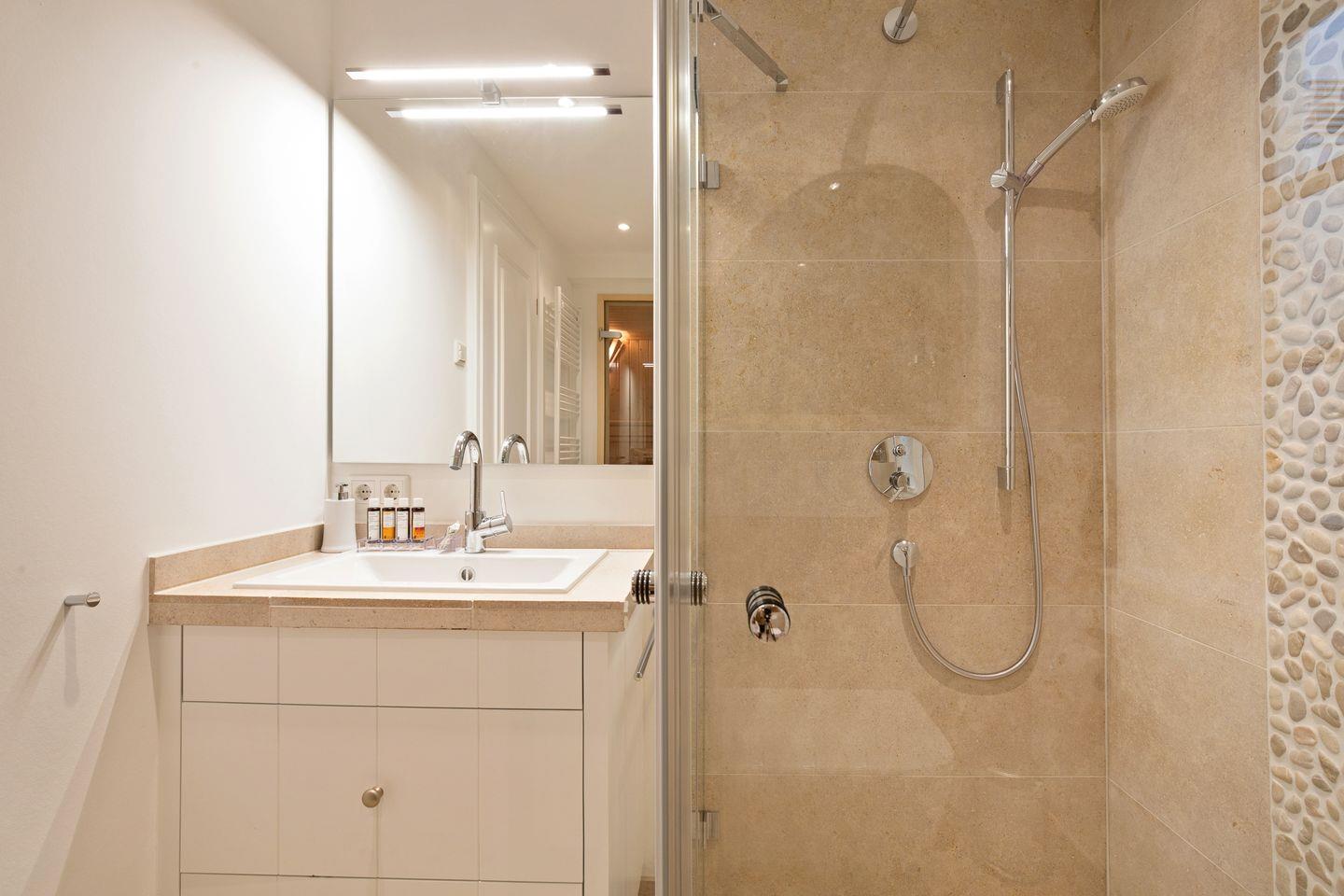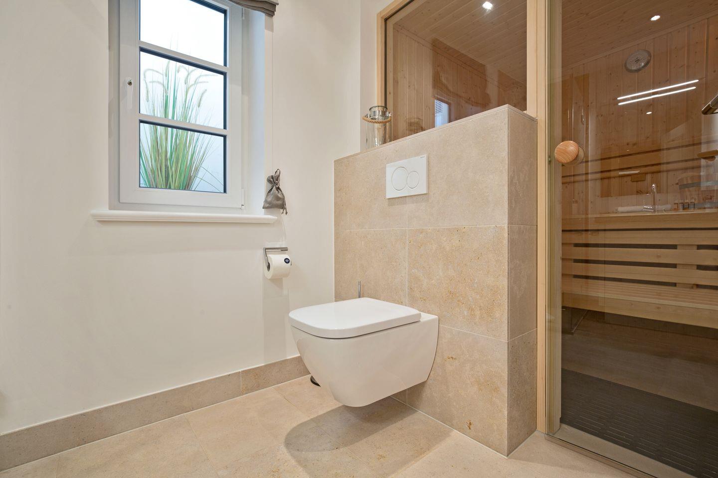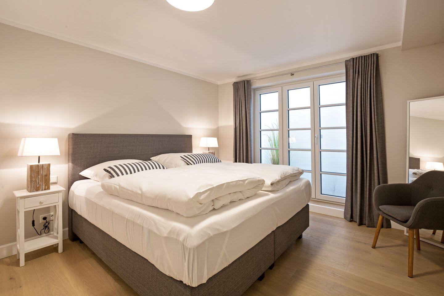 UG: Im Souterrain empfängt Sie ein heller,hochwertig dekorierter Raum mit Boxspringbett, Smart-TV und bodentiefen Fenstern. Wellness-Bad mit verglaster Sauna, Dusche und Waschtisch.