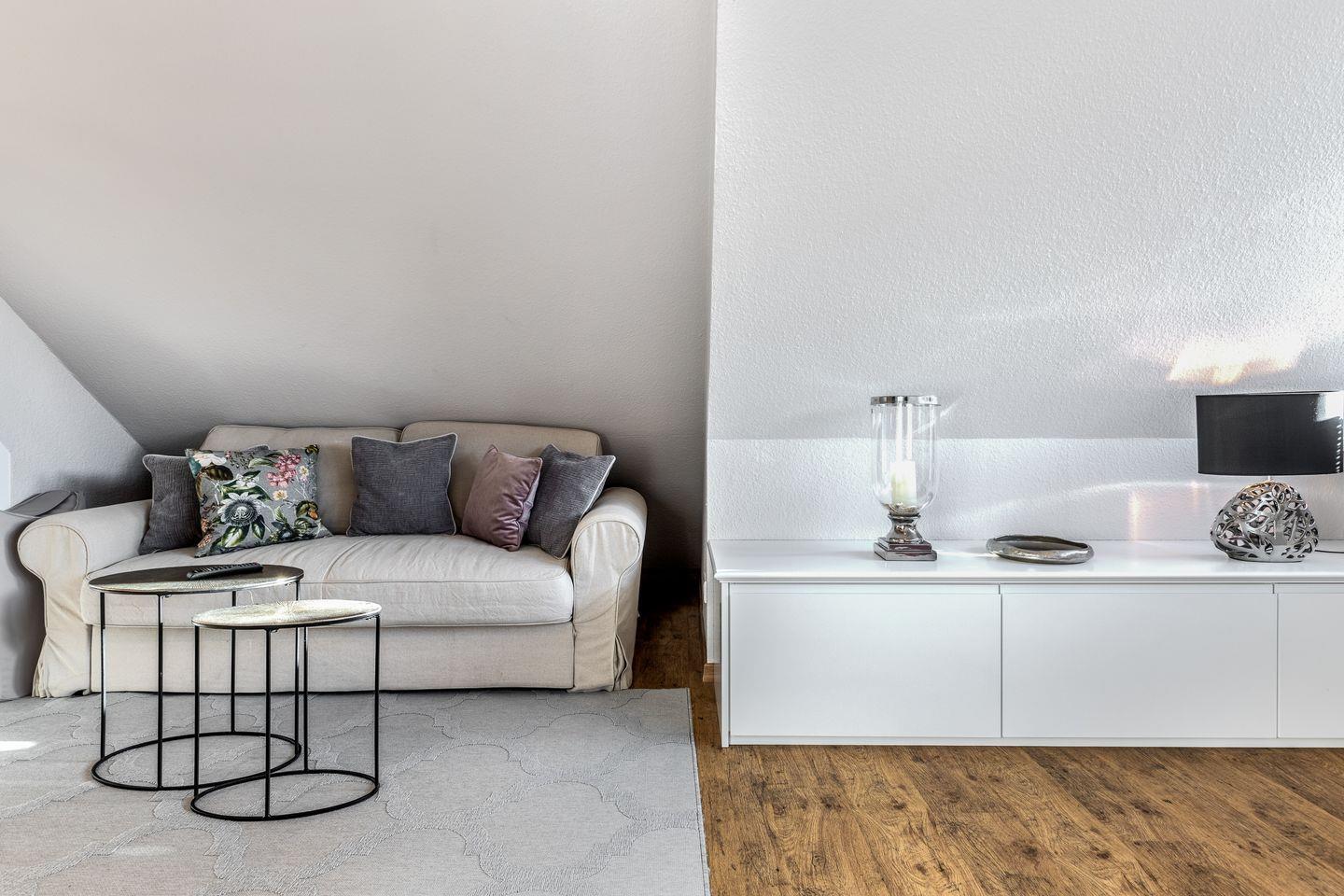 Sie auf einem modernen Polsterbett. Eine hochwertige Schlafcouch steht hier zusätzlich zur Verfügung. Ein Flatscreen-TV ist auch hier wie in allen Schlafzimmern vorhanden und im Ober- und Dachgeschoss stehen Einbauschränke für Sie bereit.