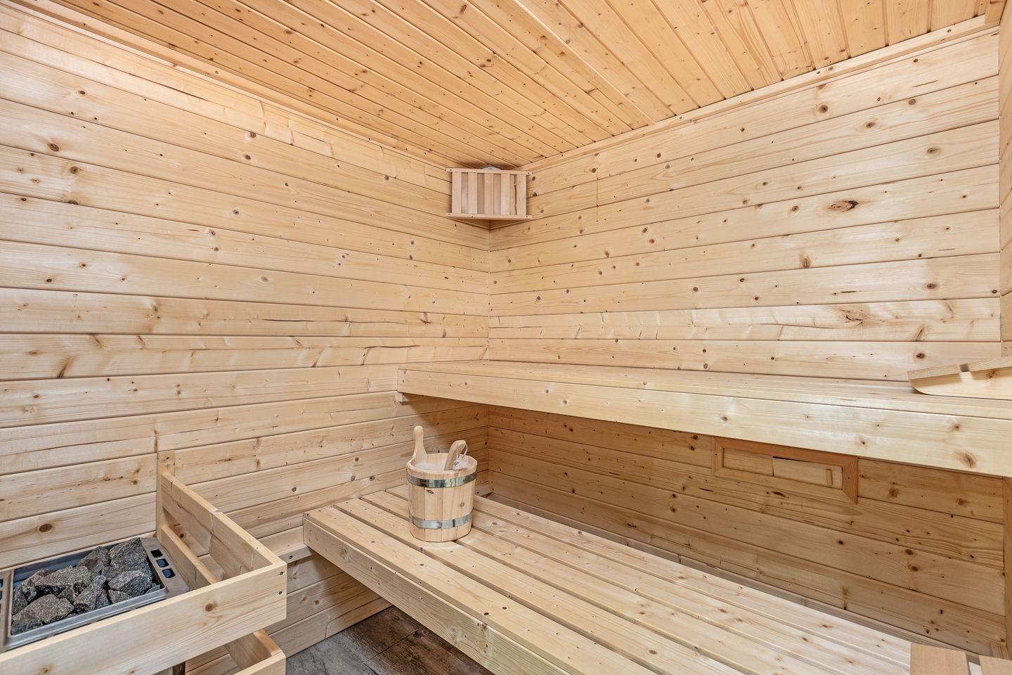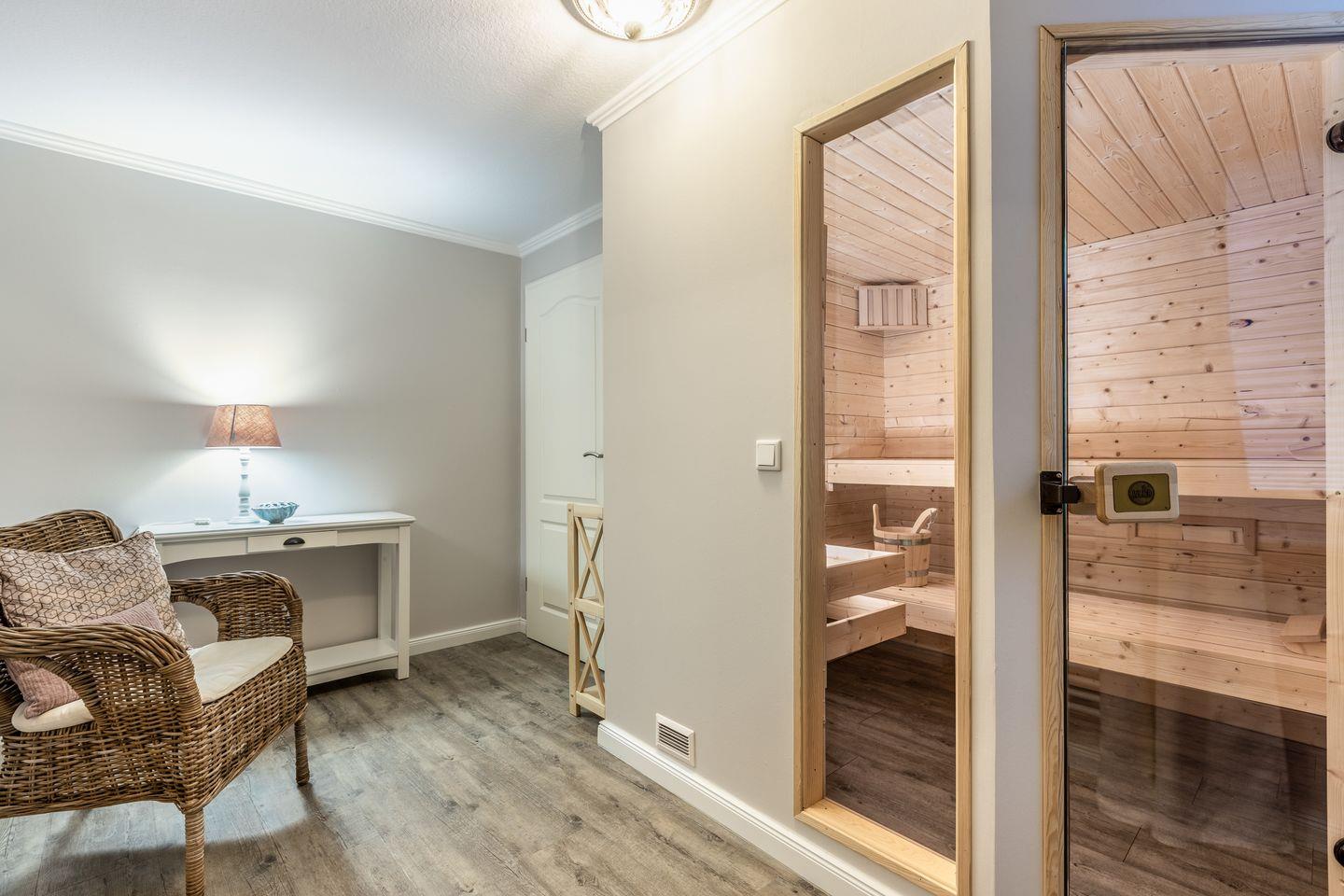 der Sinn nach einem Wellness-Tag steht, wartet im Untergeschoss eine große Sauna mit Ruheraum auf Sie.