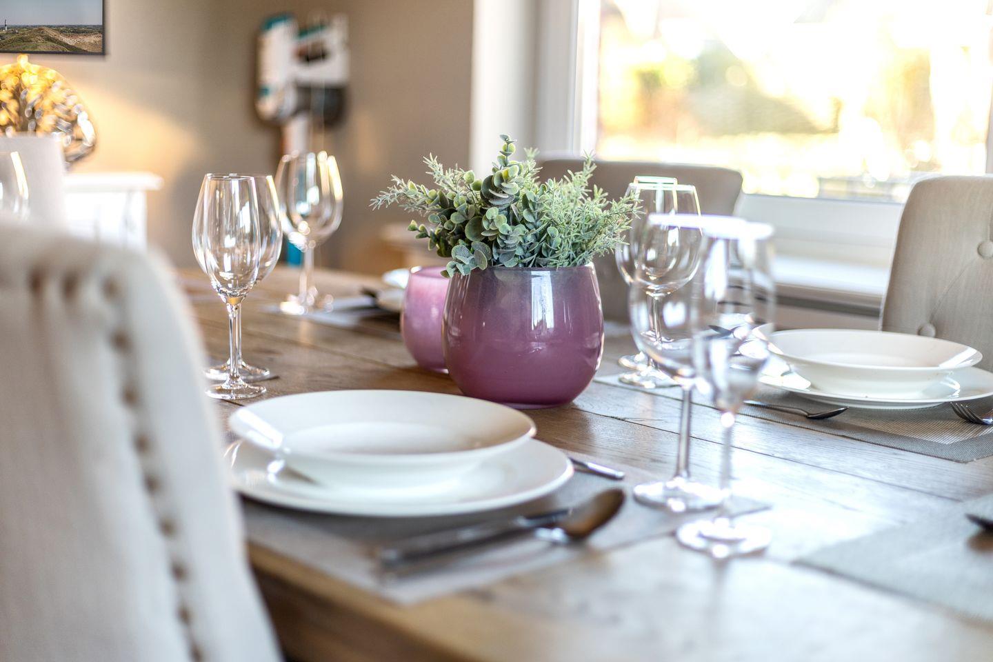 Separates Esszimmer mit Flatscreen-TV; Gäste WC mit Duschbad, Gartenterrasse (Süden) mit Gartenmöbeln und Strandkorb