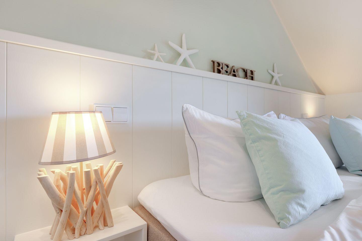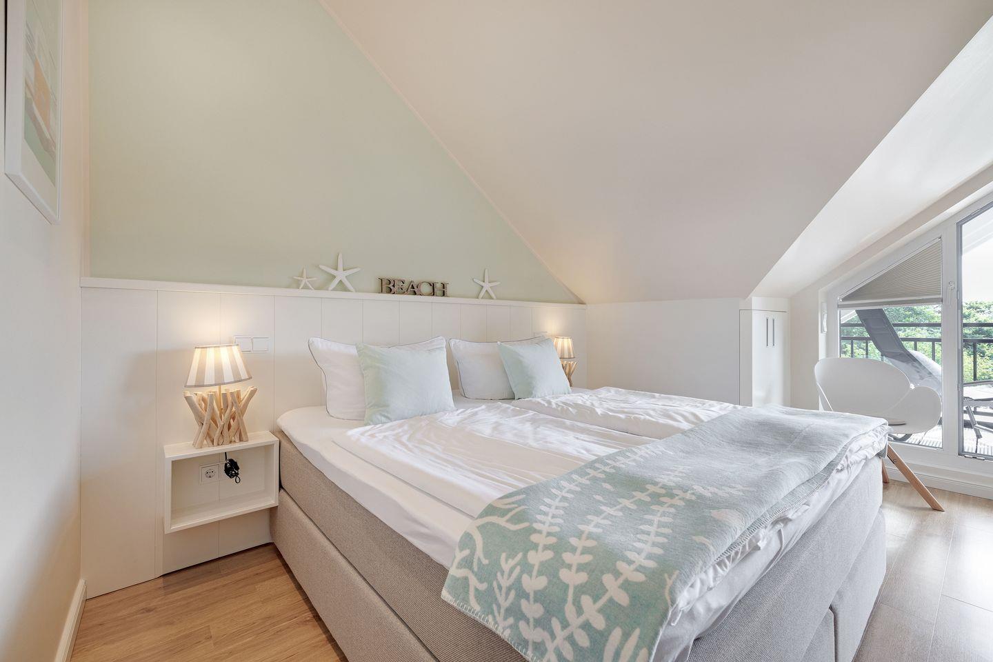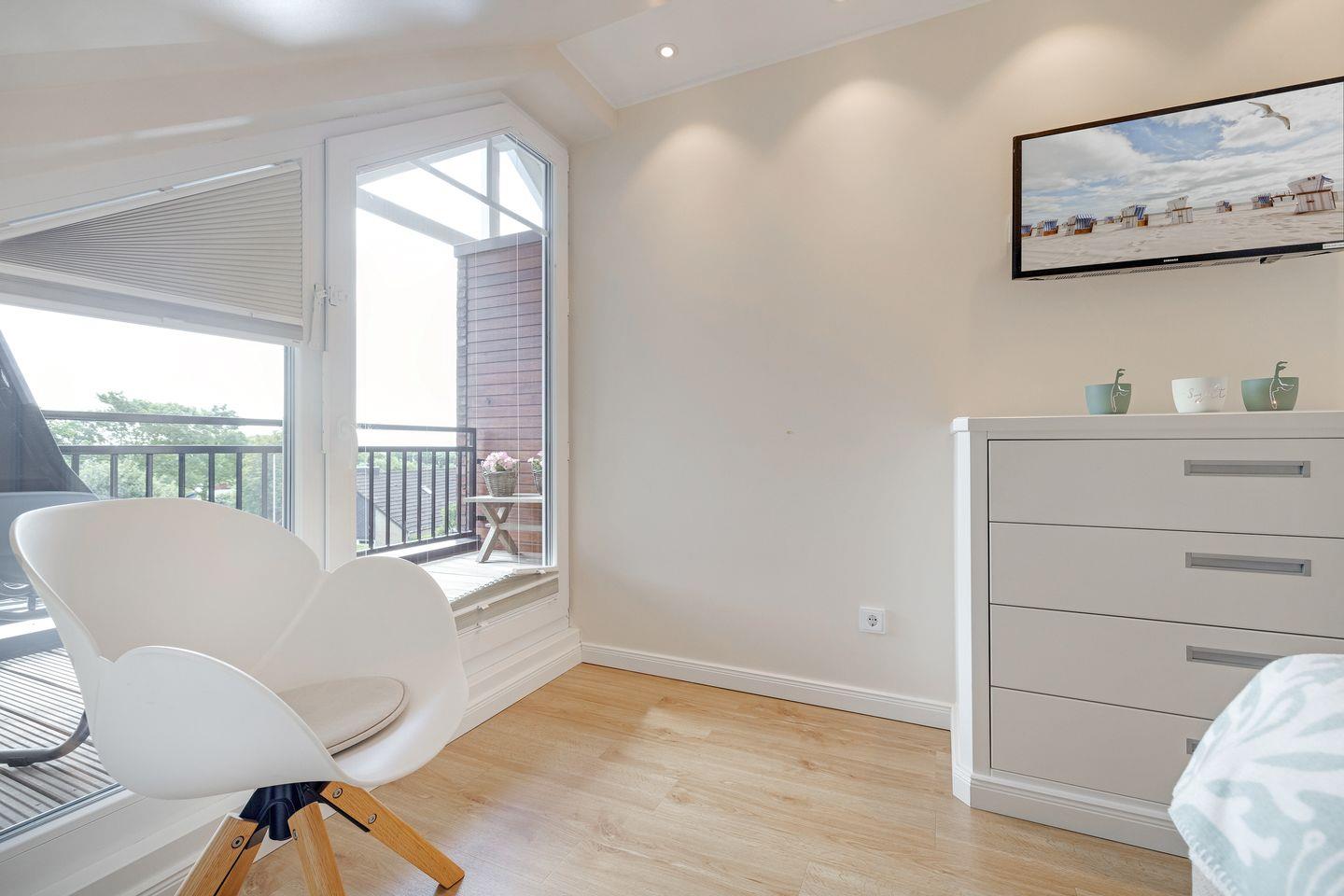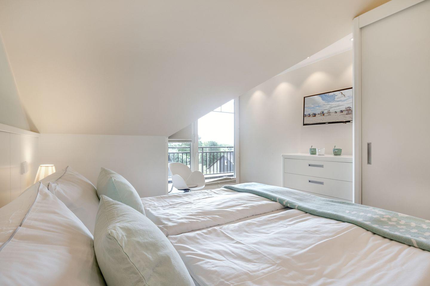 Das helle Schlafzimmer des Appartements bietet Ihnen ein Doppel-Boxspringbett, viel Schrankplatz und einen Flatscreen-TV. Durch die tiefen Fenster und den Zugang zum Balkon, können Sie direkt nach dem Aufwachen die frische Nordseeluft genießen. Das großzügige 12m² Badezimmer des Domizils verfügt über ein bodentiefes Fenster mit viel Tageslicht und eine äußerst komfortable bodenebene Dusche (90cmx145cm) Dusche, sowie einem WC.