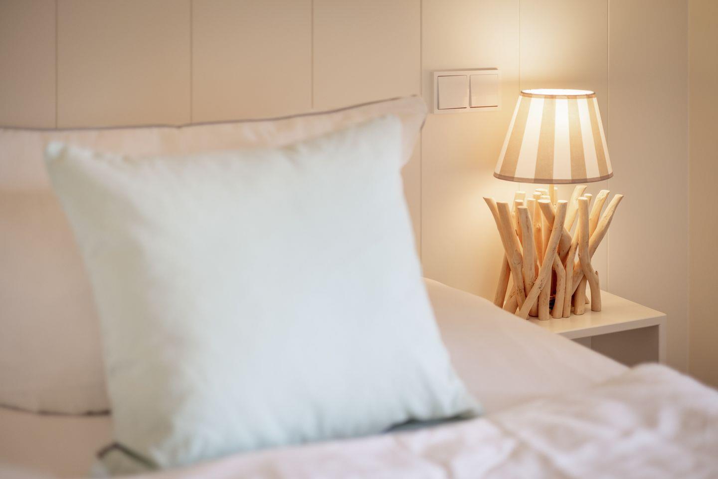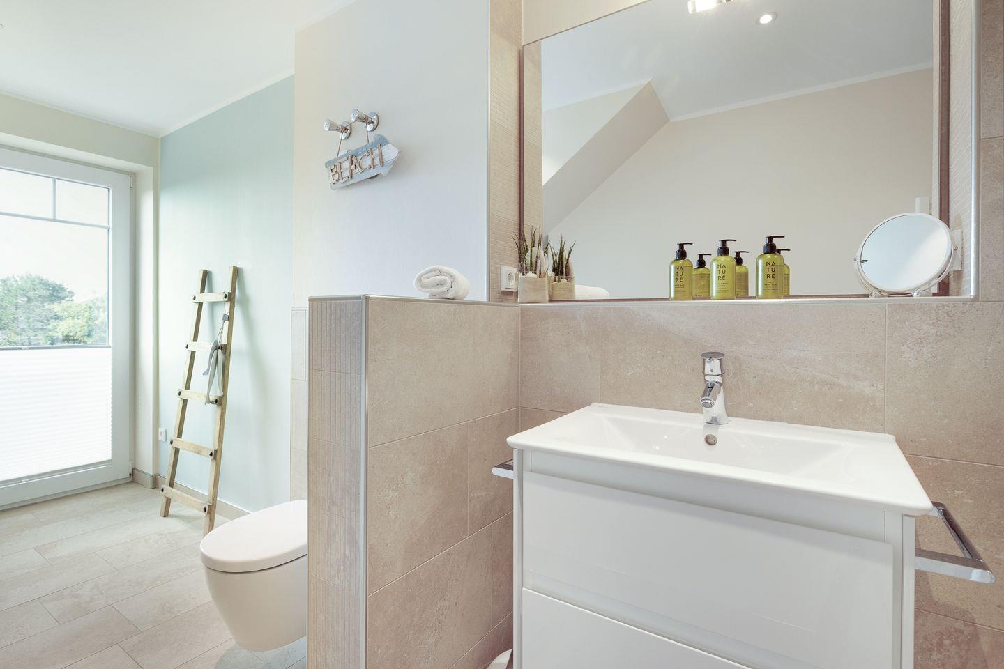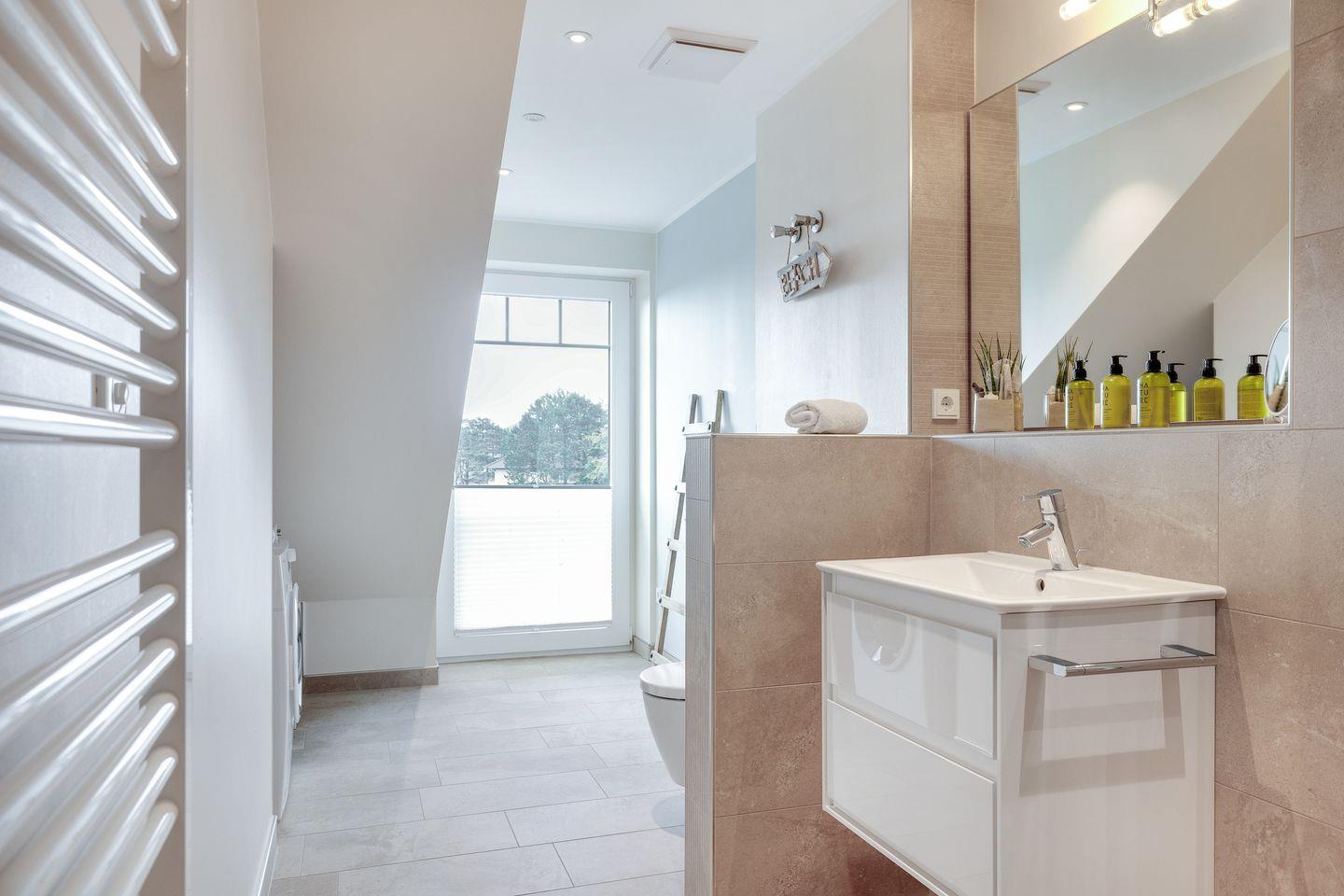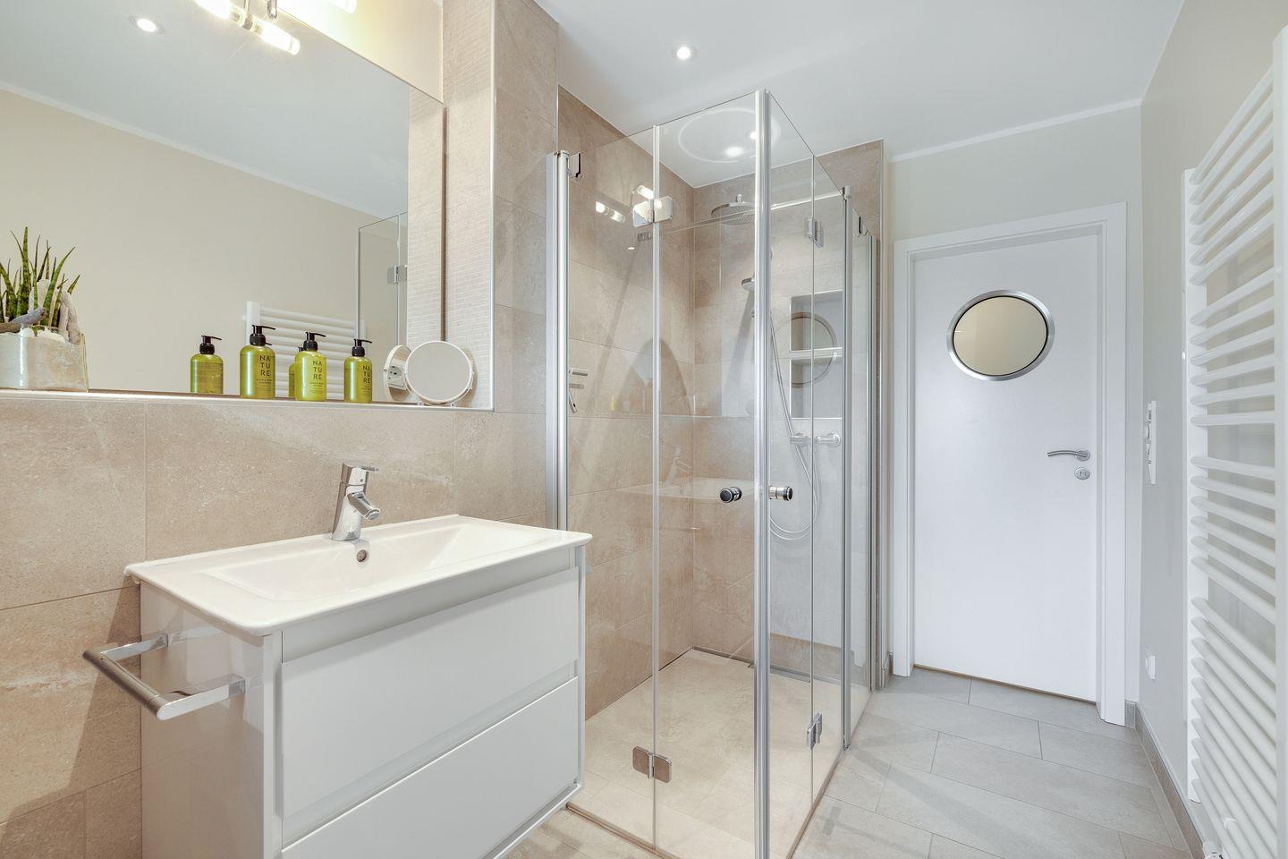 Das helle Schlafzimmer des Appartements bietet Ihnen ein Doppel-Boxspringbett, viel Schrankplatz und einen Flatscreen-TV. Durch die tiefen Fenster und den Zugang zum Balkon, können Sie direkt nach dem Aufwachen die frische Nordseeluft genießen. Das großzügige 12m² Badezimmer des Domizils verfügt über ein bodentiefes Fenster mit viel Tageslicht und eine äußerst komfortable bodenebene Dusche (90cmx145cm) Dusche, sowie einem WC.