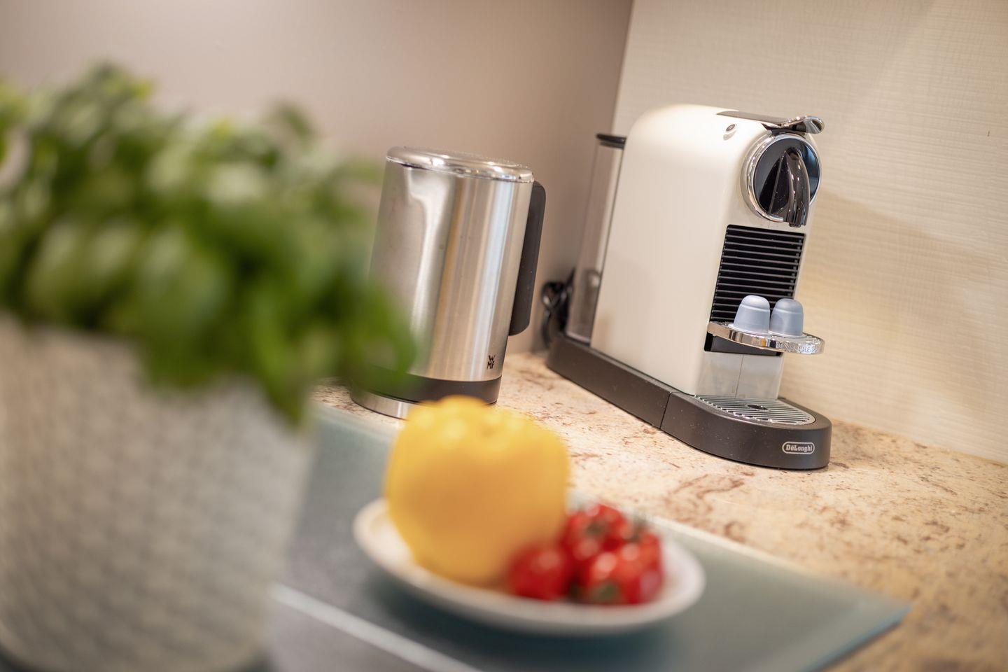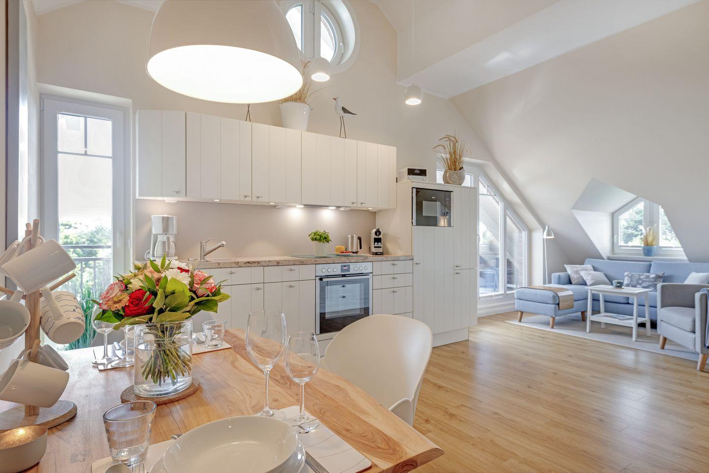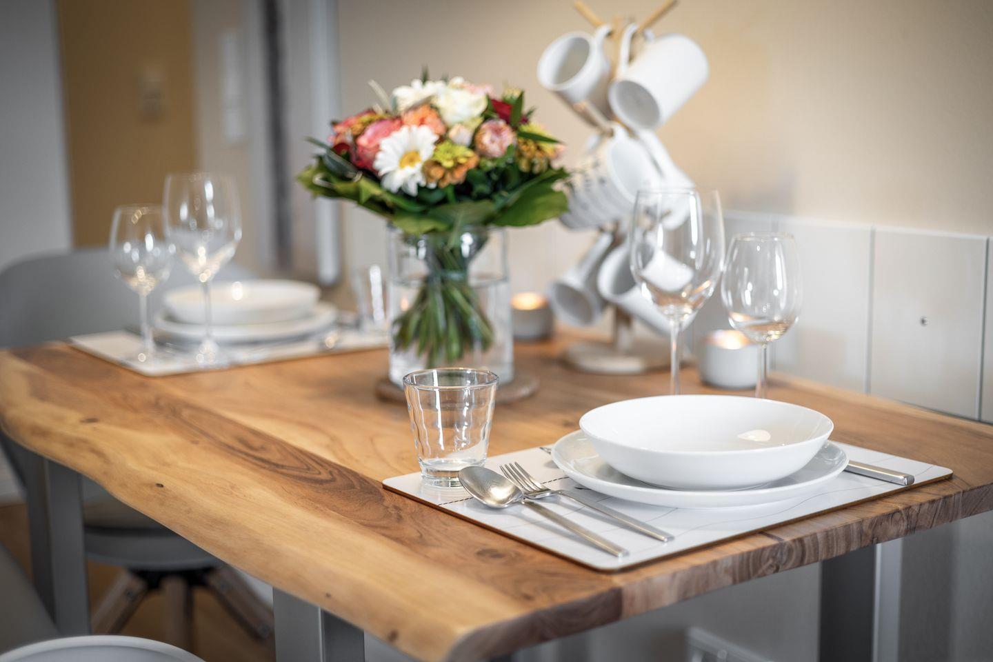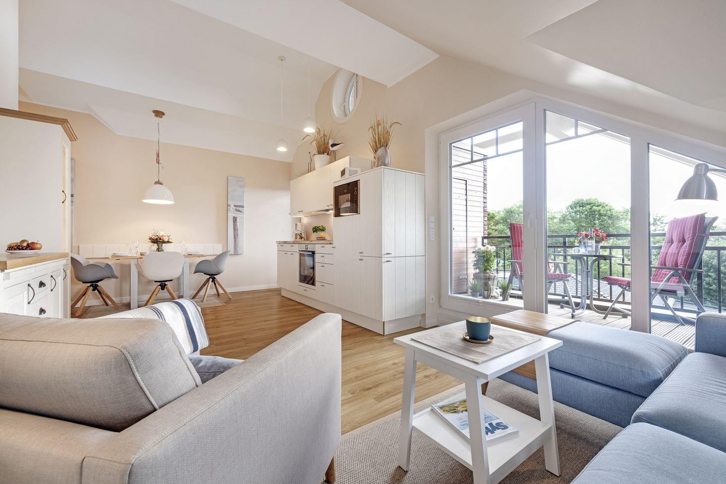 Der großzügige Wohnraum im Domizil mit einer attraktiven Deckenhöhe von teilweise über 3 Metern bietet Ihnen eine gemütliche Couchecke mit Flatscreen-TV, einen schicken, großen Esstisch und eine offen gestaltete Küche, die voll ausgestattet ist. Zaubern Sie sich in der Küche Ihre Mahlzeit und genießen Sie den Vormittag auf einem der insgesamt 2 Balkone, welche getrennt voneinander nutzbar sind und aufgrund ihrer Überdachung bei nahezu jedem Wetter zum Verweilen einladen. Sie gelangen über den Wohnbereich bzw. über das Schlafzimmer zu den jeweiligen Balkonen.