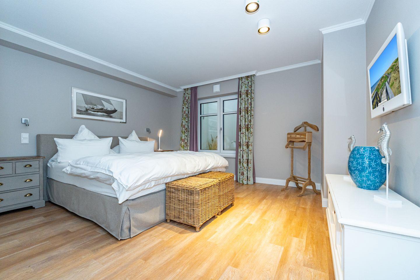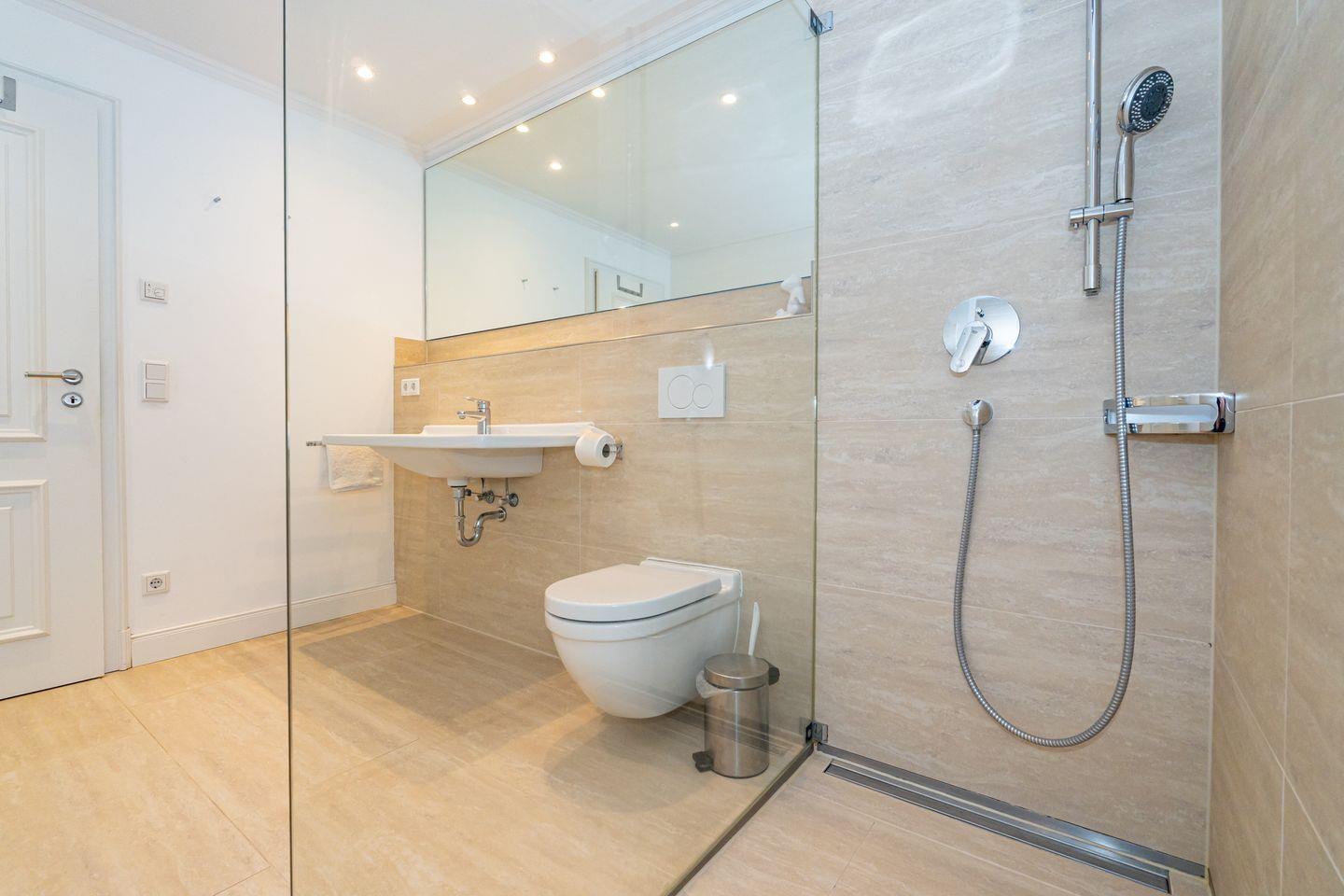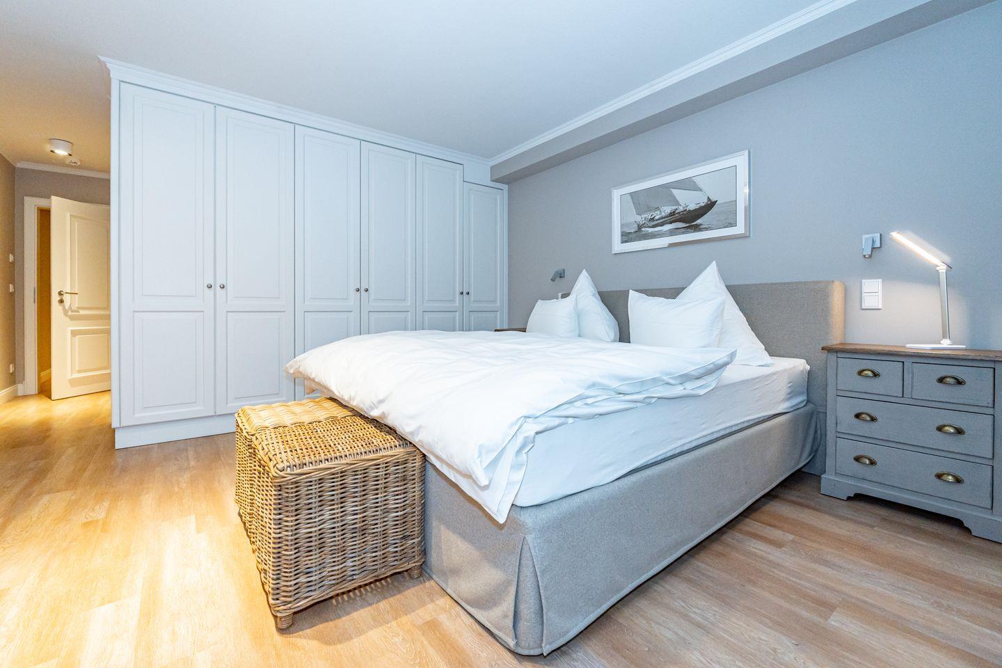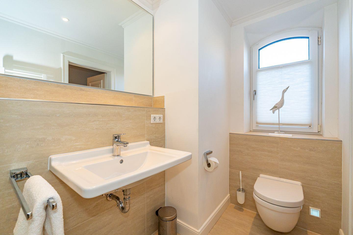 Im Erdgeschoss der Ferienwohnung befindet sich das geräumige Wohnzimmer mit Esstisch und einem gemütlichen Schlafsofa. Von dort aus haben Sie Zugang zur möblierten Terrasse in Südwestausrichtung. Die offene Küche ist mit allem ausgestattet was man benötigt: Backofen, Geschirrspüler, Mikrowelle und einem Kühlschrank mit Gefrierfach. Ebenfalls auf dieser Ebene befindet sich ein Badezimmer mit Dusche. Im Souterrain befindet sich das Schlafzimmer mit Doppelbett und dem zweiten Badezimmer mit Dusche.