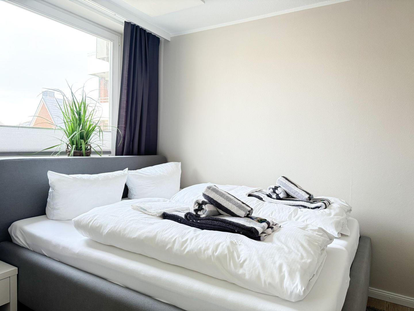 Alle Fenster sind mit Sonnenplisee´s versehen. Zusätzlich sind im Schlafzimmer Verdunklungsgardinen angebracht, welche für erholsamen Schlaf sorgen. In der Wohnung finden Sie Sommer- und Winterbettdecken sowie diverse Kissen für optimalen Schlafcomfort.