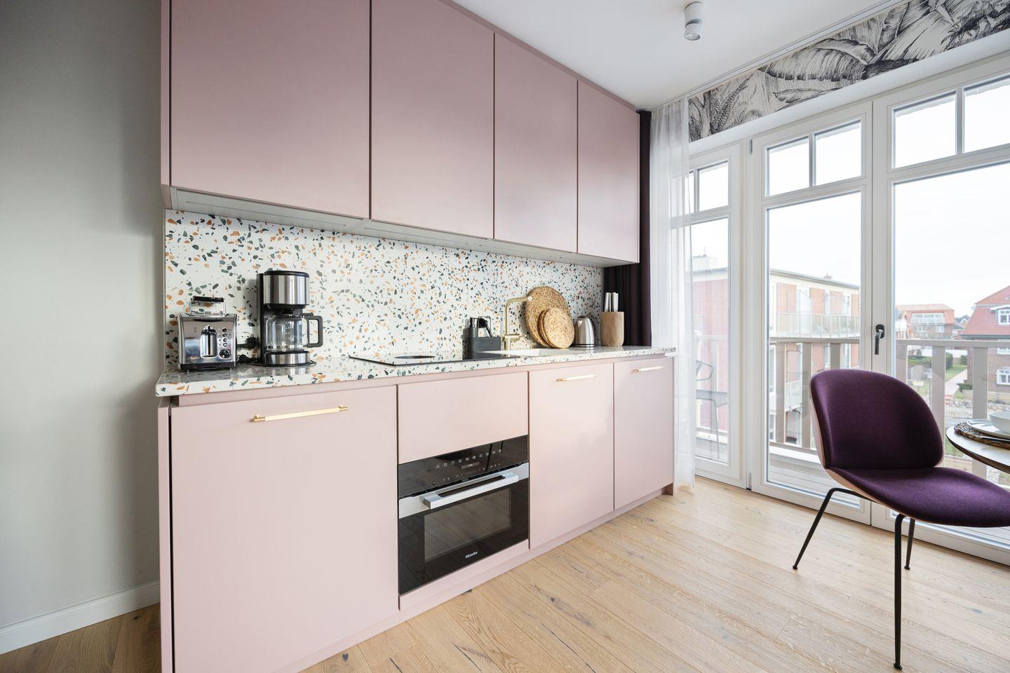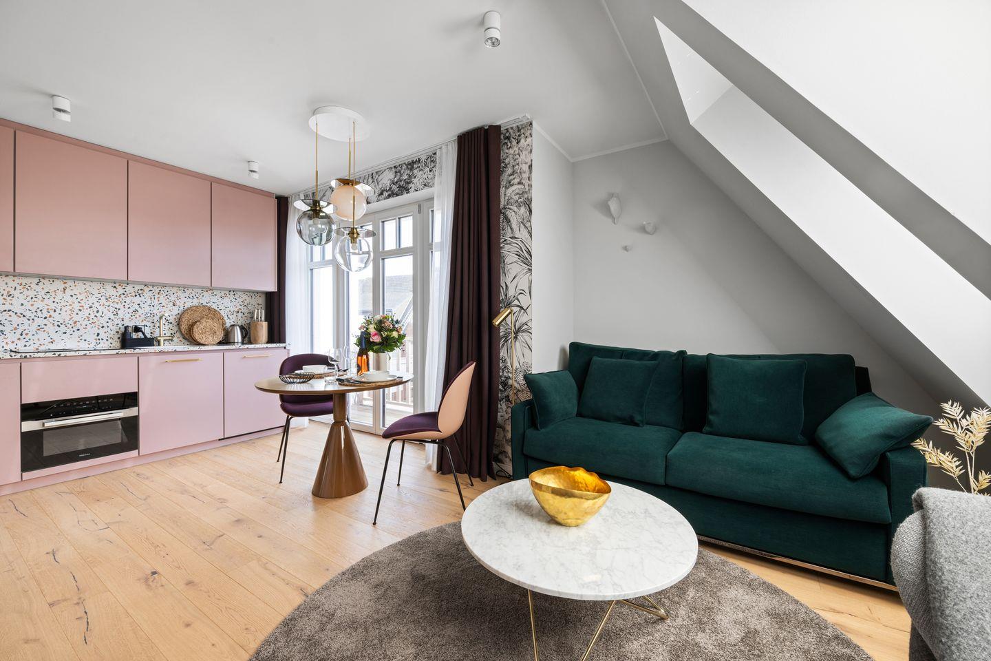 Der gemütliche Wohnbereich verfügt über ein hochwertiges Schlafsofa, das sich in einen zusätzlichen Schlafplatz verwandelt, sodass Sie Ihren Aufenthalt auch mit bis zu 3 Personen genießen können. Vom Wohnzimmer aus haben Sie direkten Zugang zur Loggia. Die vollausgestattete offene Küche mit modernsten Küchengeräten, einer Bora Dunstabzugsanlage und einem Essbereich für entspannte Stunden sorgt für einen Urlaub ganz nach Ihren individuellen Wünschen.