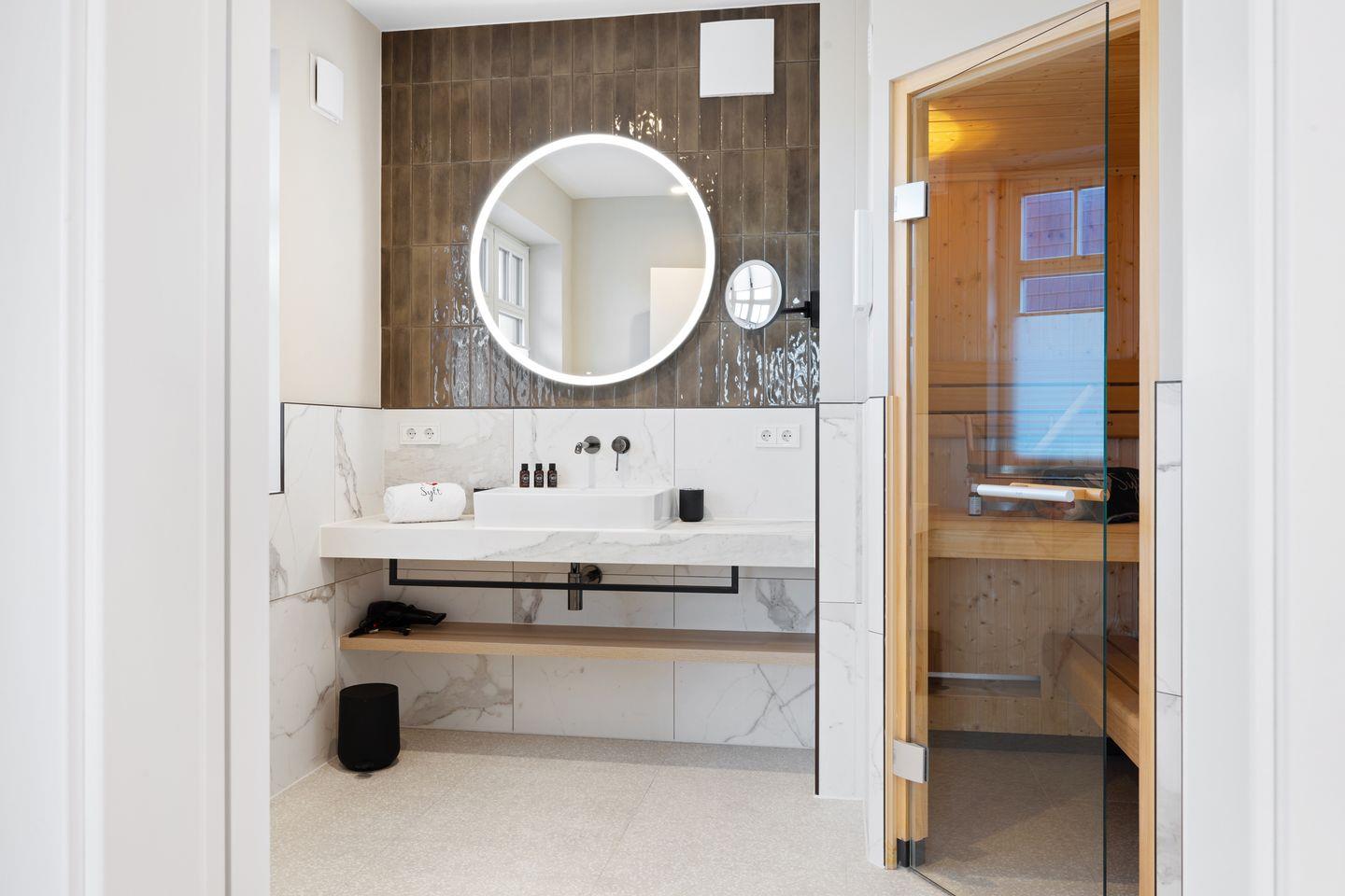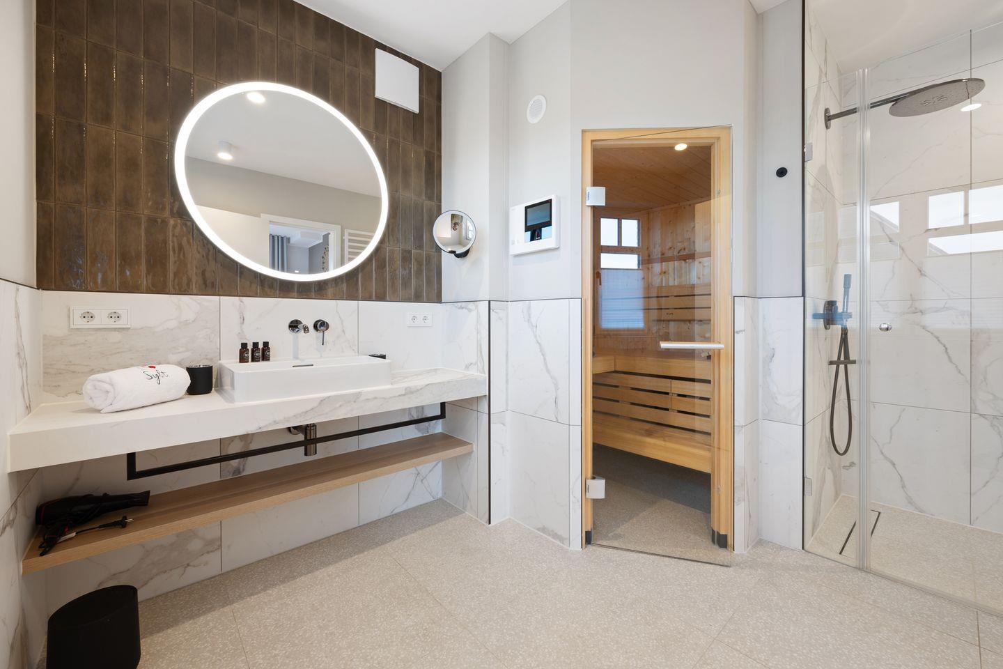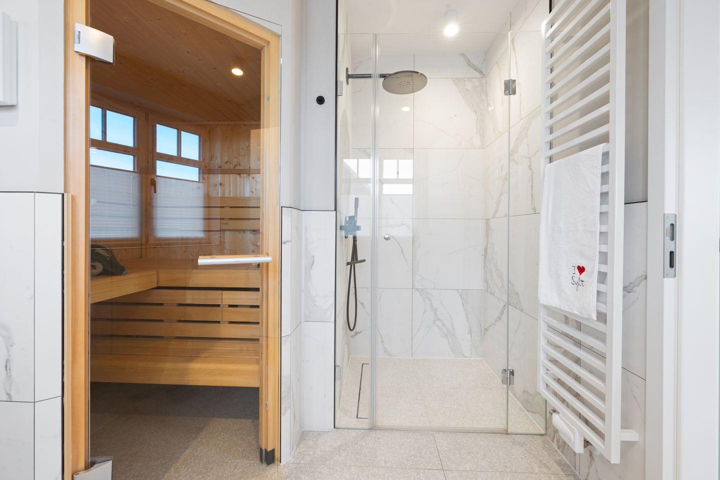 1. Das großzügige Badezimmer punktet mit einer ebenerdigen Regendusche, Sauna, Tageslicht, Fön und einem Handtuchwärmer.
