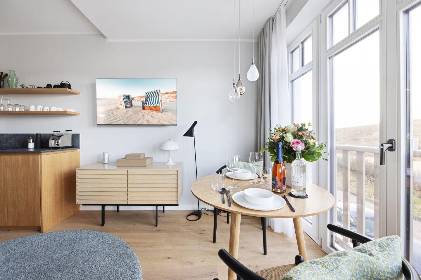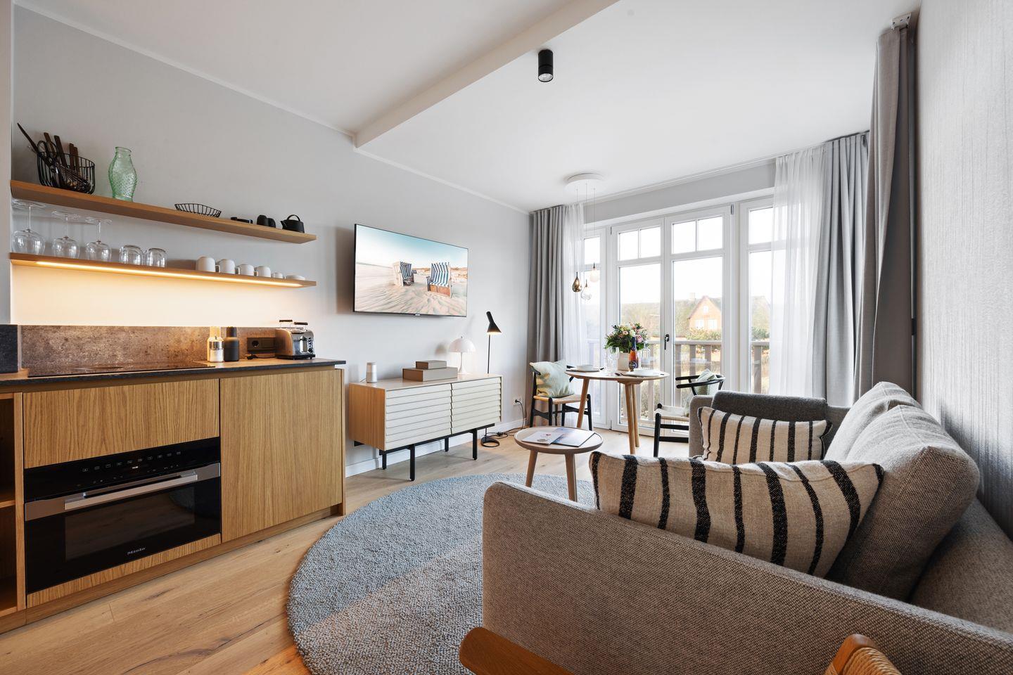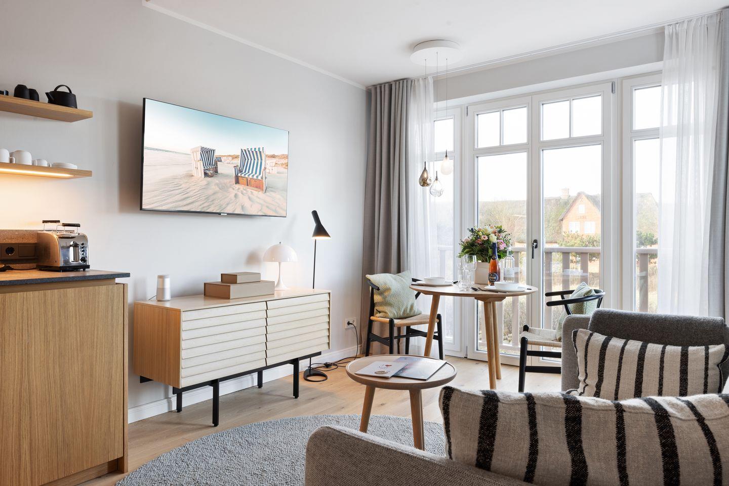 Exklusive 2 Zimmer Ferienwohnung mit Dünenblick auf ca. 54 m² für 2 Personen – eine Oase der Entspannung, inspiriert von der leichten Gelassenheit eines unbeschwerten Sommertages auf Sylt.