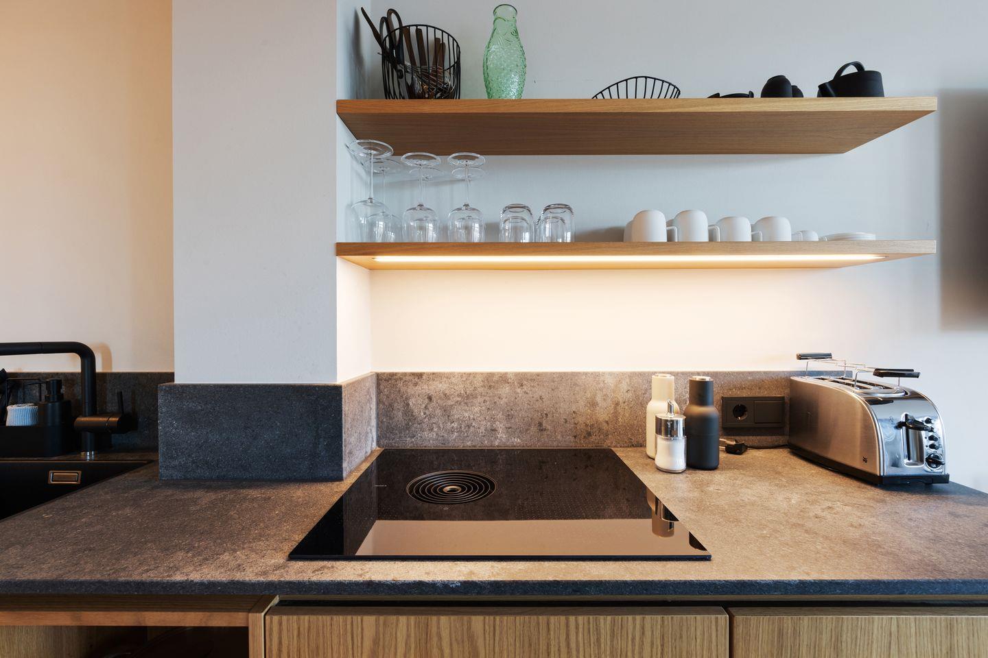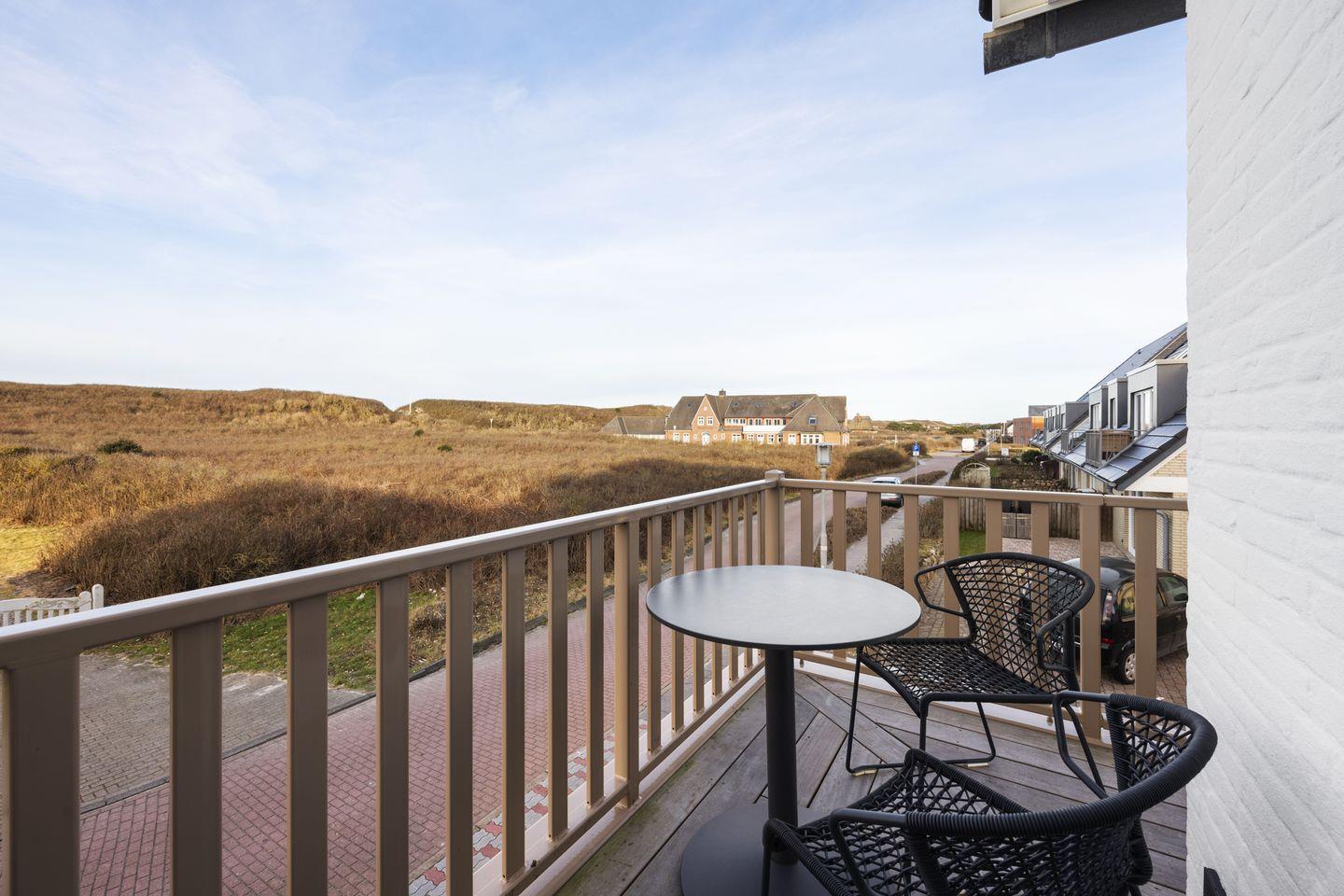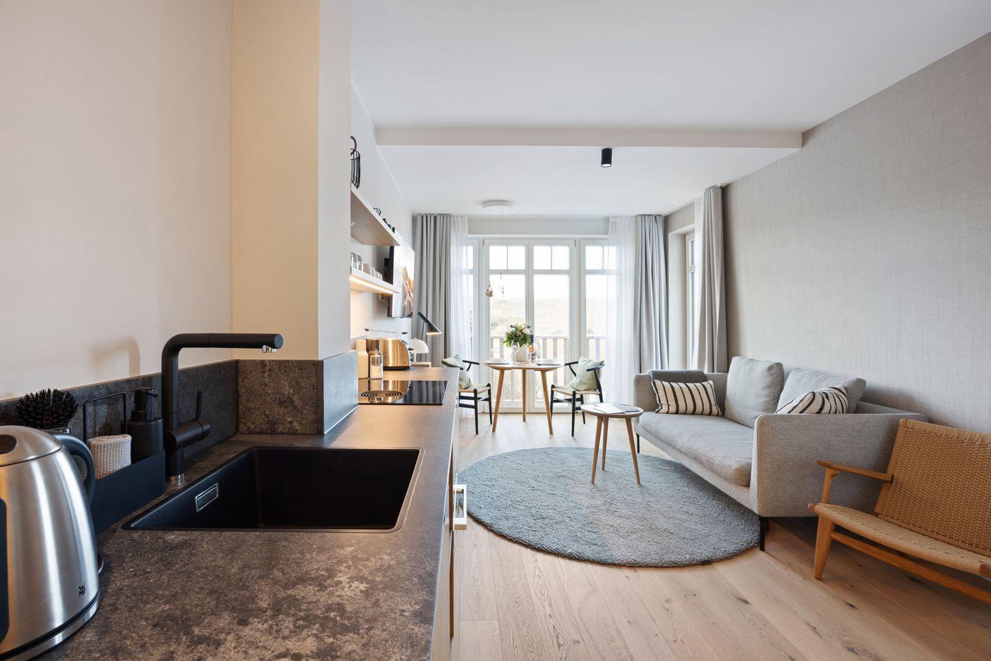 Das Wohnzimmer mit direktem Zugang zum Balkon und Blick auf die schöne Dünenlandschaft zeichnet sich durch einen offenen Wohnkomfort aus, der das moderne und gemütliche Design des Raumes betont. Die einladende offene Küche mit Bora Dunstabzugsanlage lädt dazu ein, gemeinsame Kocherlebnisse zu teilen, während die hochwertige Ausstattung mit modernsten Geräten Ihre kulinarischen Kreationen unterstützt.