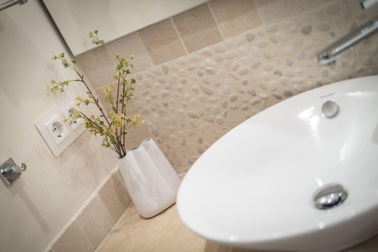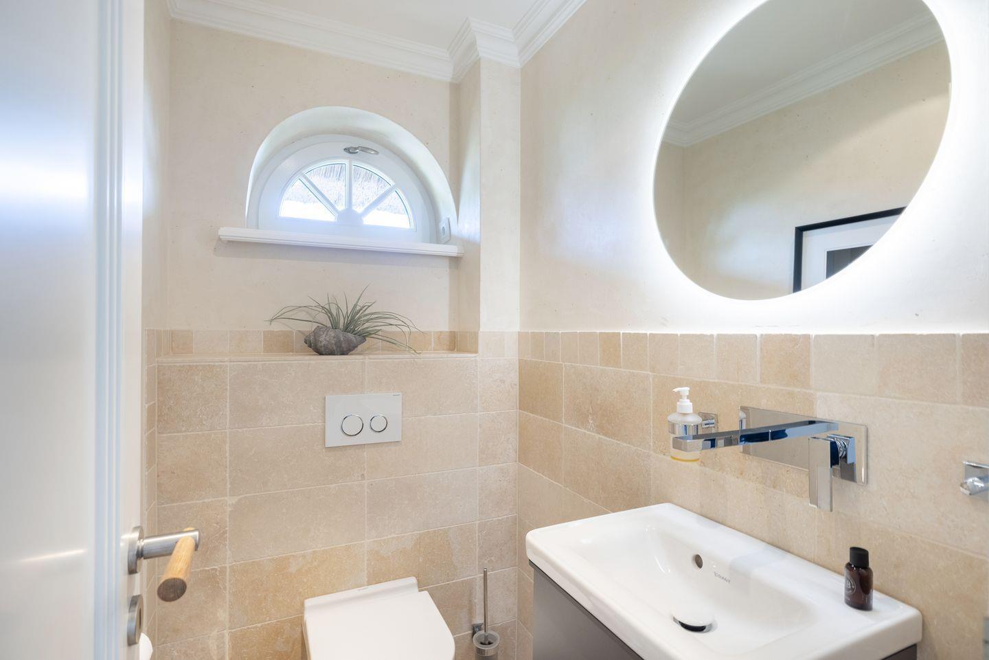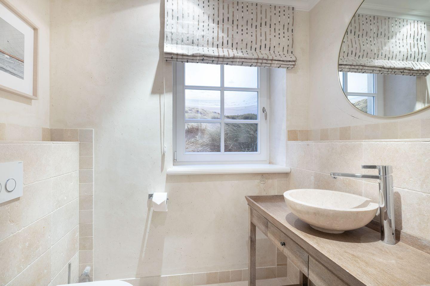 Die beiden stilvollen Badezimmer bieten höchsten Komfort: Ein großzügiges Vollbad im OG verfügt über eine Wanne sowie eine separate Regendusche und Tageslicht für ein besonders angenehmes Ambiente. Das Wellnessbad mit Sauna und geräumiger Regendusche befindet sich im UG und kann als zweites Bad genutzt werden. Das separate WC im UG verfügt über Tageslicht. Ein Gäste-WC im EG steht für zusätzlichen Komfort zur Verfügung. Highlight dieses Ferienhauses ist ein separater Fitnessraum mit Technogym Ausstattung und TV.