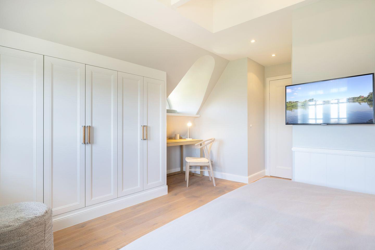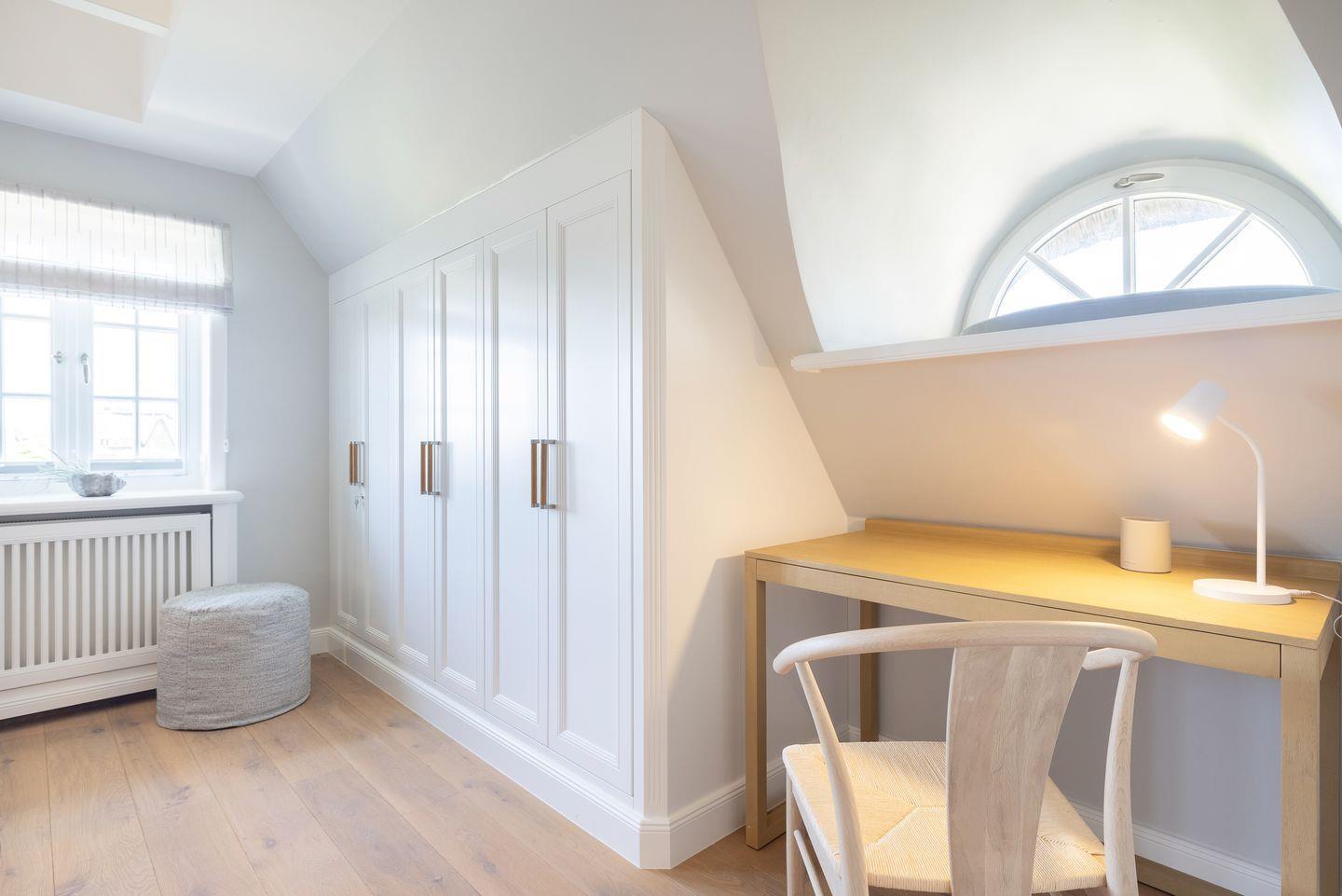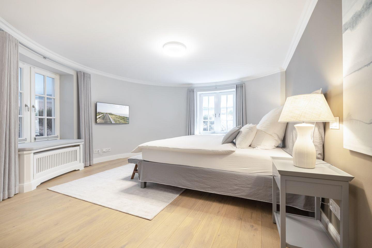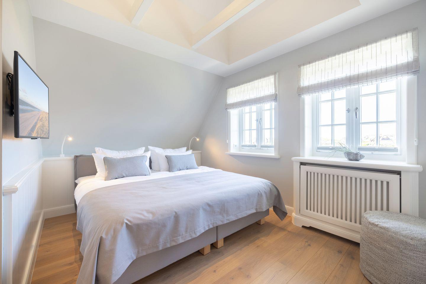 Im Obergeschoss erwarten Sie zwei großzügige Schlafzimmer, die mit hochwertigen Doppelbetten ausgestattet sind und idealen Komfort für erholsame Nächte bieten. Das Hauptschlafzimmer zur Ostseite ermöglicht einen einmaligen Blick über das Wattenmeer und verfügt über ein elektrisch versenkbares TV. Hochwertige Holzeinbauten unterstreichen den luxuriösen Charakter der Einrichtung. Ein weiteres, elegantes Schlafzimmer ist zur Westseite ausgerichtet und mit einem Doppelbett, Kleiderschrank und TV ausgestattet.