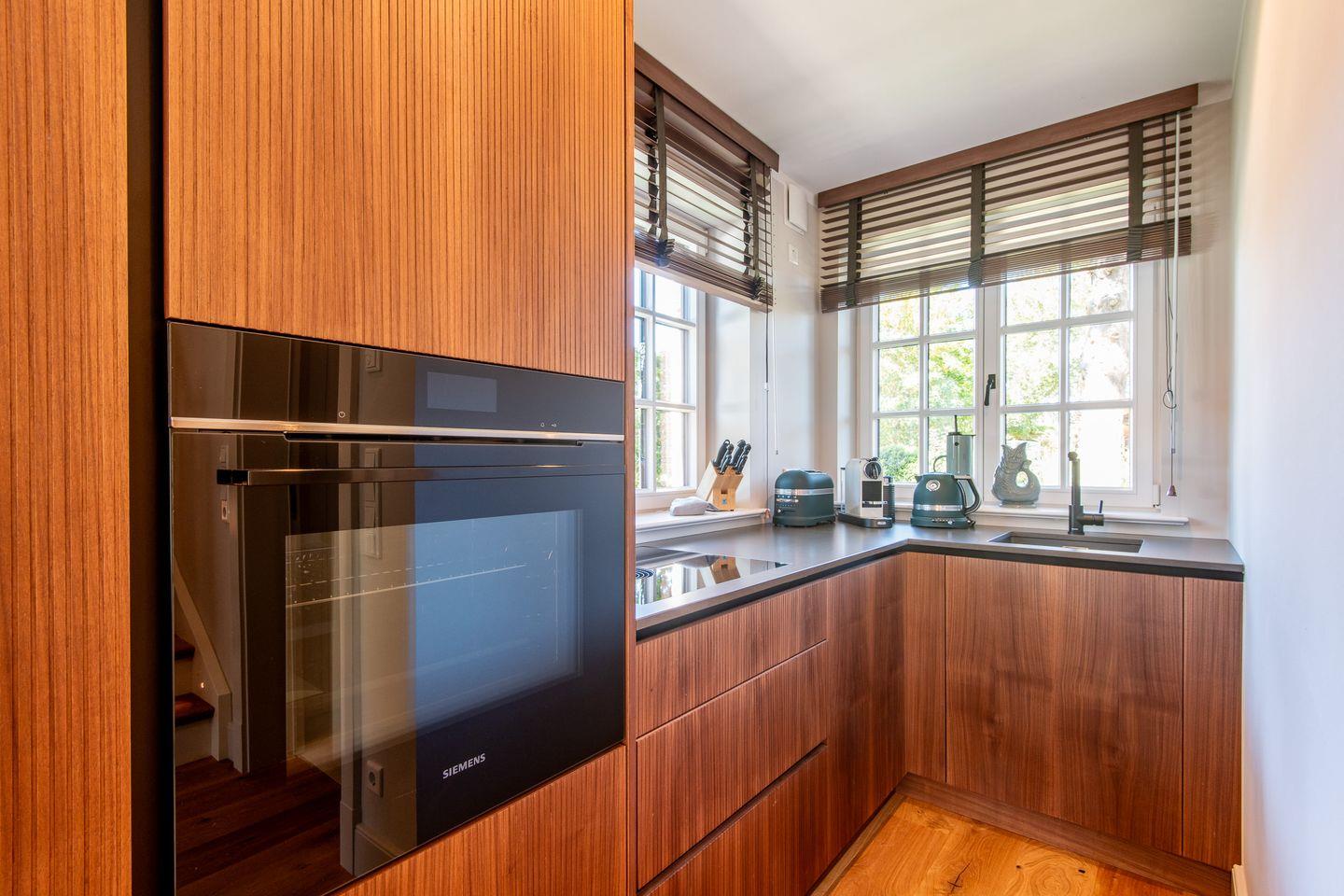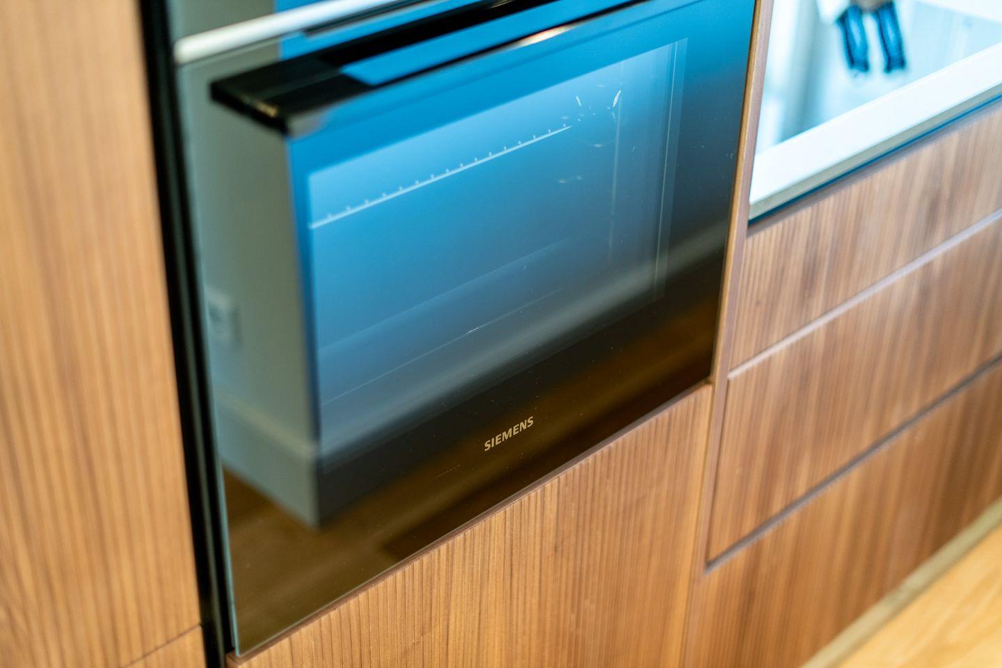 Die offene Küche ist ein echtes Highlight: Mit eleganten Nussbaumholzfronten, Natursteinarbeitsplatte und durchdachter Beleuchtung setzt sie stilvolle Akzente. Moderne Geräte wie das Miele-Induktionskochfeld mit integriertem Wrasenabzug, ein Einbaubackofen mit Dampffunktion und eine großzügige Kühl-/Gefrierkombination bieten jeden Komfort für genussvolles Kochen und gemeinsame Mahlzeiten.