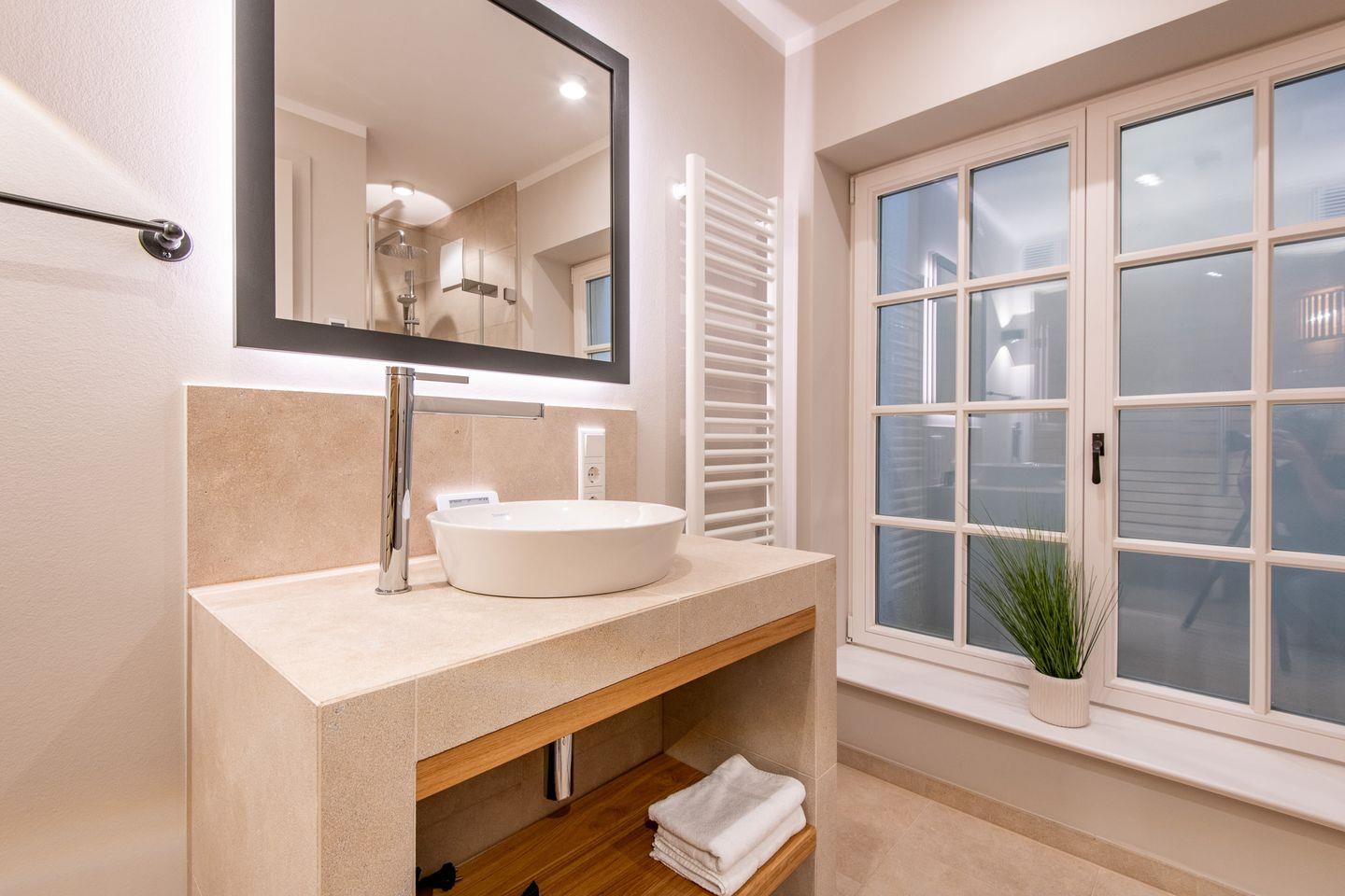 Die beiden modernen Badezimmer sowie ein zusätzliches Gäste-WC bieten höchsten Komfort. Das luxuriöse Wellnessbad mit privater Sauna und bodengleicher Dusche lädt zur puren Entspannung ein, während das zweite Badezimmer mit Doppelwaschtisch, Tageslicht, bodengleicher Dusche, separatem WC und Handtuchwärmer ebenfalls eine ideale Wohlfühl-Oase darstellt.
