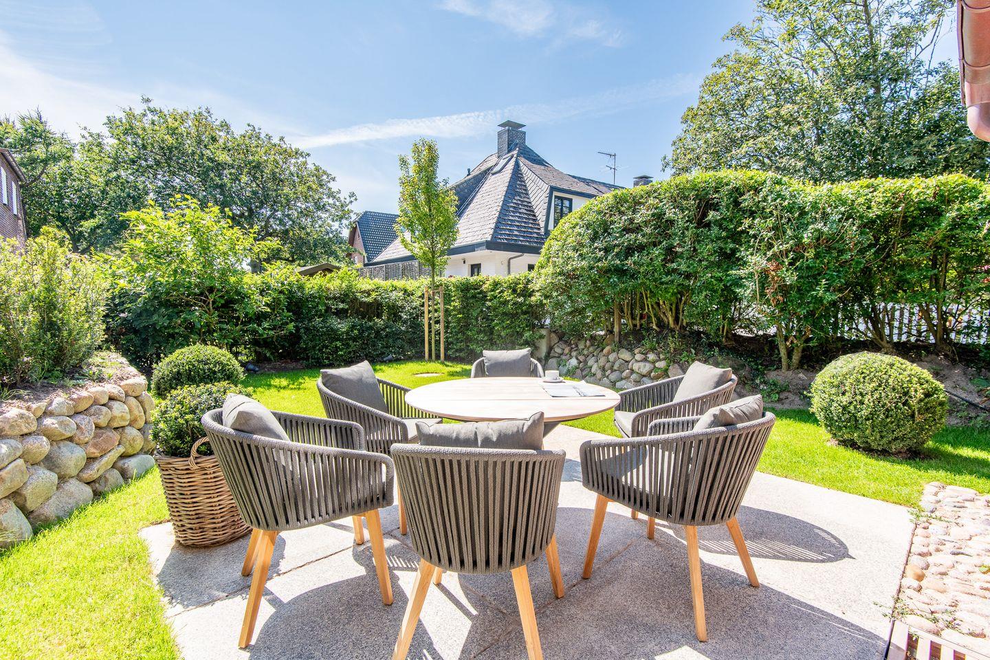 Der Außenbereich bietet eine sonnige Natursteinterrasse und einen schön angelegten Garten, umgeben von einem traditionellen Friesenwall. Hier finden Sie den idealen Ort zum Entspannen und Genießen der Ruhe – sei es zum Sonnenbaden oder für ein geselliges Abendessen im Freien.