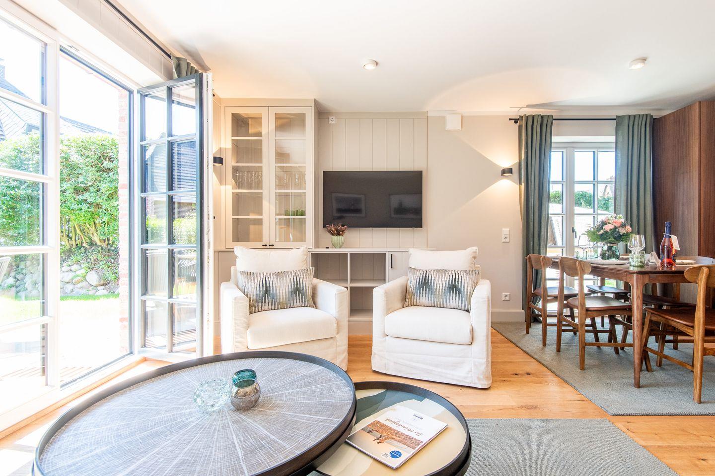 Im großzügigen Wohn- und Esszimmer laden ein gemütliches Sofa und ein Esstisch für bis zu 6 Personen zum Verweilen ein. Der Raum öffnet sich zur Süd- und Westterrasse mit Blick in den eigenen Garten – ein Ort, um die Sonne und die frische Nordseeluft in privater Atmosphäre zu genießen. Stilvolle Details und eine moderne Ausstattung machen den Wohnbereich zu einem Rückzugsort der Erholung.
