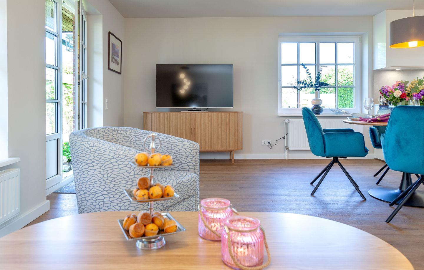 Entspannen Sie sich im Wohnbereich vor dem Smart-TV oder nutzen Sie die gemütliche Terrasse im großen blickdicht eingewachsenen Garten, der mit einem Strandkorb, Gartenmöbeln und Sonnenliegen ausgestattet ist.