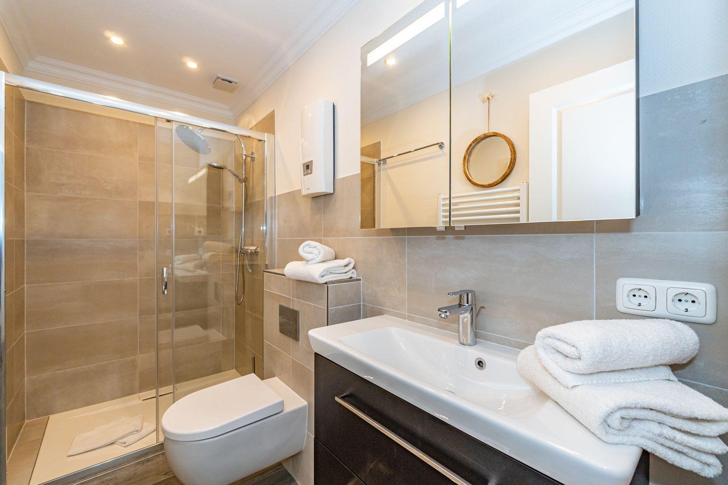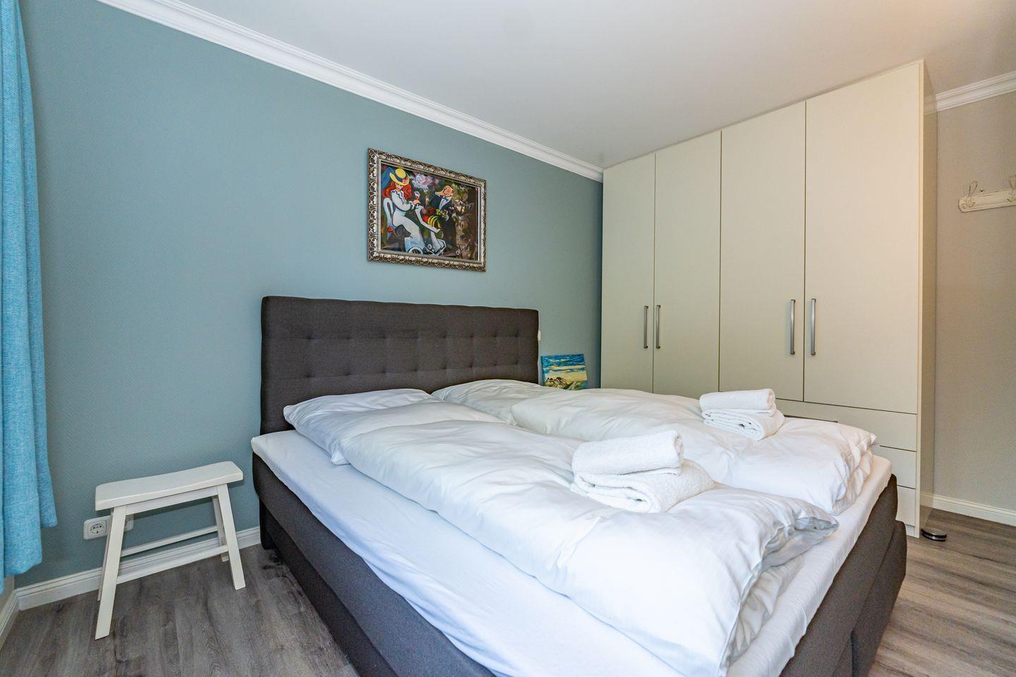 Ein Glas Wein in der Nachmittagssonne oder das Abendessen können Sie hier entspannt genießen. Die offene vollausgestattete Küche ermöglicht es Ihnen sich auch im Urlaub jederzeit Ihre Lieblingsspeisen zuzubereiten. Ein gemütliches Boxspringbett, sowie ein geräumiger Kleiderschrank und ein Smart TV erwarten Sie im Schlafzimmer. Die Ferienwohnung verfügt über ein weiteres kleines Schlafzimmer mit Einzelbett. Das Badezimmer ist mit Regendusche, WC und Waschtisch ausgestattet. Ein eigener Parkplatz steht Ihnen am Haus zur Verfügung.