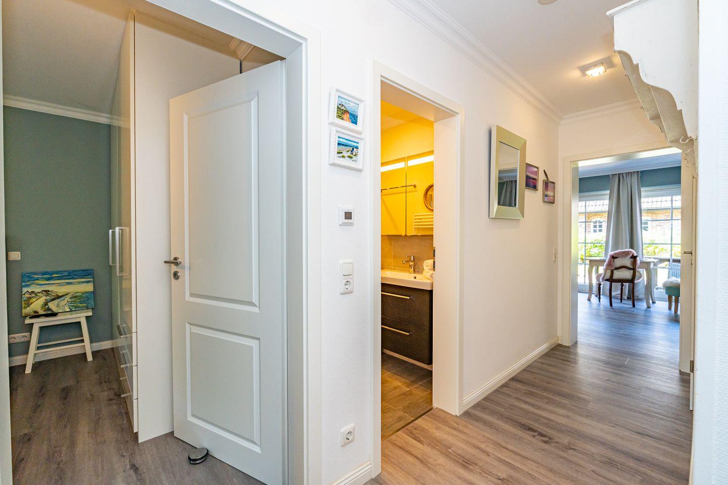 Die wundervolle Ferienwohnung Nis Puk begrüßt Sie im Süden von Westerland ebenerdig auf 64 qm und bietet Platz für bis zu drei Personen. Das großzügige, lichtdurchflutete Wohn/ Esszimmer verspricht gemütliche Stunden in heimeliger Atmosphäre. Von hier aus gelangen Sie auch auf die teilweise überdachte West-Terrasse mit kleinem Gartenanteil.
