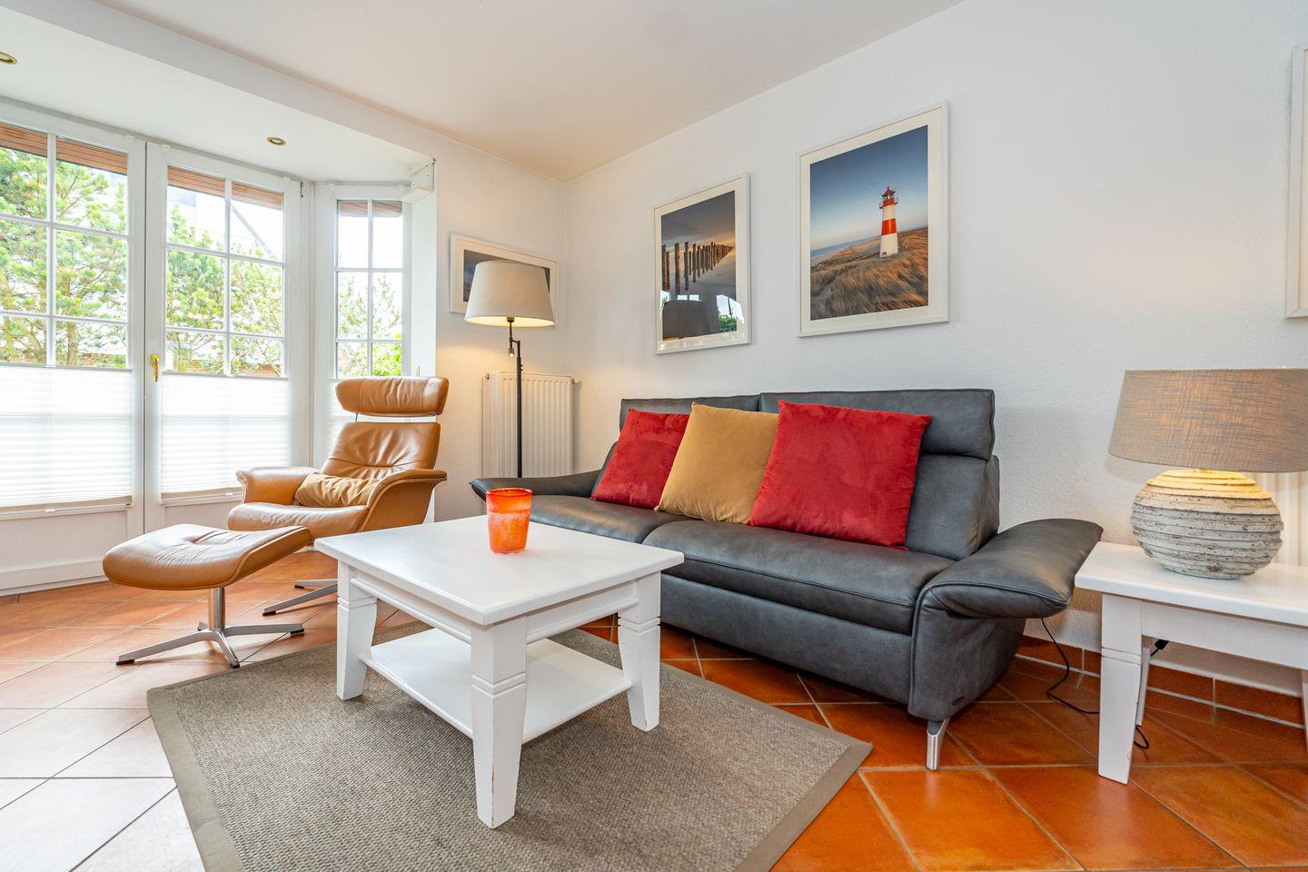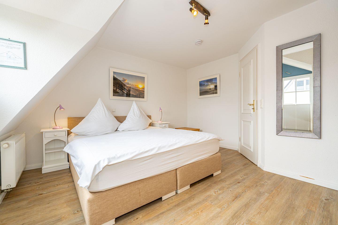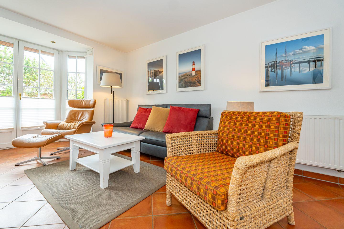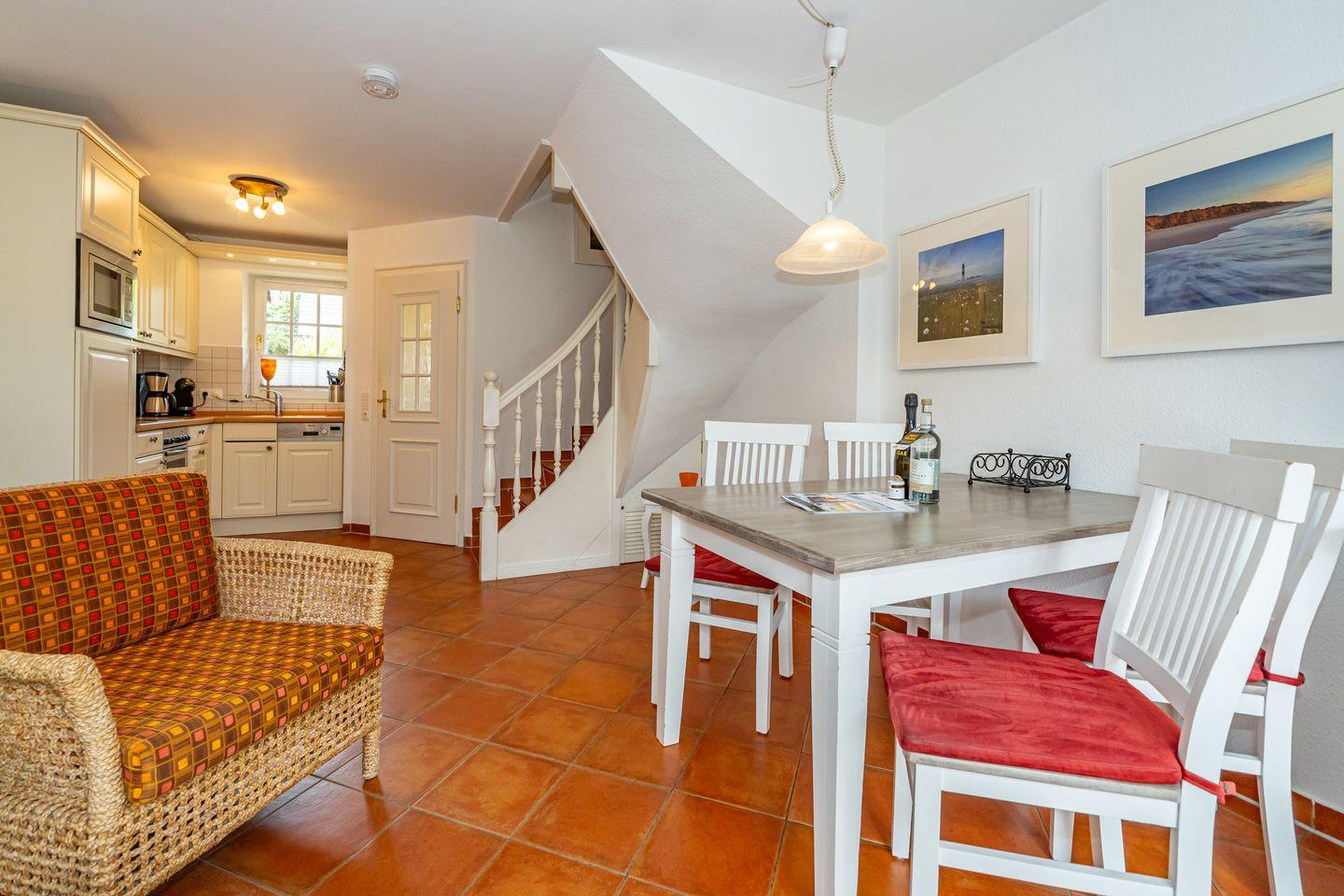 Im Erdgeschoss befindet sich eine gemütliche Sitzecke mit zwei Sesseln, einer bequemen Couch und einem großen Fernseher. Von dort aus erreichen Sie die Terrasse, umgeben von einem traditionellen Friesenwall mit seinen Sylter Rosen, mit komfortablen Sitzmöbeln und selbstverständlich fehlt auch der typische Sylter Strandkorb nicht (saisonal). Eine voll ausgestattete, offene Küchenzeile mit 4 Platten Ceranfeld, Backofen, Spülmaschine, Toaster, Wasserkocher, Kaffeemaschine, Mikrowelle und Dolce Gusto- Kaffeekapselmaschine, sowie eine Essecke, befindet sich ebenfalls in dem offen gestalteten Wohnbereich. Ein Gäste WC befindet sich im Eingangsbereich des Hauses. Im ersten Obergeschoss finden Sie ein helles, großzügiges Schlafzimmer mit Doppelbett, TV, Kleiderschrank und einem Zugang zu Ihrem Balkon. Neben dem Schlafzimmer liegt das großzügige Badezimmer mit Dusche und Badewanne. Das zweite Schlafzimmer liegt im Dachgeschoss und ist im offene Galeriestil ohne Zimmertür. Außerdem stehen Ihnen in der Unterkunft ein Radio, ein CD-Player und ein Blue-Ray-Player zur Verfügung. Der kostenlose Internetzugang mit WLAN ist ebenso wie ein Parkplatz vorhanden.