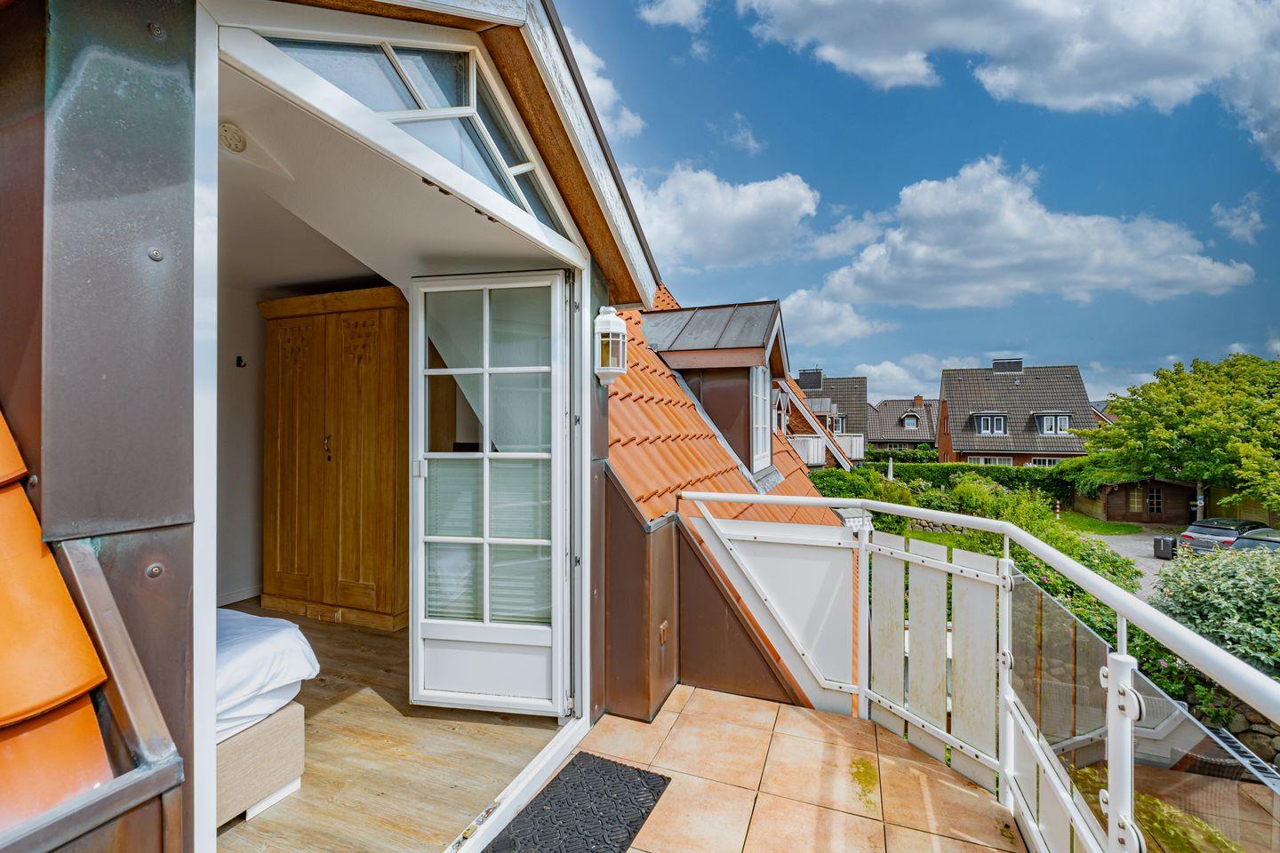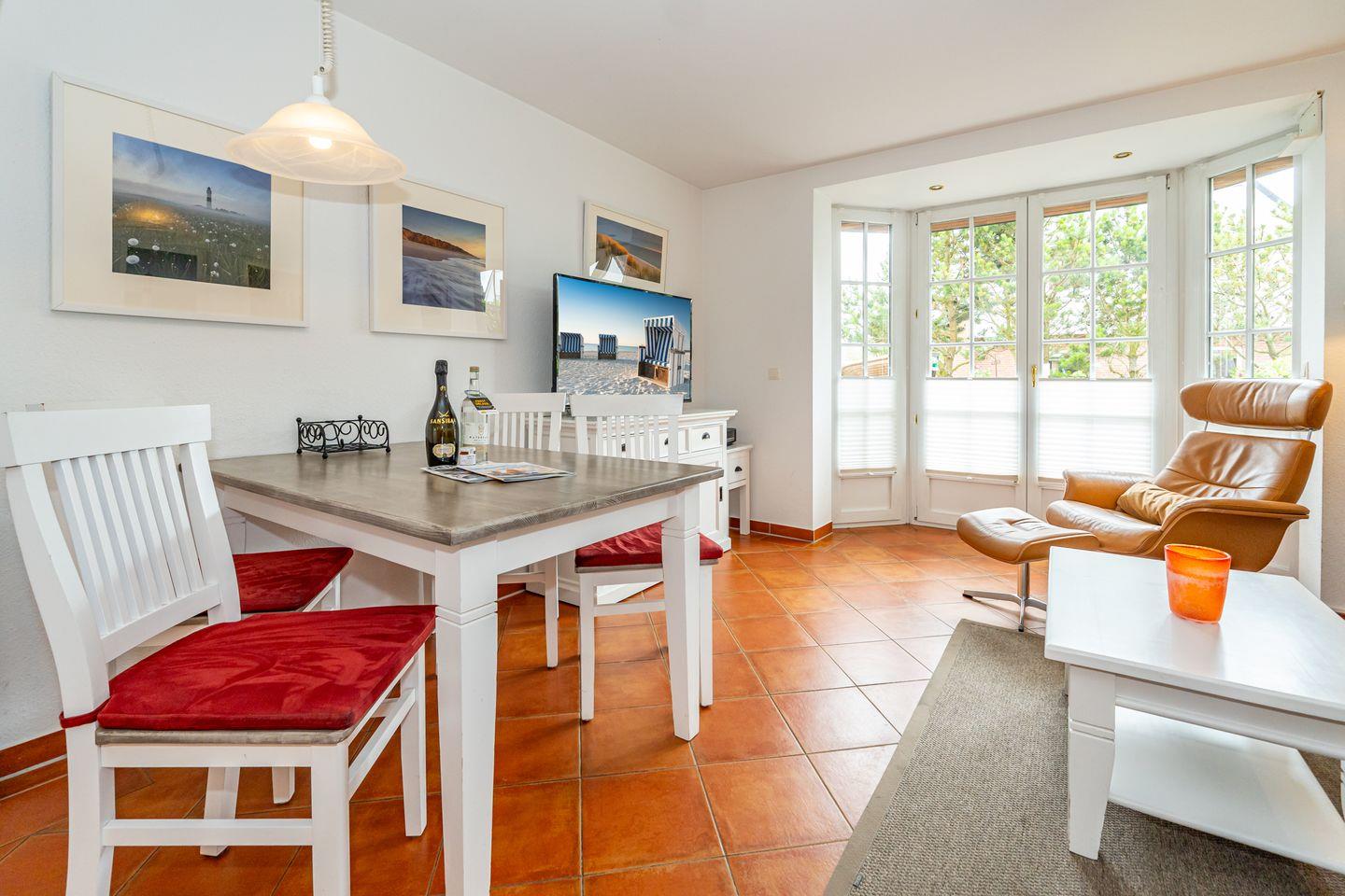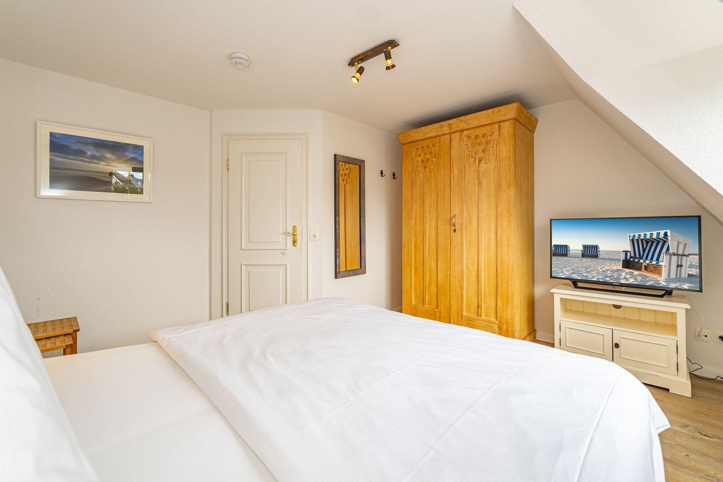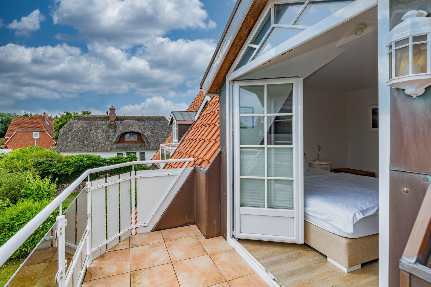 Im Erdgeschoss befindet sich eine gemütliche Sitzecke mit zwei Sesseln, einer bequemen Couch und einem großen Fernseher. Von dort aus erreichen Sie die Terrasse, umgeben von einem traditionellen Friesenwall mit seinen Sylter Rosen, mit komfortablen Sitzmöbeln und selbstverständlich fehlt auch der typische Sylter Strandkorb nicht (saisonal). Eine voll ausgestattete, offene Küchenzeile mit 4 Platten Ceranfeld, Backofen, Spülmaschine, Toaster, Wasserkocher, Kaffeemaschine, Mikrowelle und Dolce Gusto- Kaffeekapselmaschine, sowie eine Essecke, befindet sich ebenfalls in dem offen gestalteten Wohnbereich. Ein Gäste WC befindet sich im Eingangsbereich des Hauses. Im ersten Obergeschoss finden Sie ein helles, großzügiges Schlafzimmer mit Doppelbett, TV, Kleiderschrank und einem Zugang zu Ihrem Balkon. Neben dem Schlafzimmer liegt das großzügige Badezimmer mit Dusche und Badewanne. Das zweite Schlafzimmer liegt im Dachgeschoss und ist im offene Galeriestil ohne Zimmertür. Außerdem stehen Ihnen in der Unterkunft ein Radio, ein CD-Player und ein Blue-Ray-Player zur Verfügung. Der kostenlose Internetzugang mit WLAN ist ebenso wie ein Parkplatz vorhanden.