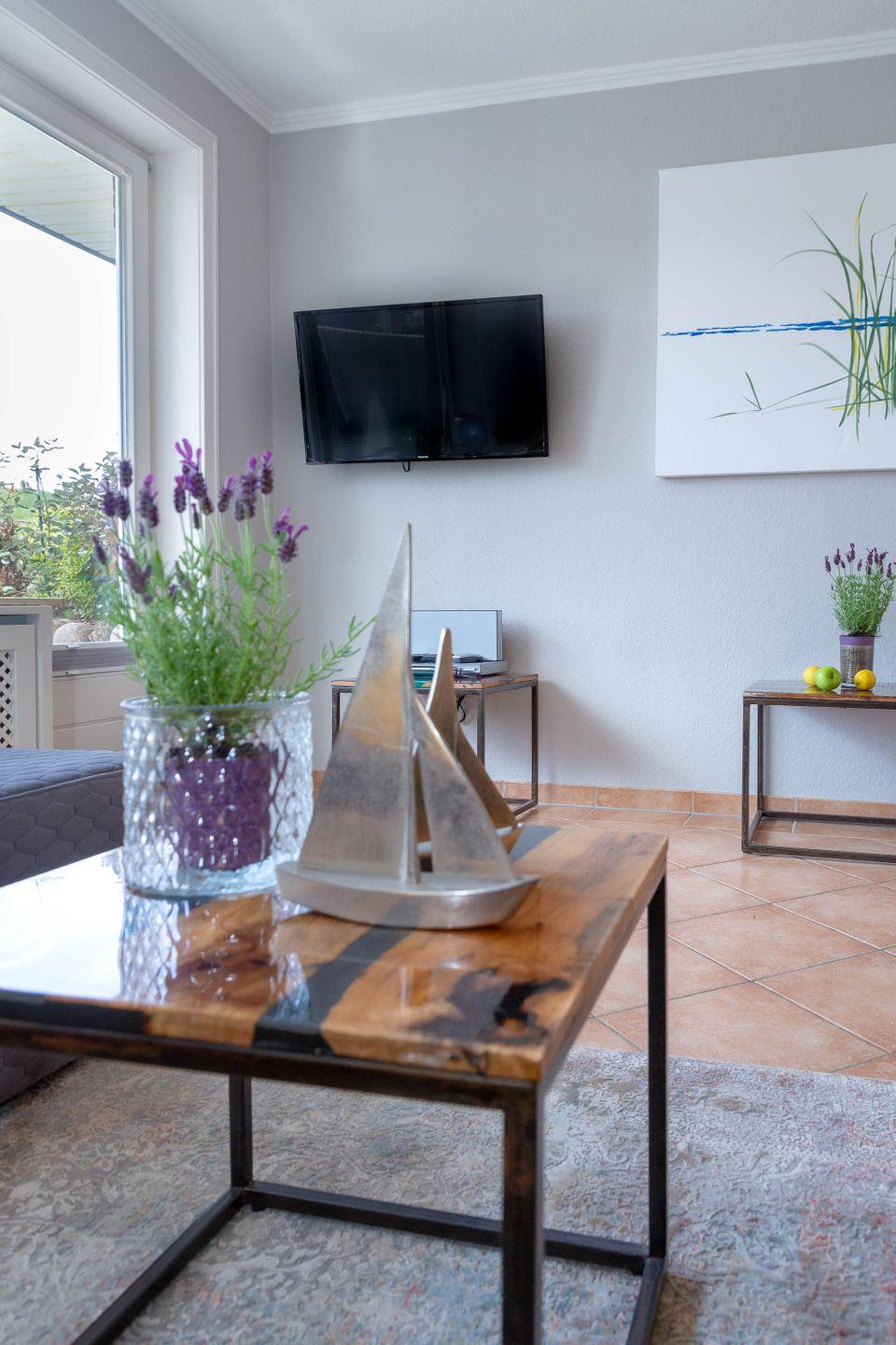 Die helle Erdgeschosswohnung ist ideal für 2-3 Personen und bietet eine separate Küche mit einer Esstischgruppe für 4 Personen, einem Cerankochfeld, Geschirrspüler sowie einem Mikrowellenbackofen. Vom Flur aus gelangt man ins Duschbad, in den Souterrain zum Schlafzimmer mit Flat TV und Einbauschränken. Im Wohnzimmer befindet sich eine bequeme Schlafcouch, Flat TV, Stereoanlage und DVD Player. Vom Wohnzimmer aus haben Sie Zugang zur sonnigen Terrasse, auf dem ein Strandkorb sowie Tisch und Stühle für Sie bereit stehen.
