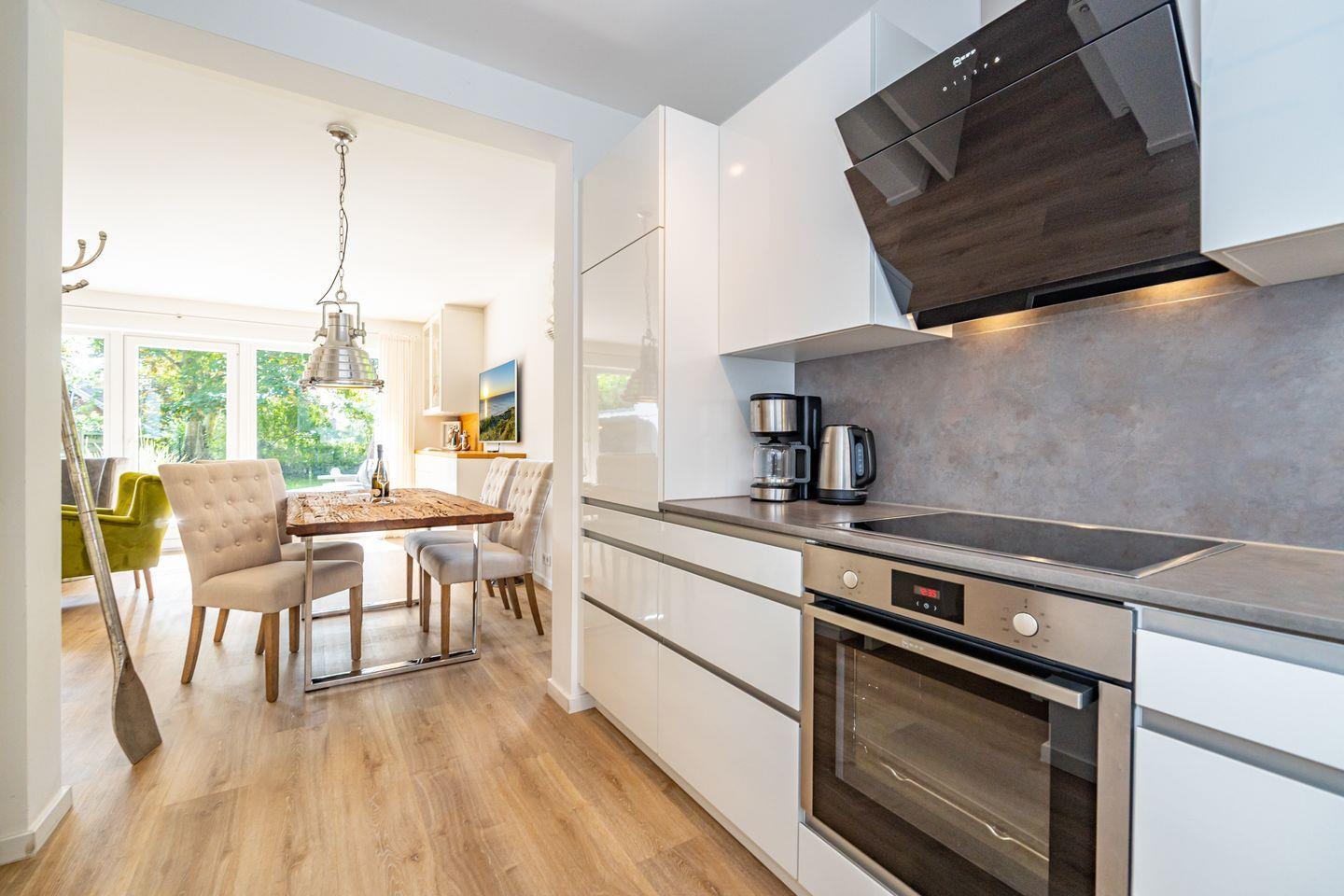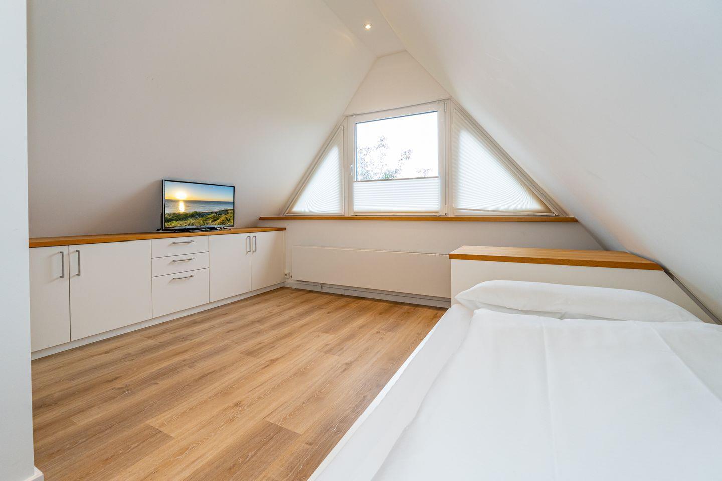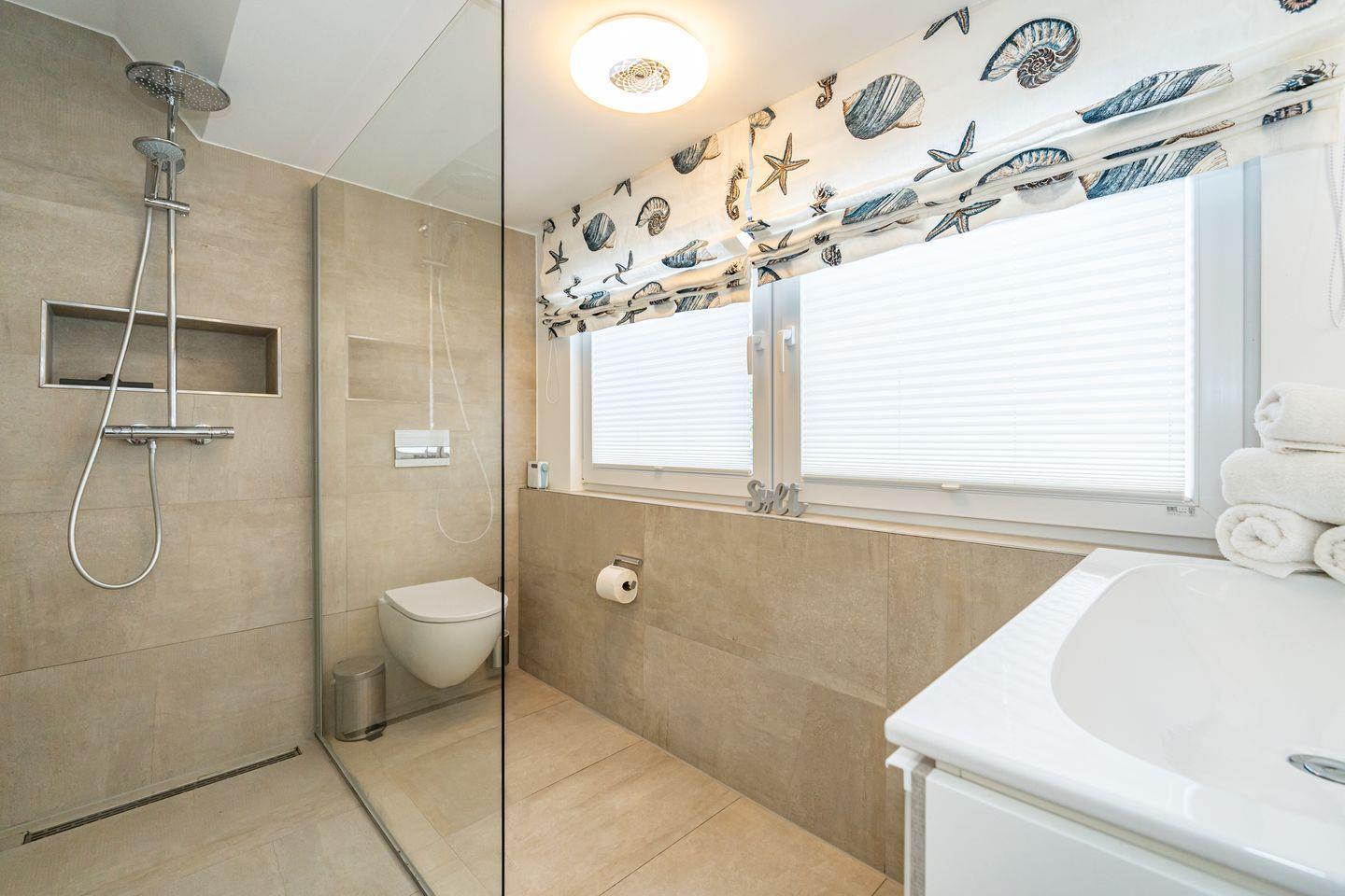 Im Erdgeschoss erwartet Sie ein gemütliches Wohnzimmer, das mit einem großen, rustikalen Esstisch und einer offenen Küche verbunden ist. Hier können Sie gemeinsam kochen und Ihre Mahlzeiten genießen. Der direkte Zugang zur Terrasse mit den hochwertigen Loungemöbeln und dem großzügigen Garten lädt zu entspannten Stunden im Freien ein – ob beim Frühstück in der Morgensonne oder beim Glas Wein am Abend. Die zwei geschmackvoll eingerichteten Schlafzimmer im Obergeschoss bieten Ihnen jeweils ein komfortables Doppelbett für erholsame Nächte. Ein modernes Duschbad sorgt für frische Momente am Morgen, während das separate Gäste-WC im Erdgeschoss zusätzlichen Komfort bietet. Ein weiteres Schlafzimmer mit gemütlichen Einzelbett und viel Stauraum befindet sich im Dachgeschoss dieser Ferienhaushälfte. Im Keller stehen Ihnen eine Waschmaschine und ein Trockner zur Verfügung – praktisch für längere Aufenthalte. Auch Ihr vierbeiniger Freund ist bei uns herzlich willkommen nach vorheriger Anmeldung und gegen Gebühr (10€ pro Nacht/Pro Haustier)! Hunde dürfen sich auf viel Auslauf im Garten freuen.