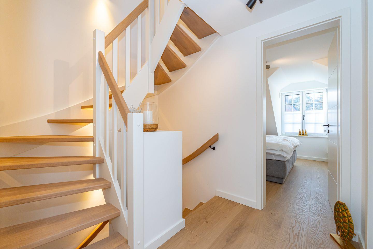 Vom Flur im Erdgeschoss gelangen Sie in den großzügigen Wohn- und Essbereich. Hier erwarten Sie eine gemütliche Couch, ein TV und ein großer Esstisch an dem alle Platz finden. Ein Kamin sorgt an kühleren Tagen für behagliche Wärme und eine einladende Atmosphäre. Von hier aus haben Sie Zutritt zum Garten mit Terrasse. Die offene Küche ist mit modernen Geräten ausgestattet (Herd, Backofen, Geschirrspüler, Weinkühlschrank) und bietet ausreichend Platz für die Zubereitung köstlicher Mahlzeiten. Ebenfalls befindet sich auf dieser Ebene ein Gäste WC. Das Untergeschoss (Souterrain) bietet Ihnen ein Schlafzimmer mit Doppelbett (Boxspringbett) und TV. Auf dieser Ebene erwartet Sie das Badezimmer mit Dusche, separate Badewanne, WC und einer Sauna. Hier können Sie bei einer wohlverdienten Auszeit entspannen. Über eine Treppe gelangen Sie in das erste Obergeschoss, hier gelangen Sie über den Flur in zwei weitere Schlafzimmer, beide verfügen über einen TV. Ein Schlafzimmer verfügt über ein Doppelbett (Boxspringbett) und das andere über ein Einzelbett (Boxspringbett). Auf dieser Ebene befindet sich das zweite Badezimmer mit einer Dusche, WC und Waschbecken. Über eine Treppe gelangen Sie dann in das Dachgeschoss der Ferienhaushälfte, hier befindet sich ein Schlafzimmer mit Doppelbett (Boxspringbett) und TV. Ein Parkplatz befindet sich am Ferienhaus.