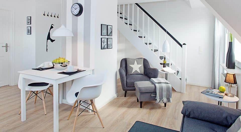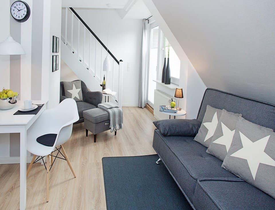 Die Wohnung, die sich im ersten Stock befindet, überzeugt durch eine moderne und einladende Einrichtung. Der offene Wohnbereich ist lichtdurchflutet und schafft eine angenehme Atmosphäre. Hier können Sie es sich auf der Sofaecke gemütlich machen oder den Essbereich mit einem geselligen Abendessen nutzen. Die integrierte, voll ausgestattete Küche lässt keine Wünsche offen. Egal, ob Sie mit Freunden essen oder ein romantisches Dinner zu zweit genießen möchten – die Ausstattung mit Herd, Backofen, Geschirrspüler und Mikrowelle macht das Kochen zum Vergnügen.Eine Holztreppe führt ins Schlafzimmer mit Doppelbett und großzügigen Einbauschränken.